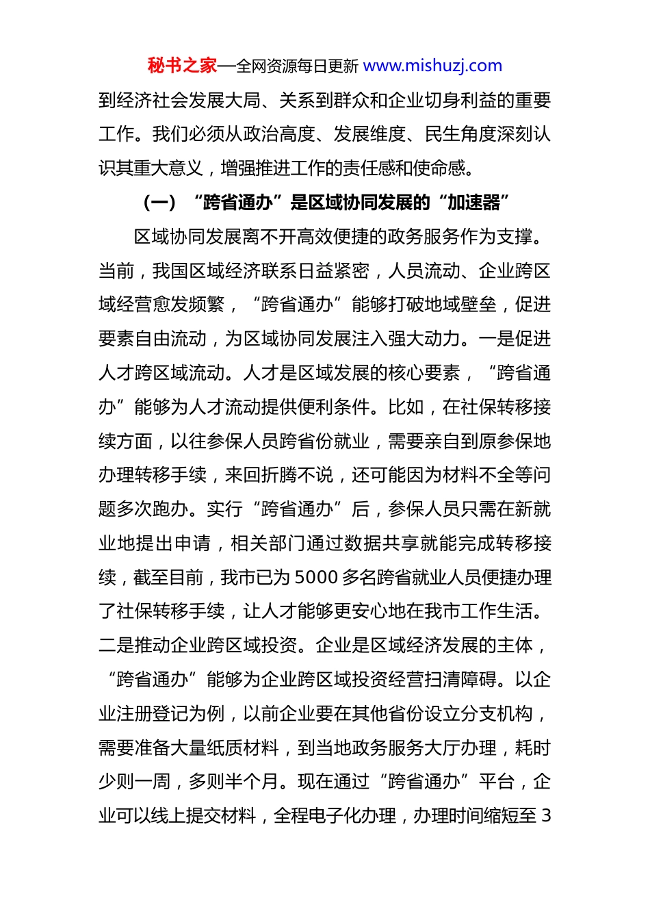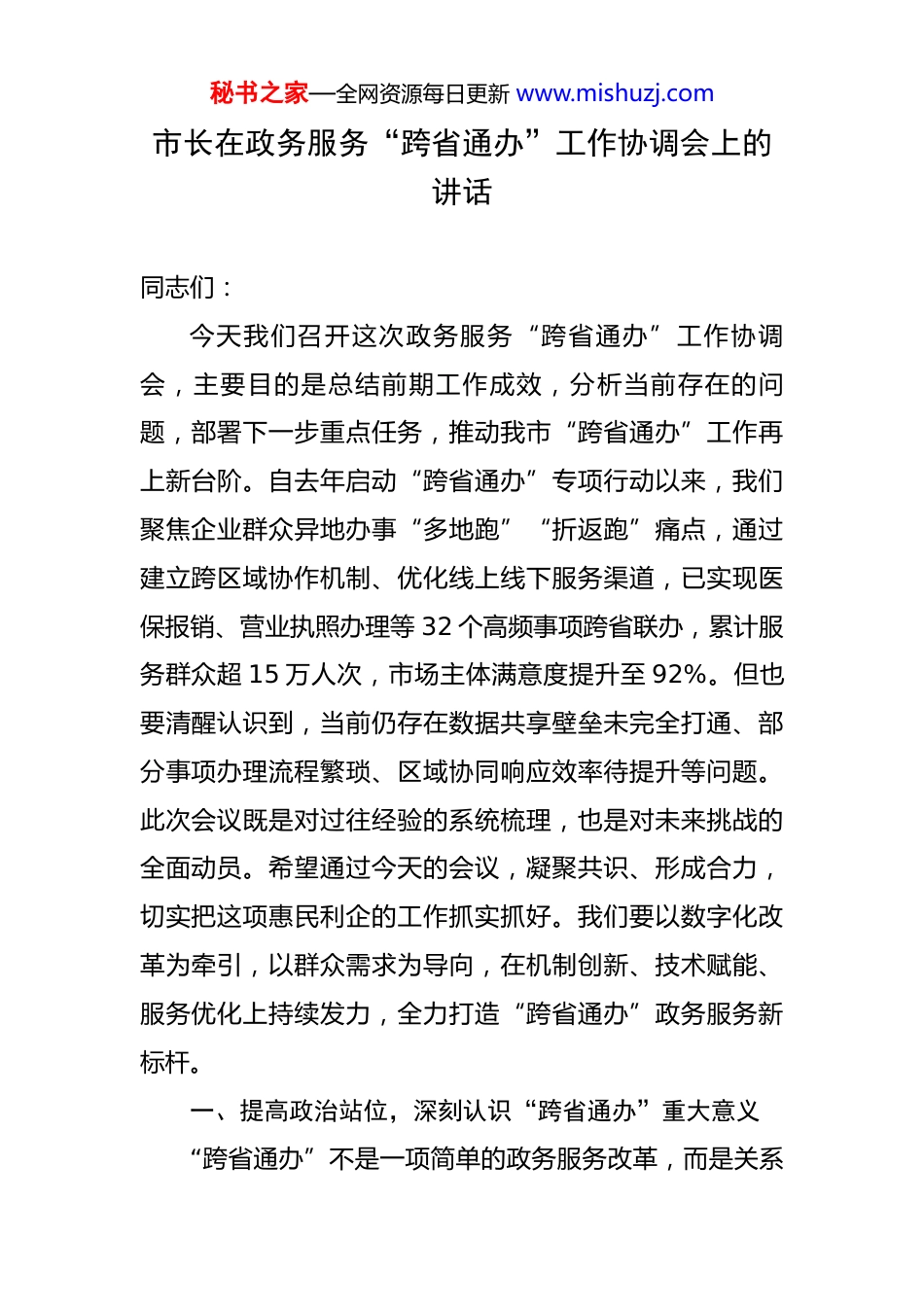 秘书之家—全网资源每日更新 www.mishuzj.com市长在政务服务“跨省通办”工作协调会上的讲话 同志们:今天我们召开这次政务服务“跨省通办”工作协调会,主要目的是总结前期工作成效,分析当前存在的问题,部署下一步重点任务,推动我市“跨省通办”工作再上新台阶。自去年启动“跨省通办”专项行动以来,我们聚焦企业群众异地办事“多地跑”“折返跑”痛点,通过建立跨区域协作机制、优化线上线下服务渠道,已实现医保报销、营业执照办理等 32 个高频事项跨省联办,累计服务群众超 15 万人次,市场主体满意度提升至 92%。但也要清醒认识到,当前仍存在数据共享壁垒未完全打通、部分事项办理流程繁琐、区域协同响应效率待提升等问题。此次会议既是对过往经验的系统梳理,也是对未来挑战的全面动员。希望通过今天的会议,凝聚共识、形成合力,切实把这项惠民利企的工作抓实抓好。我们要以数字化改革为牵引,以群众需求为导向,在机制创新、技术赋能、服务优化上持续发力,全力打造“跨省通办”政务服务新标杆。一、提高政治站位,深刻认识“跨省通办”重大意义“跨省通办”不是一项简单的政务服务改革,而是关系秘书之家—全网资源每日更新 www.mishuzj.com到经济社会发展大局、关系到群众和企业切身利益的重要工作。我们必须从政治高度、发展维度、民生角度深刻认识其重大意义,增强推进工作的责任感和使命感。(一)“跨省通办”是区域协同发展的“加速器”区域协同发展离不开高效便捷的政务服务作为支撑。当前,我国区域经济联系日益紧密,人员流动、企业跨区域经营愈发频繁,“跨省通办”能够打破地域壁垒,促进要素自由流动,为区域协同发展注入强大动力。一是促进人才跨区域流动。人才是区域发展的核心要素,“跨省通办”能够为人才流动提供便利条件。比如,在社保转移接续方面,以往参保人员跨省份就业,需要亲自到原参保地办理转移手续,来回折腾不说,还可能因为材料不全等问题多次跑办。实行“跨省通办”后,参保人员只需在新就业地提出申请,相关部门通过数据共享就能完成转移接续,截至目前,我市已为 5000 多名跨省就业人员便捷办理了社保转移手续,让人才能够更安心地在我市工作生活。二是推动企业跨区域投资。企业是区域经济发展的主体,“跨省通办”能够为企业跨区域投资经营扫清障碍。以企业注册登记为例,以前企业要在其他省份设立分支机构,需要准备大量纸质材料,到当地政务服务大厅办理,耗时少则一周,多则半个月。现在通过“跨省通办”平台,企业可以线上提交材料,全程电子化办理,办理时间缩短至 3秘书之家—全网资源每日更新 www.mishuzj.com个工作日以内。据统计,今年以来,我市已有 300 多家企业通过“跨省通办”在周边省份设立了分支机构,带动了我市与周边地区的经济合作。三是加强区域产业协同。“跨省通办”能够促进区域间产业的互补与融合。我市的装备制造业较为发达,而相邻省份的电子信息产业优势明显,通过“跨省通办”,两地企业在资质认定、项目审批等方面更加便捷,促进了产业链的上下游协作。上半年,我市与相邻省份的产业合作项目达到 50 多个,总投资超过100 亿元。(二)“跨省通办”是优化营商环境的“重头戏”营商环境是一个地区经济发展的“晴雨表”,而政务服务水平是衡量营商环境的重要指标。“跨省通办”作为政务服务改革的重要内容,能够大幅提升政务服务效率和便利度,是优化营商环境的关键举措。一是减少企业办事成本。企业在办理跨省业务时,不仅需要花费时间和精力,还会产生交通、住宿等费用。“跨省通办”推行后,企业可以通过线上平台或就近的政务服务大厅办理业务,避免了跨省奔波。据测算,每家企业办理一项跨省业务平均可节省费用 2000 元以上,每年可为我市企业节省办事成本超过 5000 万元。二是提高政务服务效率。“跨省通办”通过流程再造、数据共享等方式,简化了办事程序,缩短了办理时限。比如,在不动产登记跨省通办方面,以往需秘书之家—全网资源每日更新 www.mishuzj.com要当事人到不动产所在地办理,办理时限长达 15 个工作日,现在通过“跨省通办”,办理时限缩短至 7 个工作...