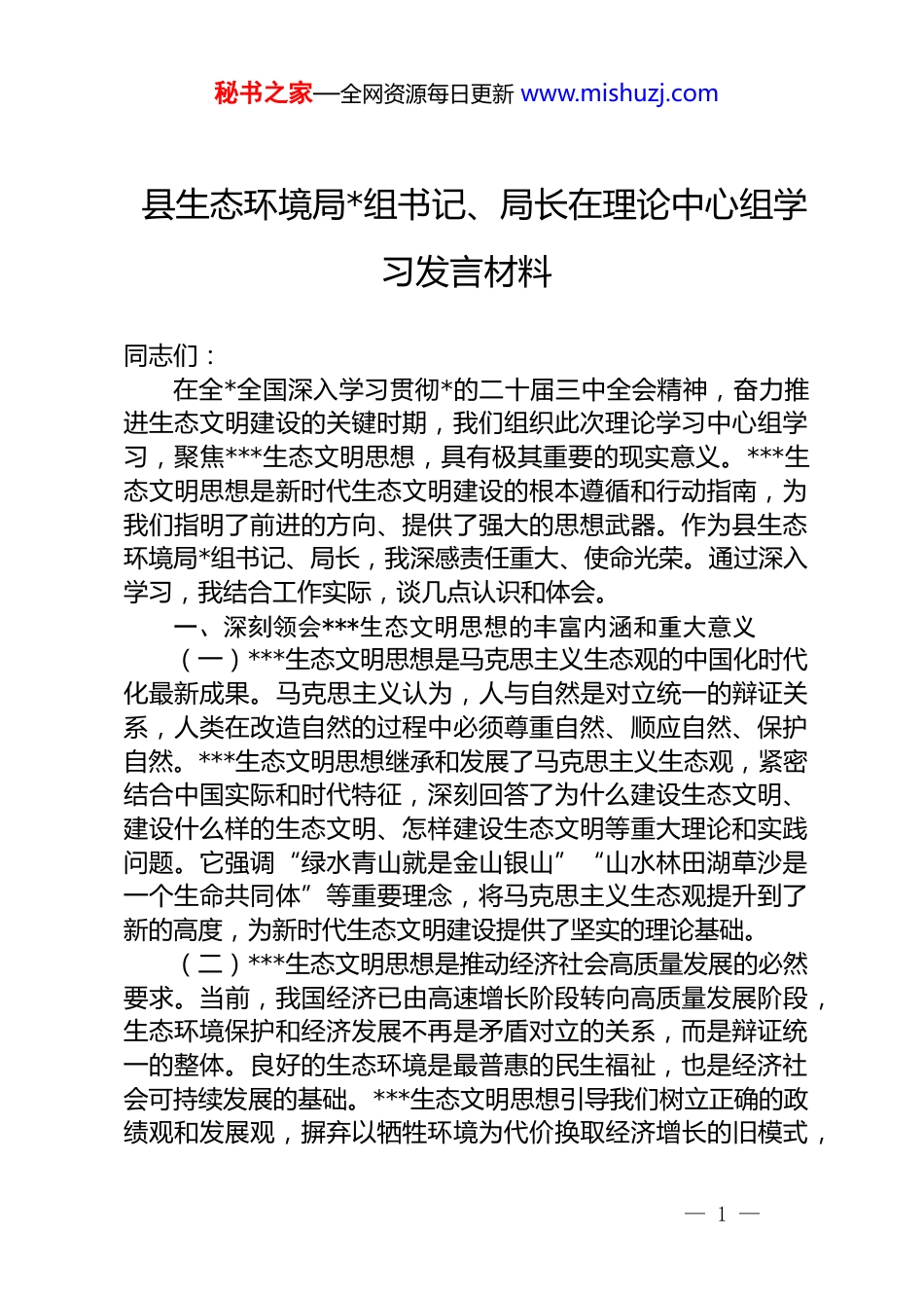 秘书之家—全网资源每日更新 www.mishuzj.com县生态环境局*组书记、局长在理论中心组学习发言材料同志们:在全*全国深入学习贯彻*的二十届三中全会精神,奋力推进生态文明建设的关键时期,我们组织此次理论学习中心组学习,聚焦***生态文明思想,具有极其重要的现实意义。***生态文明思想是新时代生态文明建设的根本遵循和行动指南,为我们指明了前进的方向、提供了强大的思想武器。作为县生态环境局*组书记、局长,我深感责任重大、使命光荣。通过深入学习,我结合工作实际,谈几点认识和体会。一、深刻领会***生态文明思想的丰富内涵和重大意义(一)***生态文明思想是马克思主义生态观的中国化时代化最新成果。马克思主义认为,人与自然是对立统一的辩证关系,人类在改造自然的过程中必须尊重自然、顺应自然、保护自然。***生态文明思想继承和发展了马克思主义生态观,紧密结合中国实际和时代特征,深刻回答了为什么建设生态文明、建设什么样的生态文明、怎样建设生态文明等重大理论和实践问题。它强调“绿水青山就是金山银山”“山水林田湖草沙是一个生命共同体”等重要理念,将马克思主义生态观提升到了新的高度,为新时代生态文明建设提供了坚实的理论基础。(二)***生态文明思想是推动经济社会高质量发展的必然要求。当前,我国经济已由高速增长阶段转向高质量发展阶段,生态环境保护和经济发展不再是矛盾对立的关系,而是辩证统一的整体。良好的生态环境是最普惠的民生福祉,也是经济社会可持续发展的基础。***生态文明思想引导我们树立正确的政绩观和发展观,摒弃以牺牲环境为代价换取经济增长的旧模式,— 1 —秘书之家—全网资源每日更新 www.mishuzj.com走绿色发展之路。通过加强生态环境保护,推动产业结构调整和转型升级,培育新的经济增长点,实现经济发展与生态保护的良性互动,为经济社会高质量发展注入强大动力。(三)***生态文明思想是满足人民群众对美好生活向往的重要保障。随着生活水平的提高,人民群众对优美生态环境的需求越来越迫切。蓝天白云、绿水青山、清新空气成为人们美好生活的重要组成部分。***生态文明坚持以人民为中心的发展思想,把解决突出生态环境问题作为民生优先领域,强调“像保护眼睛一样保护生态环境,像对待生命一样对待生态环境”。通过加强生态环境治理和保护,让人民群众呼吸上新鲜的空气、喝上干净的水、吃上放心的食物,在优美生态环境中生产生活,不断增强人民群众的获得感、幸福感和安全感。二、准确把握我县生态环境保护面临的形势和挑战(一)生态环境质量持续改善但仍需巩固提升。近年来,在县委、县政府的坚强领导下,深入贯彻落实***生态文明思想,加大生态环境保护力度,取得了一系列显著成效。空气质量优良天数比例不断提高,主要河流断面水质稳定达标,土壤环境质量总体安全。我们也清醒地认识到,生态环境质量改善的基础还不稳固,还存在一些薄弱环节和突出问题。部分区域大气污染防治任务依然艰巨,臭氧污染问题逐渐凸显;个别河流断面水质偶尔出现波动,农业面源污染治理还需进一步加强;土壤污染防治工作起步较晚,底数不清、风险管控能力不足等问题亟待解决。(二)产业结构调整和绿色转型面临较大压力。我县产业结构以传统工业和农业为主,高耗能、高污染企业占比较大,产业结构偏重、能源结构偏煤的问题较为突出。在推动产业结构调整和绿色转型过程中,面临着诸多困难和挑战。一方面,部分企业环保意识淡薄,缺乏技术创新和转型升级的动力,对环保投入不足,难以达到环保标准要求;另一方面,新兴产业— 2 —秘书之家—全网资源每日更新 www.mishuzj.com发展相对滞后,缺乏具有带动性的绿色产业项目,难以在短期内形成对传统产业的替代。产业结构调整还涉及到就业、财政收入等社会问题,需要统筹考虑、稳步推进。(三)生态环境监管能力有待进一步提高。随着生态环境保护工作的不断深入,对生态环境监管能力提出了更高的要求。目前,我县生态环境监管能力还存在一些短板和不足。一是监管力量薄弱,人员数量不足,专业素质参差不齐,难以满足日益繁重的监管任务需求;二是监管手段落后,信息化、智能化...
