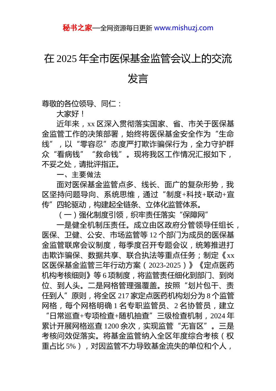 秘书之家—全网资源每日更新 www.mishuzj.com在 2025 年全市医保基金监管会议上的交流发言尊敬的各位领导、同仁:大家好!近年来,xx 区深入贯彻落实国家、省、市关于医保基金监管工作的决策部署,始终将医保基金安全作为“生命线”,以“零容忍”态度严打欺诈骗保行为,全力守护群众“看病钱”“救命钱”。现将我区工作情况汇报如下,不妥之处,请批评指正。一、主要做法面对医保基金监管点多、线长、面广的复杂形势,我区坚持问题导向、系统思维,通过“制度+科技+联动+宣传”四轮驱动,构建起全链条、立体化监管体系。(一)强化制度引领,织牢责任落实“保障网”一是健全机制压责任。成立由区政府分管领导任组长,医保、卫健、公安、市场监管等 12 个部门为成员的医保基金监管联席会议制度,每季度召开专题会议,统筹推进打击欺诈骗保、数据共享、联合执法等重点任务;制定《xx区医保基金监管三年行动方案(2023-2025)》《定点医药机构考核细则》等 6 项制度,将监管责任细化到部门、到岗位、到人头。二是网格管理强覆盖。按照“划片包干、责任到人”原则,将全区 217 家定点医药机构划分为 8 个监管网格,每个网格明确 1 名专职监管员、2 名协管员,建立“日常巡查+专项检查+随机抽查”三级检查机制,2024 年累计开展网格巡查 1200 余次,实现监管“无盲区”。三是考核问效促落实。将基金监管纳入全区年度综合考核(权重占比 5%),对因监管不力导致基金流失的单位和个人,秘书之家—全网资源每日更新 www.mishuzj.com严格落实“一票否决”;2024 年对 3 家考核不合格的定点机构暂停医保结算,约谈负责人 5 人次,倒逼责任落实。(二)强化科技赋能,打造智能监管“新利器”坚持“向科技要效率、向数据要精准”,推动监管从“人工查”向“智能筛”转变。一方面,升级智能审核系统。投入 260 万元建成区级医保智能监管平台,接入国家、省、市三级医保数据中心,设置“药品耗材超量使用”“重复收费”“挂床住院”等 120 条智能审核规则,2024年通过系统预警拦截违规数据 1.2 万条,拒付、追回基金890 万元。另一方面,深化大数据分析应用。建立“异常机构-异常科室-异常医生”三级风险画像模型,对连续 3 个月次均费用、药占比超全区均值 20%的机构,自动触发红黄牌预警;2024 年通过模型锁定高风险机构 15 家,开展专项检查后查实违规金额 320 万元,其中 1 家民营医院因“虚记诊疗项目”被移送司法机关。此外,试点“医保电子凭证+人脸识别”核验系统,在 5 家二级以上医院部署终端设备,2024 年拦截冒名就医行为 23 起,涉及金额 1.8 万元。(三)强化部门联动,形成齐抓共管“大格局”坚持“内外协同、上下贯通”,推动监管从“单兵作战”向“联合作战”升级。对内,建立医保、卫健、市场监管“三部门联合查房”机制,2024 年开展联合检查 42 次,重点核查“过度诊疗”“串换药品”等问题,查处违规机构 11 家。对外,与公安部门建立“行刑衔接”快速响应机制,设立医保案件侦查专班,2024 年移送涉嫌诈骗案件 5起,刑事拘留 7 人;与审计部门联合开展基金使用专项审计,追回违规资金 160 万元。同时,畅通群众举报渠道,完善“线索移交-快速核查-结果反馈”闭环流程,2024 年受理群众举报线索 47 条,查实 19 条,发放举报奖励 12 万元,形成“人人参与监督”的良好氛围。(四)强化宣传引导,树牢合规用保“风向标”坚持“教育在先、警示在前”,推动监管从“事后处秘书之家—全网资源每日更新 www.mishuzj.com罚”向“事前预防”延伸。一方面,开展“精准普法”。针对定点机构,组织“医保政策进机构”培训 28 场,覆盖医务人员、管理人员 1500 余人次;针对参保群众,通过“医保课堂”“社区宣讲”等形式,普及《医疗保障基金使用监督管理条例》,2024 年发放宣传资料 3.2 万份,覆盖群众 12 万人次。另一方面,强化“以案示警”。选取“虚构住院”“虚假开药”等典型案例,通过区政府网站、微信公众号等平台曝光 12 起,制作《医保基金安全警示片》在定点机构循环播放;对 2 ...