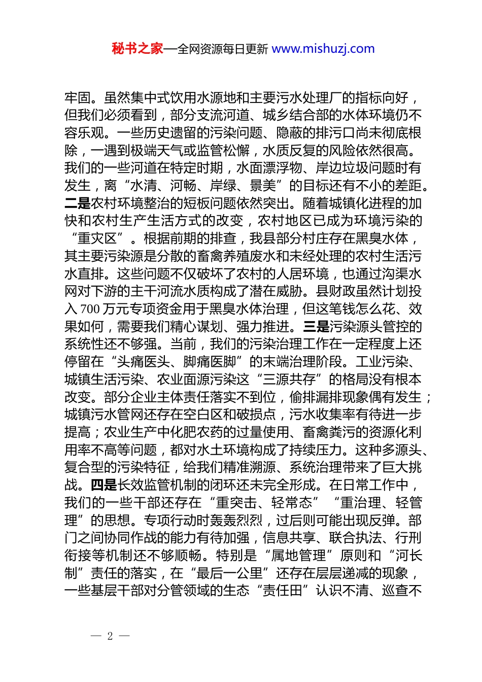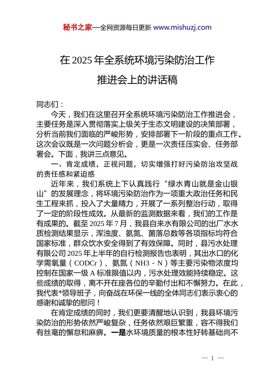 秘书之家—全网资源每日更新 www.mishuzj.com在 2025 年全系统环境污染防治工作推进会上的讲话稿同志们:今天,我们在这里召开全系统环境污染防治工作推进会,主要任务是深入贯彻落实上级关于生态文明建设的决策部署,分析当前我们面临的严峻形势,安排部署下一阶段的重点工作。这次会议既是一次问题分析会,更是一次责任压实会、任务部署会。下面,我讲三点意见。一、肯定成绩,正视问题,切实增强打好污染防治攻坚战的责任感和紧迫感近年来,我们系统上下认真践行“绿水青山就是金山银山”的发展理念,将环境污染防治作为一项重大政治任务和民生工程来抓,投入了大量精力,开展了一系列整治行动,取得了一定的阶段性成效。从最新的监测数据来看,我们的工作是有成果的。截至 2025 年 7 月,我县自来水有限公司的出厂水水质检测结果显示,浑浊度、氨氮、菌落总数等各项指标均符合国家标准,群众饮水安全得到了有效保障。同时,县污水处理有限公司 2025 年上半年的自行检测报告也表明,其出水口的化学需氧量(CODCr)、氨氮(NH3-N)等主要污染物浓度均控制在国家一级 A 标准限值以内,污水处理效能持续稳定。这些成绩的取得,离不开在座各位的辛勤付出和不懈努力。在此,我代表*领导班子,向奋战在环保一线的全体同志们表示衷心的感谢和诚挚的慰问!在肯定成绩的同时,我们更要清醒地认识到,我县环境污染防治的形势依然严峻复杂,任务依然艰巨繁重,容不得我们有丝毫的懈怠和麻痹。一是水环境质量的根本性好转基础尚不— 1 —秘书之家—全网资源每日更新 www.mishuzj.com牢固。虽然集中式饮用水源地和主要污水处理厂的指标向好,但我们必须看到,部分支流河道、城乡结合部的水体环境仍不容乐观。一些历史遗留的污染问题、隐蔽的排污口尚未彻底根除,一遇到极端天气或监管松懈,水质反复的风险依然很高。我们的一些河道在特定时期,水面漂浮物、岸边垃圾问题时有发生,离“水清、河畅、岸绿、景美”的目标还有不小的差距。二是农村环境整治的短板问题依然突出。随着城镇化进程的加快和农村生产生活方式的改变,农村地区已成为环境污染的“重灾区”。根据前期的排查,我县部分村庄存在黑臭水体,其主要污染源是分散的畜禽养殖废水和未经处理的农村生活污水直排。这些问题不仅破坏了农村的人居环境,也通过沟渠水网对下游的主干河流水质构成了潜在威胁。县财政虽然计划投入 700 万元专项资金用于黑臭水体治理,但这笔钱怎么花、效果如何,需要我们精心谋划、强力推进。三是污染源头管控的系统性还不够强。当前,我们的污染治理工作在一定程度上还停留在“头痛医头、脚痛医脚”的末端治理阶段。工业污染、城镇生活污染、农业面源污染这“三源共存”的格局没有根本改变。部分企业主体责任落实不到位,偷排漏排现象偶有发生;城镇污水管网还存在空白区和破损点,污水收集率有待进一步提高;农业生产中化肥农药的过量使用、畜禽粪污的资源化利用率不高等问题,都对水土环境构成了持续压力。这种多源头、复合型的污染特征,给我们精准溯源、系统治理带来了巨大挑战。四是长效监管机制的闭环还未完全形成。在日常工作中,我们的一些干部还存在“重突击、轻常态”“重治理、轻管理”的思想。专项行动时轰轰烈烈,过后则可能出现反弹。部门之间协同作战的能力有待加强,信息共享、联合执法、行刑衔接等机制还不够顺畅。特别是“属地管理”原则和“河长制”责任的落实,在“最后一公里”还存在层层递减的现象,一些基层干部对分管领域的生态“责任田”认识不清、巡查不— 2 —秘书之家—全网资源每日更新 www.mishuzj.com勤、处置不力。同志们,生态环境问题归根到底是发展方式问题。我们面临的这些问题,既有历史积累的沉疴,也有发展过程中出现的新疾。我们必须站在对历史负责、对人民负责、对未来负责的高度,深刻认识环境污染防治工作的极端重要性、现实紧迫性和任务艰巨性,以“等不起”的紧迫感、“慢不得”的危机感、“坐不住”的责任感,坚决扛起生态文明建设的政治责任。二、明确目标,突出重点,以决战决胜之姿全面打响水环境治理总攻战打好污染防治攻坚战,是...