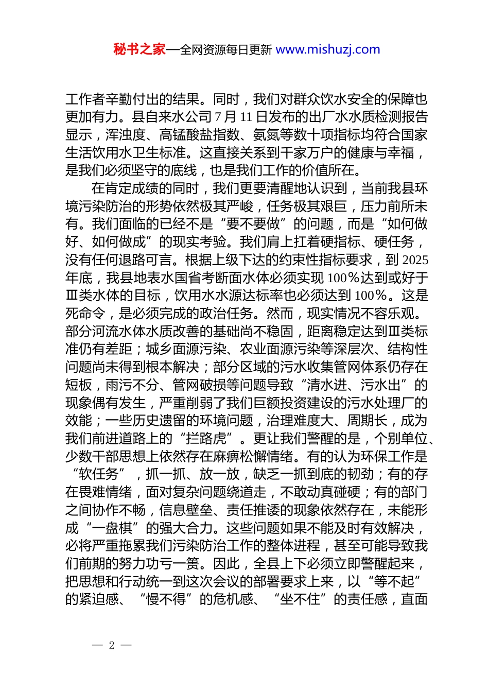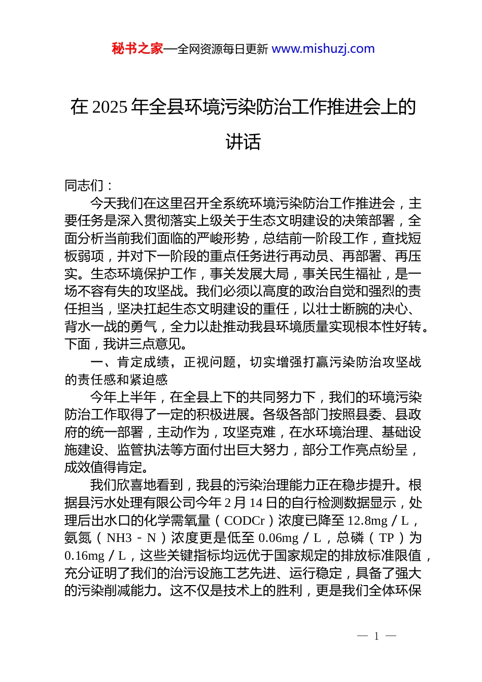 秘书之家—全网资源每日更新 www.mishuzj.com在 2025 年全县环境污染防治工作推进会上的讲话同志们:今天我们在这里召开全系统环境污染防治工作推进会,主要任务是深入贯彻落实上级关于生态文明建设的决策部署,全面分析当前我们面临的严峻形势,总结前一阶段工作,查找短板弱项,并对下一阶段的重点任务进行再动员、再部署、再压实。生态环境保护工作,事关发展大局,事关民生福祉,是一场不容有失的攻坚战。我们必须以高度的政治自觉和强烈的责任担当,坚决扛起生态文明建设的重任,以壮士断腕的决心、背水一战的勇气,全力以赴推动我县环境质量实现根本性好转。下面,我讲三点意见。一、肯定成绩,正视问题,切实增强打赢污染防治攻坚战的责任感和紧迫感今年上半年,在全县上下的共同努力下,我们的环境污染防治工作取得了一定的积极进展。各级各部门按照县委、县政府的统一部署,主动作为,攻坚克难,在水环境治理、基础设施建设、监管执法等方面付出巨大努力,部分工作亮点纷呈,成效值得肯定。我们欣喜地看到,我县的污染治理能力正在稳步提升。根据县污水处理有限公司今年 2 月 14 日的自行检测数据显示,处理后出水口的化学需氧量(CODCr)浓度已降至 12.8mg/L,氨氮(NH3-N)浓度更是低至 0.06mg/L,总磷(TP)为0.16mg/L,这些关键指标均远优于国家规定的排放标准限值,充分证明了我们的治污设施工艺先进、运行稳定,具备了强大的污染削减能力。这不仅是技术上的胜利,更是我们全体环保— 1 —秘书之家—全网资源每日更新 www.mishuzj.com工作者辛勤付出的结果。同时,我们对群众饮水安全的保障也更加有力。县自来水公司 7 月 11 日发布的出厂水水质检测报告显示,浑浊度、高锰酸盐指数、氨氮等数十项指标均符合国家生活饮用水卫生标准。这直接关系到千家万户的健康与幸福,是我们必须坚守的底线,也是我们工作的价值所在。在肯定成绩的同时,我们更要清醒地认识到,当前我县环境污染防治的形势依然极其严峻,任务极其艰巨,压力前所未有。我们面临的已经不是“要不要做”的问题,而是“如何做好、如何做成”的现实考验。我们肩上扛着硬指标、硬任务,没有任何退路可言。根据上级下达的约束性指标要求,到 2025年底,我县地表水国省考断面水体必须实现 100%达到或好于Ⅲ类水体的目标,饮用水水源达标率也必须达到 100%。这是死命令,是必须完成的政治任务。然而,现实情况不容乐观。部分河流水体水质改善的基础尚不稳固,距离稳定达到Ⅲ类标准仍有差距;城乡面源污染、农业面源污染等深层次、结构性问题尚未得到根本解决;部分区域的污水收集管网体系仍存在短板,雨污不分、管网破损等问题导致“清水进、污水出”的现象偶有发生,严重削弱了我们巨额投资建设的污水处理厂的效能;一些历史遗留的环境问题,治理难度大、周期长,成为我们前进道路上的“拦路虎”。更让我们警醒的是,个别单位、少数干部思想上依然存在麻痹松懈情绪。有的认为环保工作是“软任务”,抓一抓、放一放,缺乏一抓到底的韧劲;有的存在畏难情绪,面对复杂问题绕道走,不敢动真碰硬;有的部门之间协作不畅,信息壁垒、责任推诿的现象依然存在,未能形成“一盘棋”的强大合力。这些问题如果不能及时有效解决,必将严重拖累我们污染防治工作的整体进程,甚至可能导致我们前期的努力功亏一篑。因此,全县上下必须立即警醒起来,把思想和行动统一到这次会议的部署要求上来,以“等不起”的紧迫感、“慢不得”的危机感、“坐不住”的责任感,直面— 2 —秘书之家—全网资源每日更新 www.mishuzj.com问题、迎难而上,坚决打赢这场输不起的攻坚战。二、聚焦重点,精准施策,全面提升环境污染综合治理能力和水平打好污染防治攻坚战,不能“胡子眉毛一把抓”,必须坚持问题导向、目标导向、结果导向,抓住主要矛盾和矛盾的主要方面,集中力量,精准发力,在关键环节和重点领域实现新突破。(一)聚焦源头管控,在基础设施建设上实现新突破。治污之要,在于源头。没有完善的基础设施,污染治理就是无源之水、无本之木。我们必须把基础设施建设作为污染防治的“生命线工程”,下...