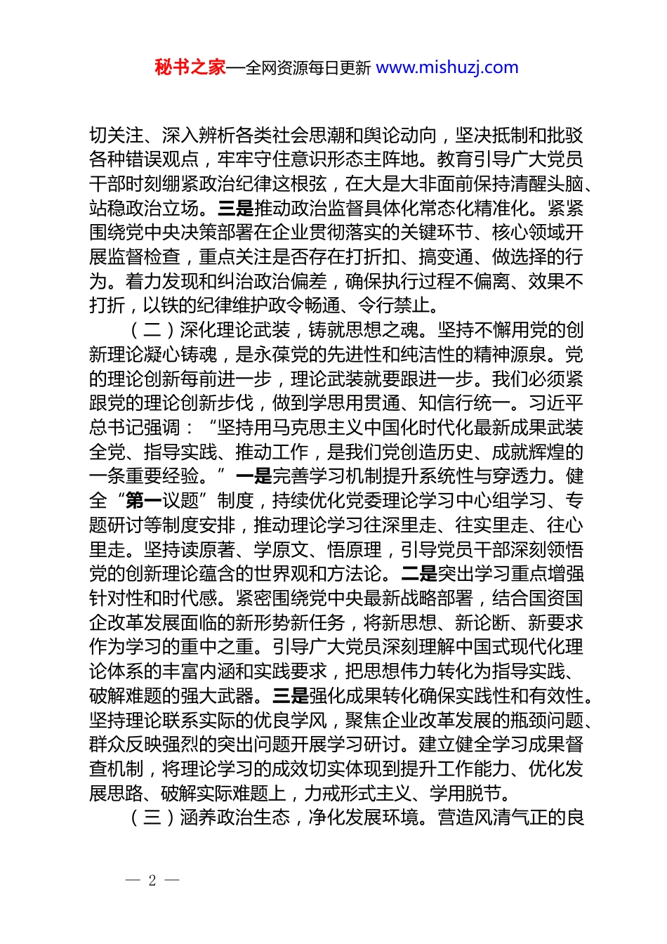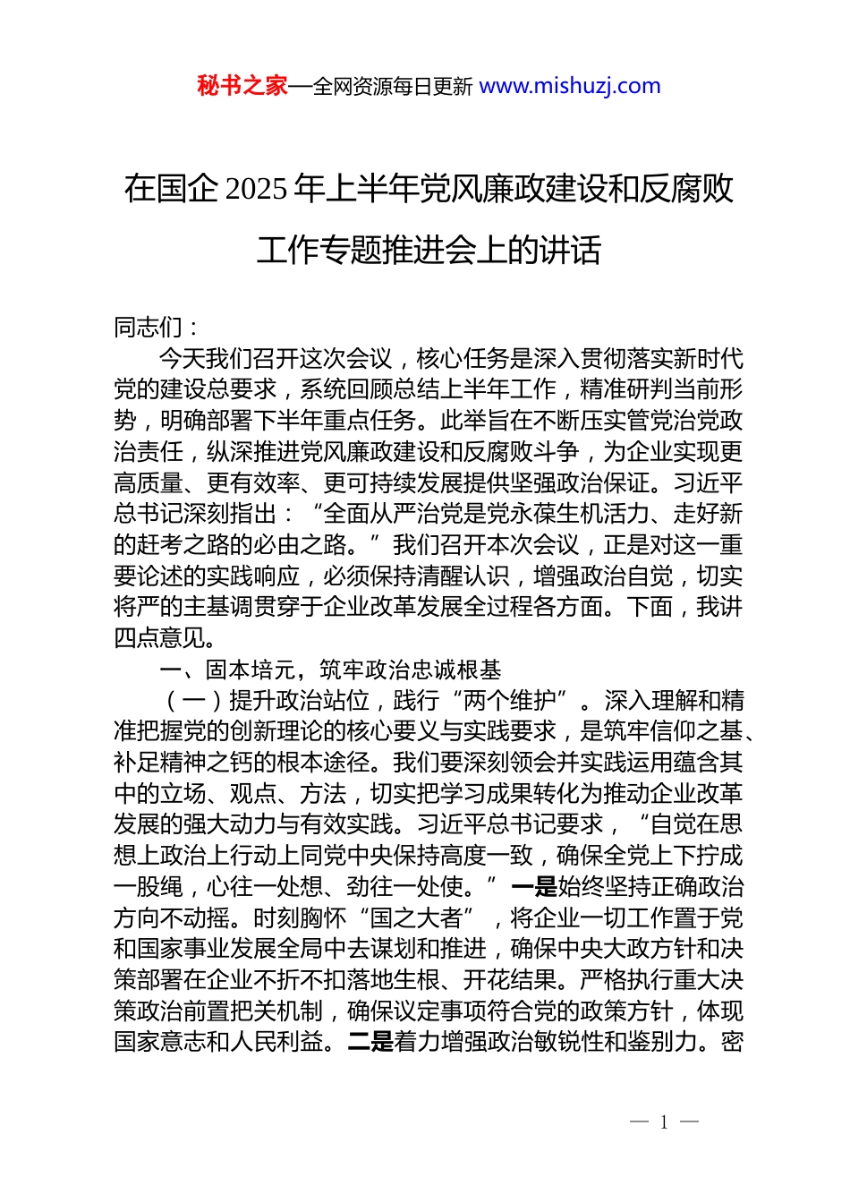 秘书之家—全网资源每日更新 www.mishuzj.com在国企 2025 年上半年党风廉政建设和反腐败工作专题推进会上的讲话同志们:今天我们召开这次会议,核心任务是深入贯彻落实新时代党的建设总要求,系统回顾总结上半年工作,精准研判当前形势,明确部署下半年重点任务。此举旨在不断压实管党治党政治责任,纵深推进党风廉政建设和反腐败斗争,为企业实现更高质量、更有效率、更可持续发展提供坚强政治保证。习近平总书记深刻指出:“全面从严治党是党永葆生机活力、走好新的赶考之路的必由之路。”我们召开本次会议,正是对这一重要论述的实践响应,必须保持清醒认识,增强政治自觉,切实将严的主基调贯穿于企业改革发展全过程各方面。下面,我讲四点意见。一、固本培元,筑牢政治忠诚根基(一)提升政治站位,践行“两个维护”。深入理解和精准把握党的创新理论的核心要义与实践要求,是筑牢信仰之基、补足精神之钙的根本途径。我们要深刻领会并实践运用蕴含其中的立场、观点、方法,切实把学习成果转化为推动企业改革发展的强大动力与有效实践。习近平总书记要求,“自觉在思想上政治上行动上同党中央保持高度一致,确保全党上下拧成一股绳,心往一处想、劲往一处使。”一是始终坚持正确政治方向不动摇。时刻胸怀“国之大者”,将企业一切工作置于党和国家事业发展全局中去谋划和推进,确保中央大政方针和决策部署在企业不折不扣落地生根、开花结果。严格执行重大决策政治前置把关机制,确保议定事项符合党的政策方针,体现国家意志和人民利益。二是着力增强政治敏锐性和鉴别力。密— 1 —秘书之家—全网资源每日更新 www.mishuzj.com切关注、深入辨析各类社会思潮和舆论动向,坚决抵制和批驳各种错误观点,牢牢守住意识形态主阵地。教育引导广大党员干部时刻绷紧政治纪律这根弦,在大是大非面前保持清醒头脑、站稳政治立场。三是推动政治监督具体化常态化精准化。紧紧围绕党中央决策部署在企业贯彻落实的关键环节、核心领域开展监督检查,重点关注是否存在打折扣、搞变通、做选择的行为。着力发现和纠治政治偏差,确保执行过程不偏离、效果不打折,以铁的纪律维护政令畅通、令行禁止。(二)深化理论武装,铸就思想之魂。坚持不懈用党的创新理论凝心铸魂,是永葆党的先进性和纯洁性的精神源泉。党的理论创新每前进一步,理论武装就要跟进一步。我们必须紧跟党的理论创新步伐,做到学思用贯通、知信行统一。习近平总书记强调:“坚持用马克思主义中国化时代化最新成果武装全党、指导实践、推动工作,是我们党创造历史、成就辉煌的一条重要经验。”一是完善学习机制提升系统性与穿透力。健全“第一议题”制度,持续优化党委理论学习中心组学习、专题研讨等制度安排,推动理论学习往深里走、往实里走、往心里走。坚持读原著、学原文、悟原理,引导党员干部深刻领悟党的创新理论蕴含的世界观和方法论。二是突出学习重点增强针对性和时代感。紧密围绕党中央最新战略部署,结合国资国企改革发展面临的新形势新任务,将新思想、新论断、新要求作为学习的重中之重。引导广大党员深刻理解中国式现代化理论体系的丰富内涵和实践要求,把思想伟力转化为指导实践、破解难题的强大武器。三是强化成果转化确保实践性和有效性。坚持理论联系实际的优良学风,聚焦企业改革发展的瓶颈问题、群众反映强烈的突出问题开展学习研讨。建立健全学习成果督查机制,将理论学习的成效切实体现到提升工作能力、优化发展思路、破解实际难题上,力戒形式主义、学用脱节。(三)涵养政治生态,净化发展环境。营造风清气正的良— 2 —秘书之家—全网资源每日更新 www.mishuzj.com好政治生态,是锻造坚强有力党组织、确保企业健康发展的基础保障。政治生态是检验管党治党是否有力的重要标尺。我们必须坚持激浊扬清、扶正祛邪,使企业内部形成清清爽爽的同志关系、规规矩矩的上下级关系、干干净净的政商关系。正如习近平总书记所指出的:“加强党的建设,必须营造一个良好从政环境,也就是要有一个好的政治生态。”要着重做好以下工作:一是严肃党内政治生活锤炼坚强党性。严格执行党章和新形势下党内政治生活...