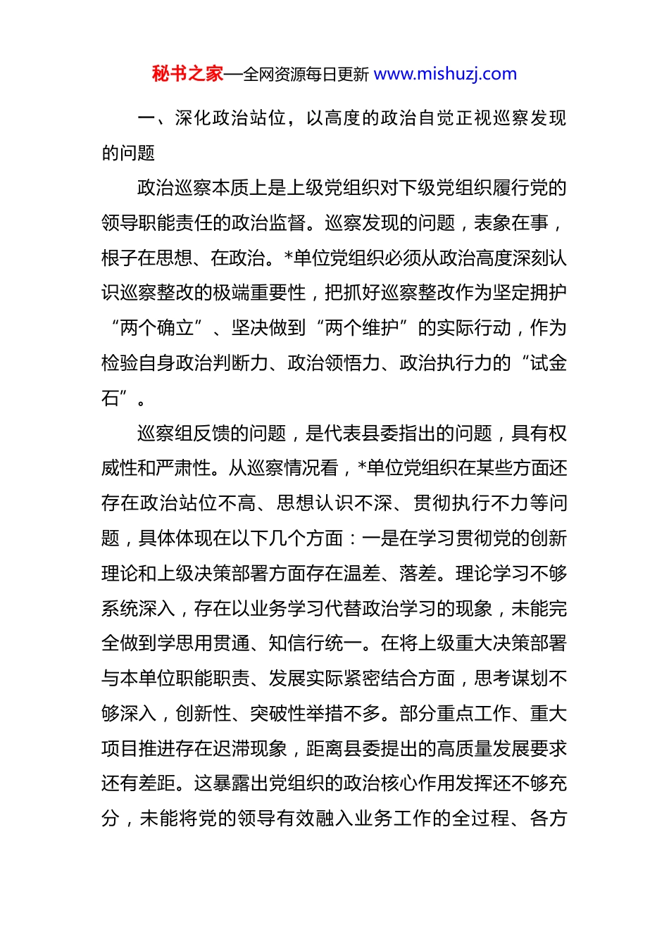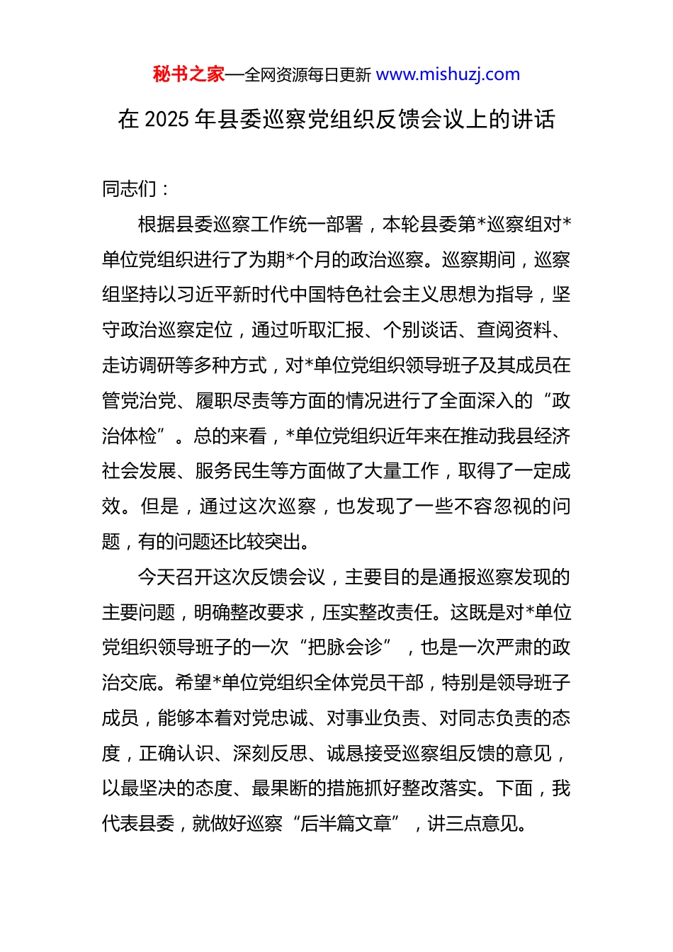 秘书之家—全网资源每日更新 www.mishuzj.com在 2025 年县委巡察党组织反馈会议上的讲话 同志们:根据县委巡察工作统一部署,本轮县委第*巡察组对*单位党组织进行了为期*个月的政治巡察。巡察期间,巡察组坚持以习近平新时代中国特色社会主义思想为指导,坚守政治巡察定位,通过听取汇报、个别谈话、查阅资料、走访调研等多种方式,对*单位党组织领导班子及其成员在管党治党、履职尽责等方面的情况进行了全面深入的“政治体检”。总的来看,*单位党组织近年来在推动我县经济社会发展、服务民生等方面做了大量工作,取得了一定成效。但是,通过这次巡察,也发现了一些不容忽视的问题,有的问题还比较突出。今天召开这次反馈会议,主要目的是通报巡察发现的主要问题,明确整改要求,压实整改责任。这既是对*单位党组织领导班子的一次“把脉会诊”,也是一次严肃的政治交底。希望*单位党组织全体党员干部,特别是领导班子成员,能够本着对党忠诚、对事业负责、对同志负责的态度,正确认识、深刻反思、诚恳接受巡察组反馈的意见,以最坚决的态度、最果断的措施抓好整改落实。下面,我代表县委,就做好巡察“后半篇文章”,讲三点意见。秘书之家—全网资源每日更新 www.mishuzj.com一、深化政治站位,以高度的政治自觉正视巡察发现的问题政治巡察本质上是上级党组织对下级党组织履行党的领导职能责任的政治监督。巡察发现的问题,表象在事,根子在思想、在政治。*单位党组织必须从政治高度深刻认识巡察整改的极端重要性,把抓好巡察整改作为坚定拥护“两个确立”、坚决做到“两个维护”的实际行动,作为检验自身政治判断力、政治领悟力、政治执行力的“试金石”。巡察组反馈的问题,是代表县委指出的问题,具有权威性和严肃性。从巡察情况看,*单位党组织在某些方面还存在政治站位不高、思想认识不深、贯彻执行不力等问题,具体体现在以下几个方面:一是在学习贯彻党的创新理论和上级决策部署方面存在温差、落差。理论学习不够系统深入,存在以业务学习代替政治学习的现象,未能完全做到学思用贯通、知信行统一。在将上级重大决策部署与本单位职能职责、发展实际紧密结合方面,思考谋划不够深入,创新性、突破性举措不多。部分重点工作、重大项目推进存在迟滞现象,距离县委提出的高质量发展要求还有差距。这暴露出党组织的政治核心作用发挥还不够充分,未能将党的领导有效融入业务工作的全过程、各方秘书之家—全网资源每日更新 www.mishuzj.com面。二是在聚焦主责主业、服务中心大局方面存在短板、弱项。部分干部缺乏“功成不必在我、功成必定有我”的担当精神,面对改革发展中的难点、堵点问题,存在畏难情绪和“等靠要”思想。干事创业的精气神有所衰减,工作标准不高,满足于“过得去”,缺乏“争一流”的劲头。风险防范意识有待加强,对本领域存在的廉政风险、安全风险、意识形态风险等排查不够彻底,预警和应对机制不够健全。这说明一些干部还没有完全树立正确的政绩观,未能将本单位工作置于全县发展大局中去考量和推动。三是践行以人民为中心的发展思想存在偏差、不足。对群众的急难愁盼问题,有时了解不够及时、解决不够彻底。一些涉及民生的政策落实、项目推进,虽然程序上完成了,但实际效果与群众期盼还有距离,群众的获得感、幸福感、安全感有待进一步提升。工作作风不够扎实,存在一定程度的形式主义、官僚主义问题,下基层调研“走马观花”,解决实际问题“蜻蜓点水”,没有真正沉下去、接地气。这反映出我们一些同志的群众观念树得不牢,服务宗旨意识有所淡化。四是落实全面从严治党“两个责任”存在压力传导层层递减现象。党组织主体责任扛得不够牢,对党风廉政建设和反腐败工作研究部署多,但跟踪问效、督促检查少。党组织书记作为“第一责任秘书之家—全网资源每日更新 www.mishuzj.com人”,在抓班子、带队伍上失之于宽、失之于软,对一些苗头性、倾向性问题提醒、批评不够。纪检监察机构的监督责任落实不够到位,日常监督偏软,运用“四种形态”特别是第一种形态不够充分,抓早抓小、防微杜渐的作用没有完全发挥出来。此外,在干部队伍建设、基层党组织建...