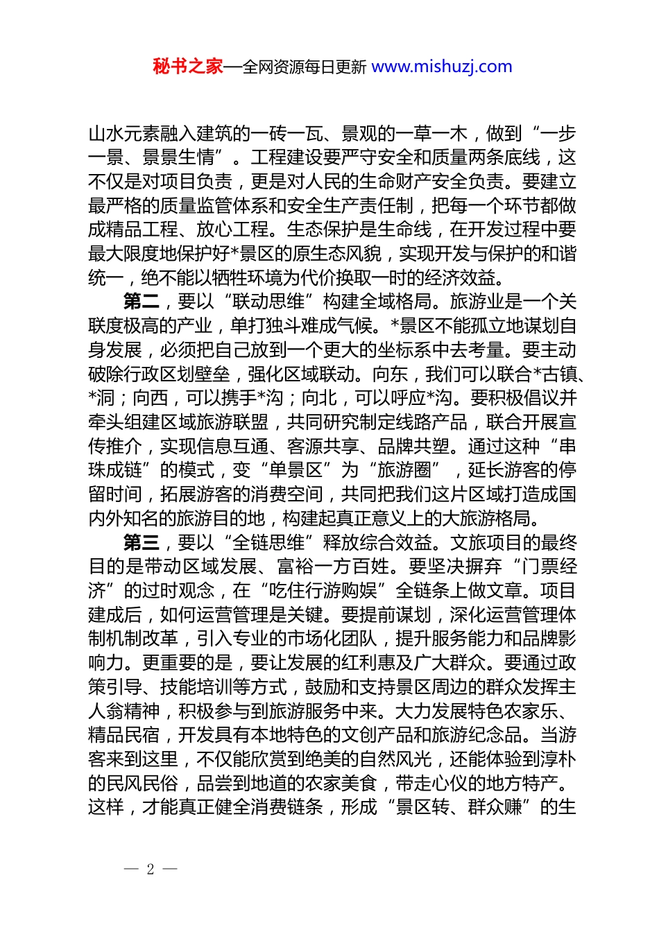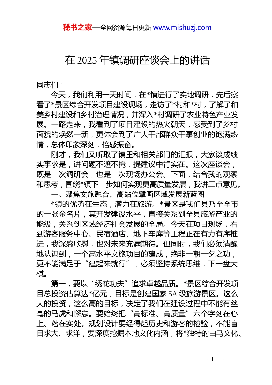 秘书之家—全网资源每日更新 www.mishuzj.com在 2025 年镇调研座谈会上的讲话同志们:今天,我们利用一天时间,在*镇进行了实地调研,先后察看了*景区综合开发项目建设现场,走访了*村和*村,了解了和美乡村建设和乡村治理情况,并深入*村调研了农业特色产业发展。一路走来,我看到了项目建设的热火朝天,感受到了乡村面貌的焕然一新,更体会到了广大干部群众干事创业的饱满热情,总体印象深刻,倍感振奋。刚才,我们又听取了镇里和相关部门的汇报,大家谈成绩实事求是,讲问题不遮不掩,提建议中肯实在。这次座谈会,既是一次调研会,也是一次现场办公会。下面,结合我的观察和思考,围绕*镇下一步如何实现更高质量发展,我讲三点意见。一、聚焦文旅融合,高站位擘画区域发展新蓝图*镇的优势在生态,潜力在旅游。*景区是我们县乃至全市的一张金名片,其开发建设水平,直接关系到全县旅游产业的能级,关系到区域经济社会发展的全局。今天在项目现场,看到游客服务中心、民宿酒店、地下车库等工程正在有力有序推进,我深感欣慰,也对未来充满期待。但同时,我们必须清醒地认识到,一个高水平文旅项目的建成,绝非一朝一夕之功,更不能满足于“建起来就行”,必须坚持系统思维,下一盘大棋。第一,要以“绣花功夫”追求卓越品质。*景区综合开发项目总投资估算达*亿元,目标是创建国家 5A 级旅游景区。这么大的投资,这么高的目标,决定了我们在建设过程中不能有丝毫的马虎和懈怠。要始终把“高标准、高质量”六个字刻在心上、落在实处。规划设计要经得起历史和游客的检验,不能盲目求大、求洋,要深度挖掘本地文化内涵,将*独特的白马文化、— 1 —秘书之家—全网资源每日更新 www.mishuzj.com山水元素融入建筑的一砖一瓦、景观的一草一木,做到“一步一景、景景生情”。工程建设要严守安全和质量两条底线,这不仅是对项目负责,更是对人民的生命财产安全负责。要建立最严格的质量监管体系和安全生产责任制,把每一个环节都做成精品工程、放心工程。生态保护是生命线,在开发过程中要最大限度地保护好*景区的原生态风貌,实现开发与保护的和谐统一,绝不能以牺牲环境为代价换取一时的经济效益。第二,要以“联动思维”构建全域格局。旅游业是一个关联度极高的产业,单打独斗难成气候。*景区不能孤立地谋划自身发展,必须把自己放到一个更大的坐标系中去考量。要主动破除行政区划壁垒,强化区域联动。向东,我们可以联合*古镇、*洞;向西,可以携手*沟;向北,可以呼应*沟。要积极倡议并牵头组建区域旅游联盟,共同研究制定线路产品,联合开展宣传推介,实现信息互通、客源共享、品牌共塑。通过这种“串珠成链”的模式,变“单景区”为“旅游圈”,延长游客的停留时间,拓展游客的消费空间,共同把我们这片区域打造成国内外知名的旅游目的地,构建起真正意义上的大旅游格局。第三,要以“全链思维”释放综合效益。文旅项目的最终目的是带动区域发展、富裕一方百姓。要坚决摒弃“门票经济”的过时观念,在“吃住行游购娱”全链条上做文章。项目建成后,如何运营管理是关键。要提前谋划,深化运营管理体制机制改革,引入专业的市场化团队,提升服务能力和品牌影响力。更重要的是,要让发展的红利惠及广大群众。要通过政策引导、技能培训等方式,鼓励和支持景区周边的群众发挥主人翁精神,积极参与到旅游服务中来。大力发展特色农家乐、精品民宿,开发具有本地特色的文创产品和旅游纪念品。当游客来到这里,不仅能欣赏到绝美的自然风光,还能体验到淳朴的民风民俗,品尝到地道的农家美食,带走心仪的地方特产。这样,才能真正健全消费链条,形成“景区转、群众赚”的生— 2 —秘书之家—全网资源每日更新 www.mishuzj.com动局面,释放“一业兴、百业旺”的乘数效应。二、立足和美善治,高标准筑牢乡村振兴新基石如果说文旅项目是拉动*镇发展的强大引擎,那么和美乡村建设就是保障这台引擎平稳运行的坚实底盘。在*村和*村,我看到了干净整洁的村道、错落有致的民居、精神饱满的村民,这充分说明我们前期的工作是扎实有效的。建设宜居宜业和美乡村,是一项永不竣工的民生工程,...