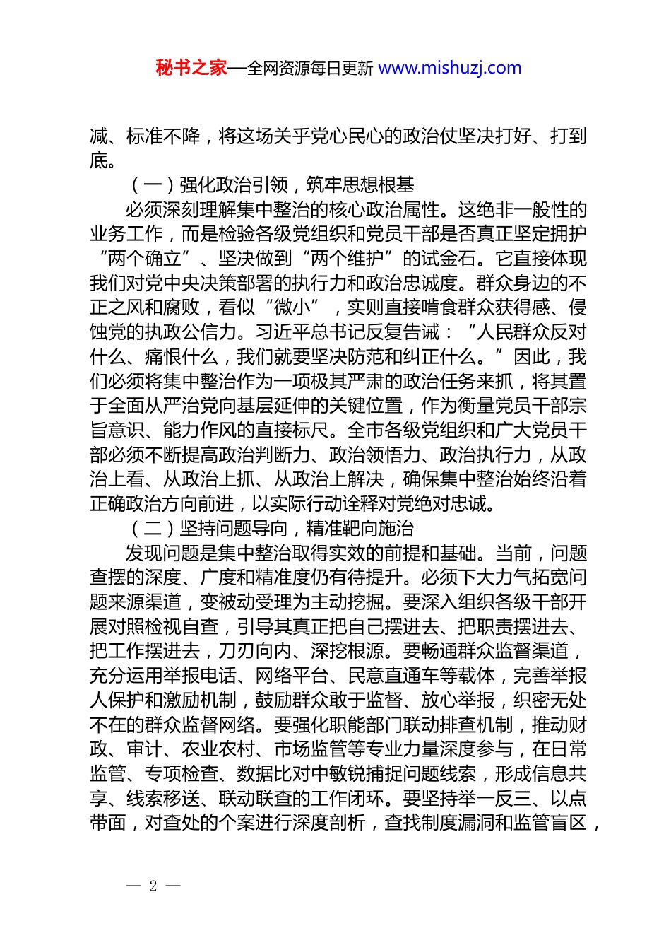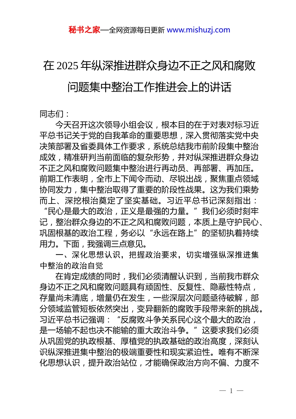 秘书之家—全网资源每日更新 www.mishuzj.com在 2025 年纵深推进群众身边不正之风和腐败问题集中整治工作推进会上的讲话同志们:今天召开这次领导小组会议,根本目的在于对表对标习近平总书记关于党的自我革命的重要思想,深入贯彻落实党中央决策部署及省委具体工作要求,系统总结我市前阶段集中整治成效,精准研判当前面临的复杂形势,并对纵深推进群众身边不正之风和腐败问题集中整治进行再动员、再部署、再加压。前期工作表明,全市上下闻令而动、尽锐出战,聚焦重点领域协同发力,集中整治取得了重要的阶段性战果。这为我们乘势而上、深挖根治奠定了坚实基础。习近平总书记深刻指出:“民心是最大的政治,正义是最强的力量。”我们必须时刻牢记,整治群众身边的不正之风和腐败问题,本质上是守护民心、巩固根基的政治工程,务必以“永远在路上”的坚韧执着持续用力。下面,我强调三点意见。一、深化思想认识,把握政治要求,切实增强纵深推进集中整治的政治自觉在肯定成绩的同时,我们必须清醒认识到,当前我市群众身边不正之风和腐败问题具有顽固性、反复性、隐蔽性特点,存量尚未清底,增量仍在发生,一些深层次问题亟待破解,部分领域监管短板依然突出,变异翻新的腐败手段带来新的挑战。习近平总书记强调:“反腐败斗争关系民心这个最大的政治,是一场输不起也决不能输的重大政治斗争。”这要求我们必须从巩固党的执政根基、厚植党的执政基础的政治高度,深刻认识纵深推进集中整治的极端重要性和现实紧迫性。唯有不断深化思想认识,提升政治站位,才能确保政治方向不偏、力度不— 1 —秘书之家—全网资源每日更新 www.mishuzj.com减、标准不降,将这场关乎党心民心的政治仗坚决打好、打到底。(一)强化政治引领,筑牢思想根基必须深刻理解集中整治的核心政治属性。这绝非一般性的业务工作,而是检验各级党组织和党员干部是否真正坚定拥护“两个确立”、坚决做到“两个维护”的试金石。它直接体现我们对党中央决策部署的执行力和政治忠诚度。群众身边的不正之风和腐败,看似“微小”,实则直接啃食群众获得感、侵蚀党的执政公信力。习近平总书记反复告诫:“人民群众反对什么、痛恨什么,我们就要坚决防范和纠正什么。”因此,我们必须将集中整治作为一项极其严肃的政治任务来抓,将其置于全面从严治党向基层延伸的关键位置,作为衡量党员干部宗旨意识、能力作风的直接标尺。全市各级党组织和广大党员干部必须不断提高政治判断力、政治领悟力、政治执行力,从政治上看、从政治上抓、从政治上解决,确保集中整治始终沿着正确政治方向前进,以实际行动诠释对党绝对忠诚。(二)坚持问题导向,精准靶向施治发现问题是集中整治取得实效的前提和基础。当前,问题查摆的深度、广度和精准度仍有待提升。必须下大力气拓宽问题来源渠道,变被动受理为主动挖掘。要深入组织各级干部开展对照检视自查,引导其真正把自己摆进去、把职责摆进去、把工作摆进去,刀刃向内、深挖根源。要畅通群众监督渠道,充分运用举报电话、网络平台、民意直通车等载体,完善举报人保护和激励机制,鼓励群众敢于监督、放心举报,织密无处不在的群众监督网络。要强化职能部门联动排查机制,推动财政、审计、农业农村、市场监管等专业力量深度参与,在日常监管、专项检查、数据比对中敏锐捕捉问题线索,形成信息共享、线索移送、联动联查的工作闭环。要坚持举一反三、以点带面,对查处的个案进行深度剖析,查找制度漏洞和监管盲区,— 2 —秘书之家—全网资源每日更新 www.mishuzj.com推动从“解决一个问题”向“治理一类问题”深化,实现标本兼治。问题查摆务必做到全面、精准、深入,为后续精准施治提供坚实靶向。(三)保持战略定力,勇于攻坚克难集中整治已进入深水区、攻坚期,面临的问题往往成因复杂、盘根错节。必须清醒认识到其长期性、复杂性和艰巨性,坚决摒弃“毕其功于一役”的速胜思想和“歇歇脚、松口气”的懈怠情绪。要深刻把握反腐败斗争永远在路上的科学论断,发扬彻底的自我革命精神,以“不破楼兰终不还”的决心和“咬定青山不放松”的韧劲,持续发力、久久为功。对于历史遗留...