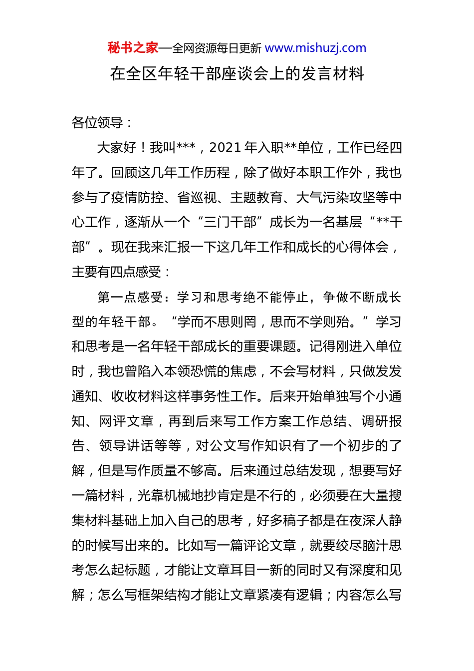 秘书之家—全网资源每日更新 www.mishuzj.com在全区年轻干部座谈会上的发言材料 各位领导:大家好!我叫***,2021 年入职**单位,工作已经四年了。回顾这几年工作历程,除了做好本职工作外,我也参与了疫情防控、省巡视、主题教育、大气污染攻坚等中心工作,逐渐从一个“三门干部”成长为一名基层“**干部”。现在我来汇报一下这几年工作和成长的心得体会,主要有四点感受:第一点感受:学习和思考绝不能停止,争做不断成长型的年轻干部。“学而不思则罔,思而不学则殆。”学习和思考是一名年轻干部成长的重要课题。记得刚进入单位时,我也曾陷入本领恐慌的焦虑,不会写材料,只做发发通知、收收材料这样事务性工作。后来开始单独写个小通知、网评文章,再到后来写工作方案工作总结、调研报告、领导讲话等等,对公文写作知识有了一个初步的了解,但是写作质量不够高。后来通过总结发现,想要写好一篇材料,光靠机械地抄肯定是不行的,必须要在大量搜集材料基础上加入自己的思考,好多稿子都是在夜深人静的时候写出来的。比如写一篇评论文章,就要绞尽脑汁思考怎么起标题,才能让文章耳目一新的同时又有深度和见解;怎么写框架结构才能让文章紧凑有逻辑;内容怎么写秘书之家—全网资源每日更新 www.mishuzj.com才能写得有血有肉、有说服力。领导讲话怎样才能写得既有高度,符合上级精神和文件政策,又能结合**实际、单位工作实际,通俗易懂接地气。因此,我认为只有不断学习和思考,才能跟上时代发展和工作要求。第二点感受:实干和担当要形成习惯,争做让人放心型的年轻干部。“疾风知劲草,烈火见真金。”党员干部在其位就要谋其政、负其责,要把能否履职尽责作为衡量一个干部合格与否的试金石。在单位,我见过很多老黄牛式样的干部,他们经常默默无闻地加班干活,把完成工作当成一种习惯,而不是领导要求的任务。我要以他们为榜样,保持“时时放心不下”的责任感,特别是遇到事情不能相互推诿扯皮,说这个工作不是我们的进行推活,而是应该主动去担当作为、去解决问题。作为**的工作人员,主要工作就是做文稿服务工作,对上级和领导交办的任务应该谨记两点:一是要做到“文经我手无差错,事交我办请放心”;二是要做到“事事有回应、件件有着落”,做一名做事让人放心的年轻干部。第三点感受:敢拼和较真来激活潜能,争做能抗硬活型的年轻干部。古人讲“取乎其上,得乎其中;取乎其中,得乎其下。”年轻干部作为全区干部队伍中的“排头兵”,任何时候都不能降低工作标准,有着一股子较真和拼搏的劲头,把每项工作做到极致。作为一名年轻干部,秘书之家—全网资源每日更新 www.mishuzj.com一定要杜绝“差不多”思想,在把工作做到自己满意程度的同时,自身也会取得成就感。工作几年来,听身边很多人说乡镇干部能干硬活,在区直单位工作上手更快。我认为**的干部也要有乡镇干部的一股拼劲,始终保持工作的激情和活力,多参与全区的中心工作,在经风雨、见世面的过程中增长才干,在实践中磨砺出勇担重任的能力和本领。第四点感受:纪律和规矩要融入生活,争做作风优良型的年轻干部。关于作风建设,我有两点体会。一是最近开展的中央八项规定精神学习教育,对党员干部作风建设提出了更高的要求,通过学习我也对作风建设的有了更深的认识。比如“为政之道,修身为本。”讲的就是党员干部的党性修养、道德水平不会随着党龄、职务的提升而提高,必须常学习常修炼,抓好思想上的固本培元。二是有时候下去调研,会听到说某某干部规矩和纪律意识强,意思就是这名干部能够服务中心和大局,对领导安排的任务能够不折不扣地落实下去,我认为这是非常重要的品质,会直接影响到这个班子的团结度和战斗力。作为一名年轻干部,要始终把作风建设融入日常生活生活中,常学常修,同时严格遵守各种规章制度,坚决杜绝“假大空”的形式主义、“冷横硬”的官僚主义、“躺平式”的享乐主义和“铺张浪费”的奢靡之风,始终保持蓬勃朝气、昂扬秘书之家—全网资源每日更新 www.mishuzj.com锐气和浩然正气。我的发言完毕,不足之处还请大家批评指正。