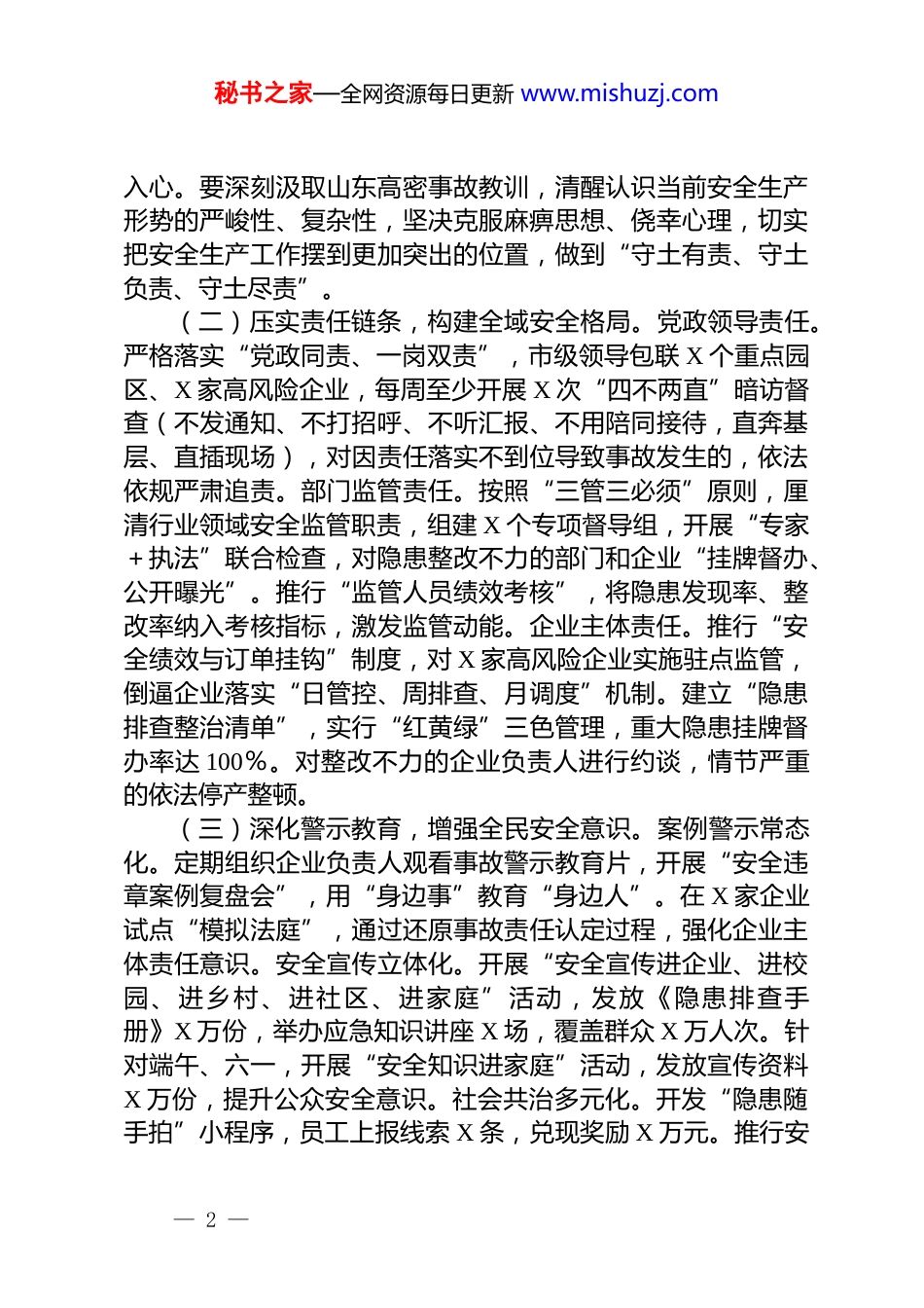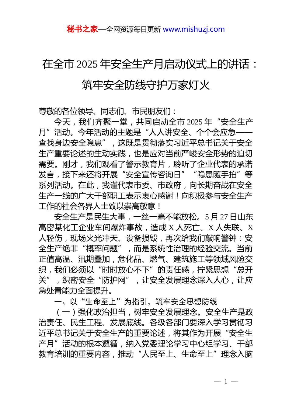 秘书之家—全网资源每日更新 www.mishuzj.com在全市 2025 年安全生产月启动仪式上的讲话:筑牢安全防线守护万家灯火尊敬的各位领导、同志们、市民朋友们:今天,我们齐聚一堂,共同启动全市 2025 年“安全生产月”活动。今年活动的主题是“人人讲安全、个个会应急——查找身边安全隐患”,这既是贯彻落实习近平总书记关于安全生产重要论述的生动实践,也是应对当前严峻安全形势的迫切需要。刚才,我们观看了警示教育片,聆听了企业代表的承诺发言,接下来还将开展“安全宣传咨询日”“隐患随手拍”等系列活动。在此,我谨代表市委、市政府,向长期奋战在安全生产一线的广大干部职工表示衷心感谢!向积极参与安全生产工作的社会各界人士致以崇高敬意!安全生产是民生大事,一丝一毫不能放松。5 月 27 日山东高密某化工企业车间爆炸事故,造成 X 人死亡、X 人失联、X人轻伤,现场火光冲天、设备损毁,再次给我们敲响警钟:安全生产绝非“概率问题”,而是系统性治理的经验交流。当前正值高温、汛期叠加,危化品、燃气、建筑施工等领域风险交织,我们必须以“时时放心不下”的责任感,拧紧思想“总开关”,织密安全“防护网”,让安全发展理念深入人心,让应急处置能力全面提升。一、以“生命至上”为指引,筑牢安全思想防线(一)强化政治担当,树牢安全发展理念。安全生产是政治责任、民生工程、发展底线。各级各部门要深入学习贯彻习近平总书记关于安全生产的重要论述,将其作为开展“安全生产月”活动的根本遵循,纳入党委理论学习中心组学习、干部教育培训的重要内容,推动“人民至上、生命至上”理念入脑— 1 —秘书之家—全网资源每日更新 www.mishuzj.com入心。要深刻汲取山东高密事故教训,清醒认识当前安全生产形势的严峻性、复杂性,坚决克服麻痹思想、侥幸心理,切实把安全生产工作摆到更加突出的位置,做到“守土有责、守土负责、守土尽责”。(二)压实责任链条,构建全域安全格局。党政领导责任。严格落实“党政同责、一岗双责”,市级领导包联 X 个重点园区、X 家高风险企业,每周至少开展 X 次“四不两直”暗访督查(不发通知、不打招呼、不听汇报、不用陪同接待,直奔基层、直插现场),对因责任落实不到位导致事故发生的,依法依规严肃追责。部门监管责任。按照“三管三必须”原则,厘清行业领域安全监管职责,组建 X 个专项督导组,开展“专家+执法”联合检查,对隐患整改不力的部门和企业“挂牌督办、公开曝光”。推行“监管人员绩效考核”,将隐患发现率、整改率纳入考核指标,激发监管动能。企业主体责任。推行“安全绩效与订单挂钩”制度,对 X 家高风险企业实施驻点监管,倒逼企业落实“日管控、周排查、月调度”机制。建立“隐患排查整治清单”,实行“红黄绿”三色管理,重大隐患挂牌督办率达 100%。对整改不力的企业负责人进行约谈,情节严重的依法停产整顿。(三)深化警示教育,增强全民安全意识。案例警示常态化。定期组织企业负责人观看事故警示教育片,开展“安全违章案例复盘会”,用“身边事”教育“身边人”。在 X 家企业试点“模拟法庭”,通过还原事故责任认定过程,强化企业主体责任意识。安全宣传立体化。开展“安全宣传进企业、进校园、进乡村、进社区、进家庭”活动,发放《隐患排查手册》X 万份,举办应急知识讲座 X 场,覆盖群众 X 万人次。针对端午、六一,开展“安全知识进家庭”活动,发放宣传资料X 万份,提升公众安全意识。社会共治多元化。开发“隐患随手拍”小程序,员工上报线索 X 条,兑现奖励 X 万元。推行安— 2 —秘书之家—全网资源每日更新 www.mishuzj.com全生产责任险,将保险赔付与隐患整改挂钩,形成“风险共担、责任共负”格局。鼓励群众参与节日期间安全监督,设立“节日安全举报专线”,对查实线索给予奖励。二、以“隐患清零”为目标,打响专项整治攻坚战(一)开展“拉网式”排查,消除风险隐患。危化品领域开展“全链条”风险防控,重点整治储罐区安全间距不足、自动化控制失灵等问题。推行“智能巡检机器人”替代 X%人工巡检,实时监测温度、压力等参数,发现并处...