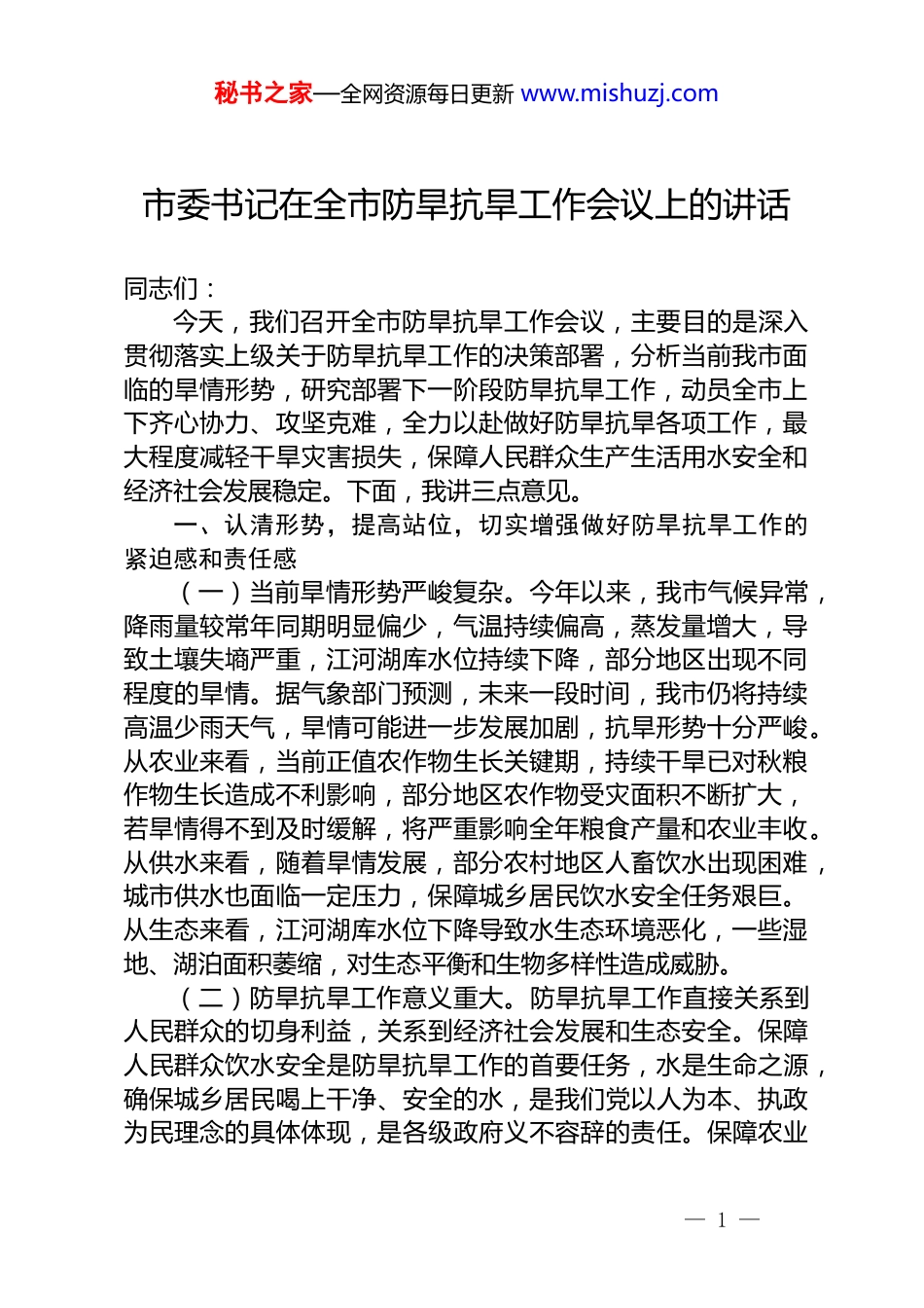 秘书之家—全网资源每日更新 www.mishuzj.com市委书记在全市防旱抗旱工作会议上的讲话同志们:今天,我们召开全市防旱抗旱工作会议,主要目的是深入贯彻落实上级关于防旱抗旱工作的决策部署,分析当前我市面临的旱情形势,研究部署下一阶段防旱抗旱工作,动员全市上下齐心协力、攻坚克难,全力以赴做好防旱抗旱各项工作,最大程度减轻干旱灾害损失,保障人民群众生产生活用水安全和经济社会发展稳定。下面,我讲三点意见。一、认清形势,提高站位,切实增强做好防旱抗旱工作的紧迫感和责任感(一)当前旱情形势严峻复杂。今年以来,我市气候异常,降雨量较常年同期明显偏少,气温持续偏高,蒸发量增大,导致土壤失墒严重,江河湖库水位持续下降,部分地区出现不同程度的旱情。据气象部门预测,未来一段时间,我市仍将持续高温少雨天气,旱情可能进一步发展加剧,抗旱形势十分严峻。从农业来看,当前正值农作物生长关键期,持续干旱已对秋粮作物生长造成不利影响,部分地区农作物受灾面积不断扩大,若旱情得不到及时缓解,将严重影响全年粮食产量和农业丰收。从供水来看,随着旱情发展,部分农村地区人畜饮水出现困难,城市供水也面临一定压力,保障城乡居民饮水安全任务艰巨。从生态来看,江河湖库水位下降导致水生态环境恶化,一些湿地、湖泊面积萎缩,对生态平衡和生物多样性造成威胁。(二)防旱抗旱工作意义重大。防旱抗旱工作直接关系到人民群众的切身利益,关系到经济社会发展和生态安全。保障人民群众饮水安全是防旱抗旱工作的首要任务,水是生命之源,确保城乡居民喝上干净、安全的水,是我们党以人为本、执政为民理念的具体体现,是各级政府义不容辞的责任。保障农业— 1 —秘书之家—全网资源每日更新 www.mishuzj.com生产稳定是防旱抗旱工作的重要目标,农业是国民经济的基础,粮食安全是国家安全的重要基础,做好防旱抗旱工作,对于稳定农业生产、保障粮食安全、促进农民增收具有重要意义。维护经济社会稳定是防旱抗旱工作的必然要求,干旱灾害不仅影响农业和供水,还会对工业生产、能源供应、交通运输等各个领域产生连锁反应,做好防旱抗旱工作,能够有效减少灾害损失,维护经济社会正常秩序。保护生态环境是防旱抗旱工作的重要使命,水是生态系统的控制性要素,做好防旱抗旱工作,对于维护水生态平衡、保护生物多样性、促进生态文明建设具有重要作用。(三)增强防旱抗旱工作的紧迫感和责任感。面对严峻的旱情形势,全市上下必须充分认识到防旱抗旱工作的重要性和紧迫性,坚决克服麻痹思想和侥幸心理,迅速行动起来,全力以赴投入到防旱抗旱工作中。各级领导干部要深入一线、靠前指挥,切实履行领导责任,做到守土有责、守土负责、守土尽责。各有关部门要各司其职、各负其责,密切配合、协同作战,形成防旱抗旱工作的强大合力。广大党员干部要发挥先锋模范作用,带头深入基层、深入群众,帮助解决实际困难和问题,带领群众共同抗旱救灾。二、突出重点,精准施策,扎实有效推进防旱抗旱各项工作(一)全力保障城乡居民饮水安全。要把保障城乡居民饮水安全作为防旱抗旱工作的重中之重,采取切实有效措施,确保人民群众喝上干净、安全的水。一是加强水源调度管理。水利部门要科学调配水资源,按照“先生活、后生产,先节水、后调水,先地表、后地下”的原则,合理分配用水指标,优先保障城乡居民生活用水和重点工业企业用水需求。加强对江河湖库水资源的统一管理和调度,充分发挥水利工程调蓄作用,提高水资源的利用效率。二是加快应急供水工程建设。对因干— 2 —秘书之家—全网资源每日更新 www.mishuzj.com旱导致饮水困难的地区,要因地制宜采取打井取水、修建应急调水工程、拉水送水等措施,保障群众基本生活用水需求。加快推进农村饮水安全巩固提升工程建设,提高农村供水保障能力。三是加强水质监测和保护。环保、卫生等部门要加强对饮用水水源地的水质监测和保护,加大对水污染违法行为的查处力度,确保饮用水水源地水质安全。加强对供水企业的监管,规范供水行为,保证供水质量。(二)切实抓好农业生产抗旱救灾。农业是受干旱影响最直接的领域,要把农...