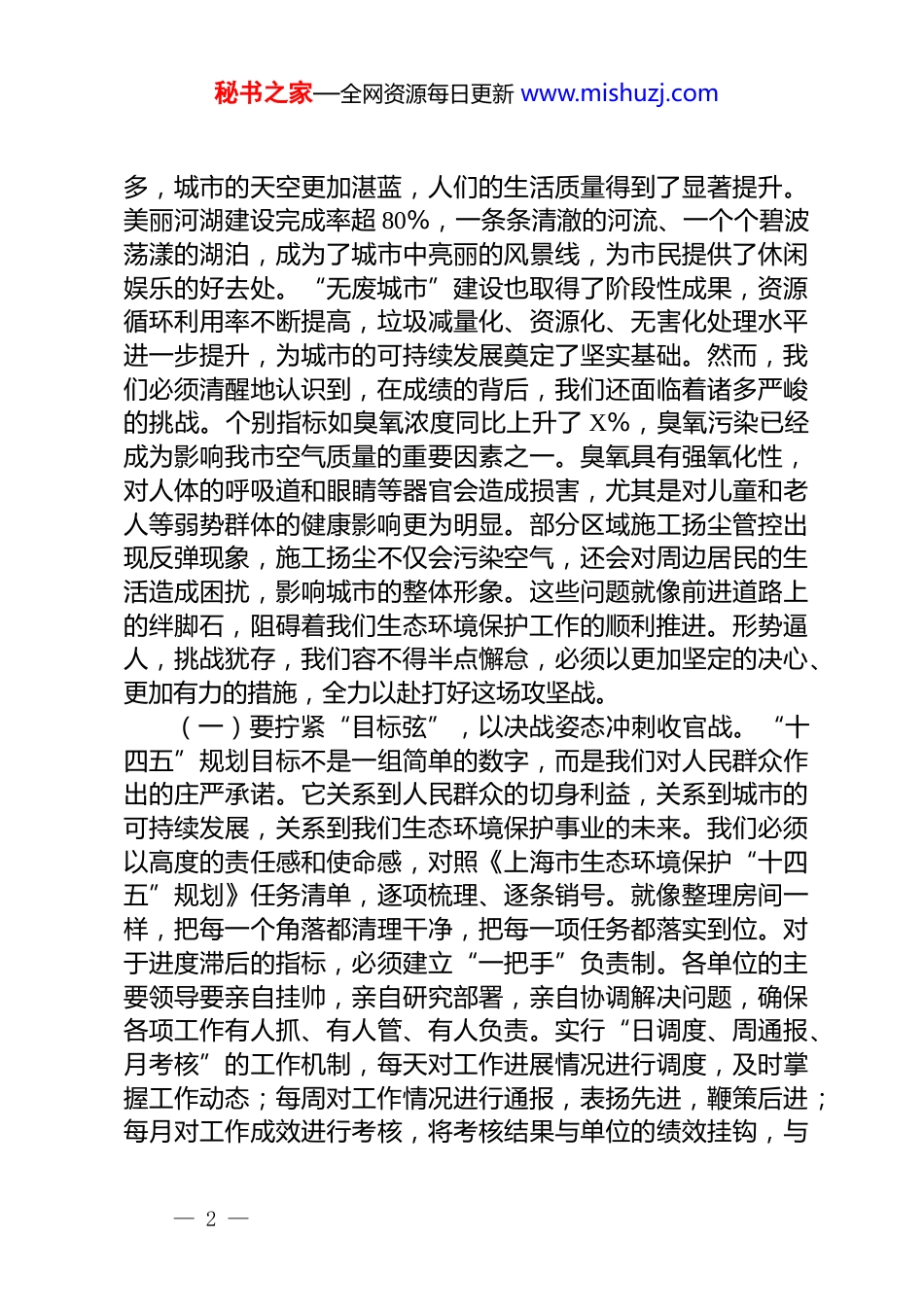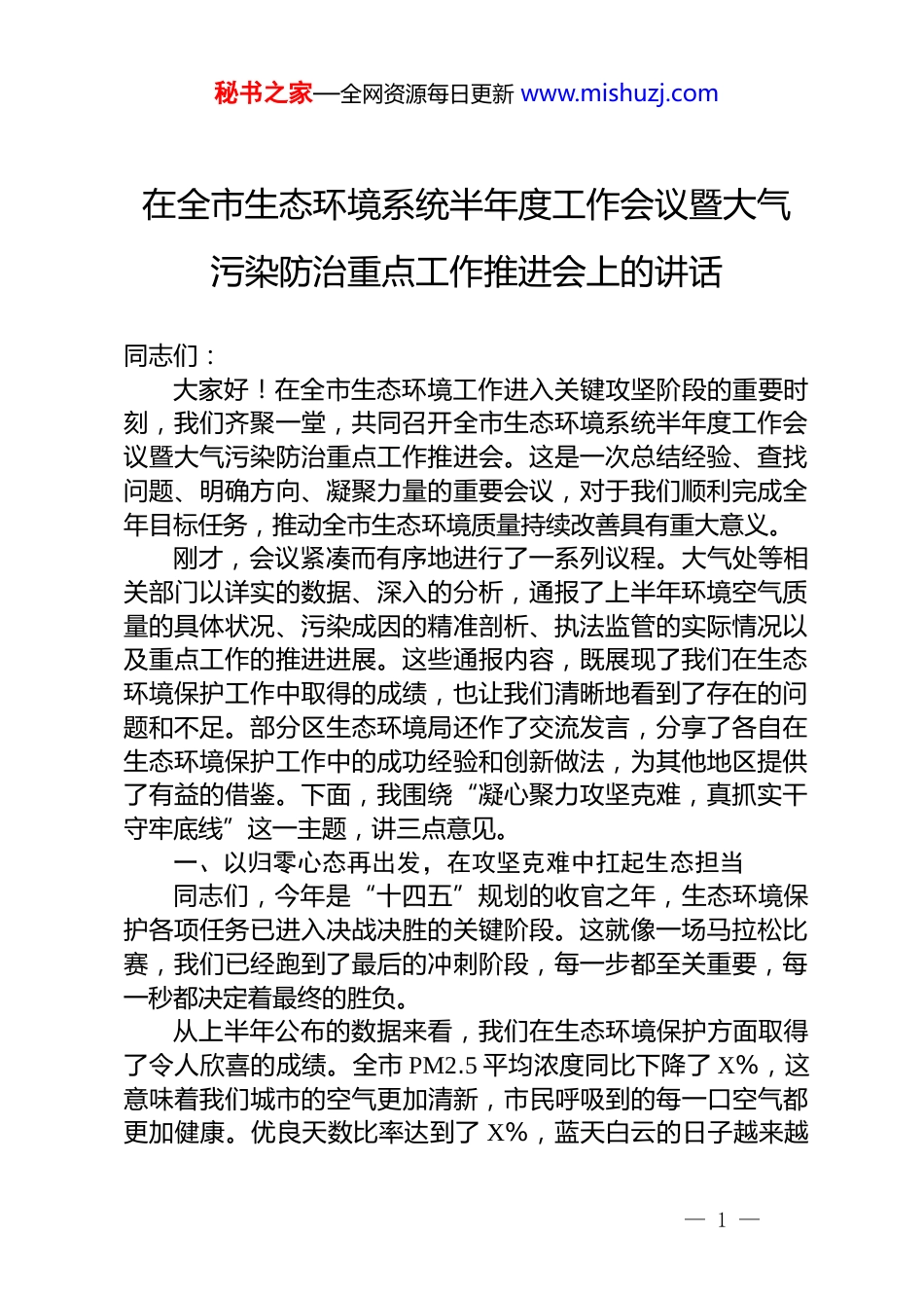 秘书之家—全网资源每日更新 www.mishuzj.com在全市生态环境系统半年度工作会议暨大气污染防治重点工作推进会上的讲话同志们:大家好!在全市生态环境工作进入关键攻坚阶段的重要时刻,我们齐聚一堂,共同召开全市生态环境系统半年度工作会议暨大气污染防治重点工作推进会。这是一次总结经验、查找问题、明确方向、凝聚力量的重要会议,对于我们顺利完成全年目标任务,推动全市生态环境质量持续改善具有重大意义。刚才,会议紧凑而有序地进行了一系列议程。大气处等相关部门以详实的数据、深入的分析,通报了上半年环境空气质量的具体状况、污染成因的精准剖析、执法监管的实际情况以及重点工作的推进进展。这些通报内容,既展现了我们在生态环境保护工作中取得的成绩,也让我们清晰地看到了存在的问题和不足。部分区生态环境局还作了交流发言,分享了各自在生态环境保护工作中的成功经验和创新做法,为其他地区提供了有益的借鉴。下面,我围绕“凝心聚力攻坚克难,真抓实干守牢底线”这一主题,讲三点意见。一、以归零心态再出发,在攻坚克难中扛起生态担当同志们,今年是“十四五”规划的收官之年,生态环境保护各项任务已进入决战决胜的关键阶段。这就像一场马拉松比赛,我们已经跑到了最后的冲刺阶段,每一步都至关重要,每一秒都决定着最终的胜负。从上半年公布的数据来看,我们在生态环境保护方面取得了令人欣喜的成绩。全市 PM2.5 平均浓度同比下降了 X%,这意味着我们城市的空气更加清新,市民呼吸到的每一口空气都更加健康。优良天数比率达到了 X%,蓝天白云的日子越来越— 1 —秘书之家—全网资源每日更新 www.mishuzj.com多,城市的天空更加湛蓝,人们的生活质量得到了显著提升。美丽河湖建设完成率超 80%,一条条清澈的河流、一个个碧波荡漾的湖泊,成为了城市中亮丽的风景线,为市民提供了休闲娱乐的好去处。“无废城市”建设也取得了阶段性成果,资源循环利用率不断提高,垃圾减量化、资源化、无害化处理水平进一步提升,为城市的可持续发展奠定了坚实基础。然而,我们必须清醒地认识到,在成绩的背后,我们还面临着诸多严峻的挑战。个别指标如臭氧浓度同比上升了 X%,臭氧污染已经成为影响我市空气质量的重要因素之一。臭氧具有强氧化性,对人体的呼吸道和眼睛等器官会造成损害,尤其是对儿童和老人等弱势群体的健康影响更为明显。部分区域施工扬尘管控出现反弹现象,施工扬尘不仅会污染空气,还会对周边居民的生活造成困扰,影响城市的整体形象。这些问题就像前进道路上的绊脚石,阻碍着我们生态环境保护工作的顺利推进。形势逼人,挑战犹存,我们容不得半点懈怠,必须以更加坚定的决心、更加有力的措施,全力以赴打好这场攻坚战。(一)要拧紧“目标弦”,以决战姿态冲刺收官战。“十四五”规划目标不是一组简单的数字,而是我们对人民群众作出的庄严承诺。它关系到人民群众的切身利益,关系到城市的可持续发展,关系到我们生态环境保护事业的未来。我们必须以高度的责任感和使命感,对照《上海市生态环境保护“十四五”规划》任务清单,逐项梳理、逐条销号。就像整理房间一样,把每一个角落都清理干净,把每一项任务都落实到位。对于进度滞后的指标,必须建立“一把手”负责制。各单位的主要领导要亲自挂帅,亲自研究部署,亲自协调解决问题,确保各项工作有人抓、有人管、有人负责。实行“日调度、周通报、月考核”的工作机制,每天对工作进展情况进行调度,及时掌握工作动态;每周对工作情况进行通报,表扬先进,鞭策后进;每月对工作成效进行考核,将考核结果与单位的绩效挂钩,与— 2 —秘书之家—全网资源每日更新 www.mishuzj.com干部的评先评优挂钩。通过这种严格的工作机制,确保年底前啃下“硬骨头”,顺利完成“十四五”规划的各项任务目标。(二)要绷紧“责任链”,以系统思维织密防护网。生态环境保护是一个系统工程,涉及经济社会的各个领域、各个方面,不能各自为战、单打独斗。我们要强化“管发展必须管环保、管生产必须管环保、管行业必须管环保”的“三管三必须”责任体系,形成政府主导、企业主体、社会组织和公众共同参与的生...