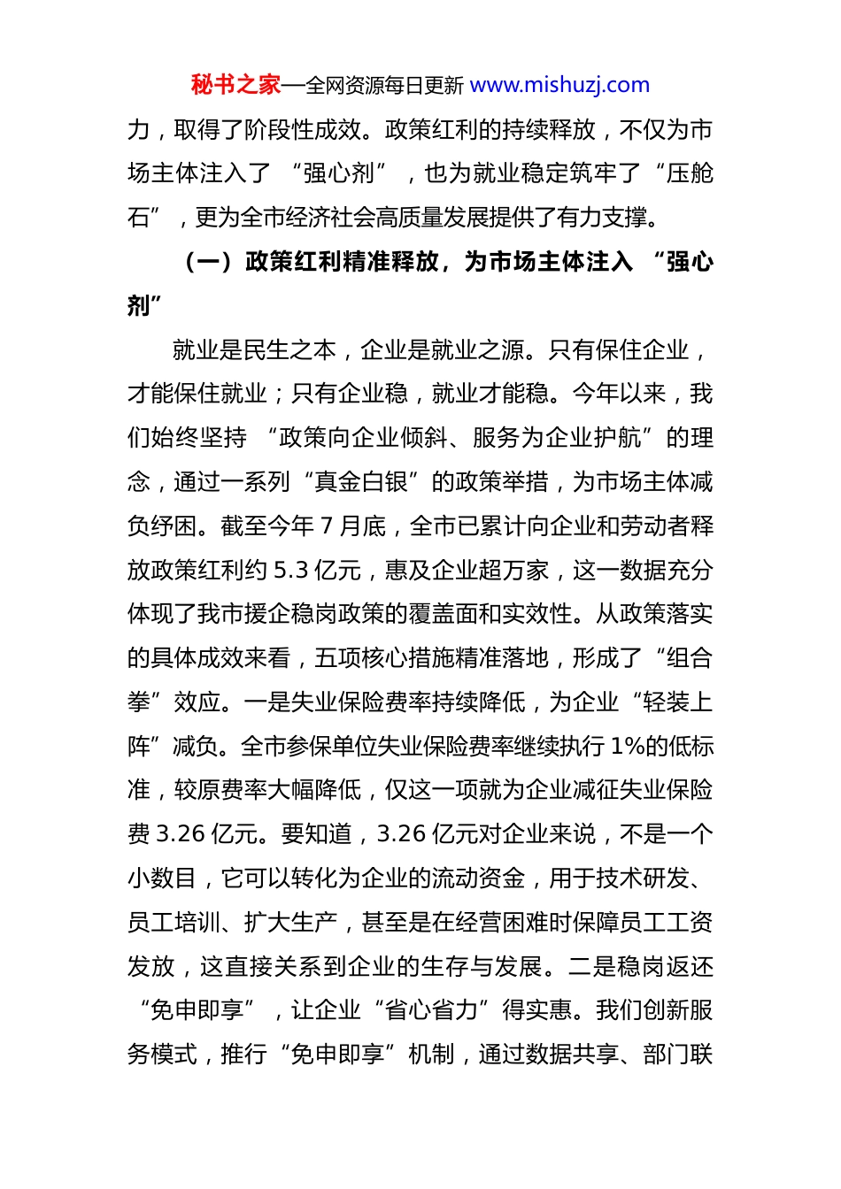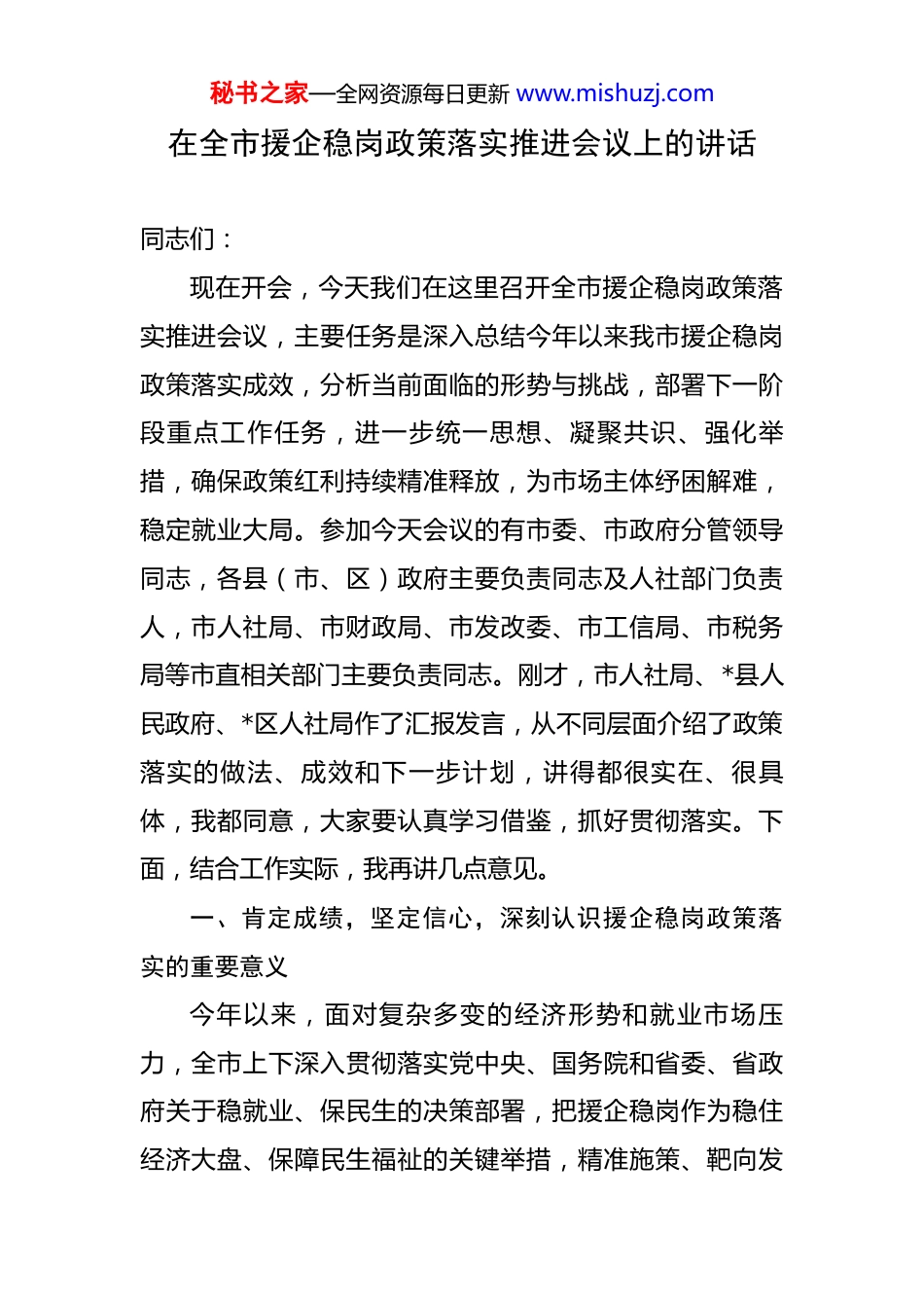 秘书之家—全网资源每日更新 www.mishuzj.com在全市援企稳岗政策落实推进会议上的讲话 同志们:现在开会,今天我们在这里召开全市援企稳岗政策落实推进会议,主要任务是深入总结今年以来我市援企稳岗政策落实成效,分析当前面临的形势与挑战,部署下一阶段重点工作任务,进一步统一思想、凝聚共识、强化举措,确保政策红利持续精准释放,为市场主体纾困解难,稳定就业大局。参加今天会议的有市委、市政府分管领导同志,各县(市、区)政府主要负责同志及人社部门负责人,市人社局、市财政局、市发改委、市工信局、市税务局等市直相关部门主要负责同志。刚才,市人社局、*县人民政府、*区人社局作了汇报发言,从不同层面介绍了政策落实的做法、成效和下一步计划,讲得都很实在、很具体,我都同意,大家要认真学习借鉴,抓好贯彻落实。下面,结合工作实际,我再讲几点意见。一、肯定成绩,坚定信心,深刻认识援企稳岗政策落实的重要意义今年以来,面对复杂多变的经济形势和就业市场压力,全市上下深入贯彻落实党中央、国务院和省委、省政府关于稳就业、保民生的决策部署,把援企稳岗作为稳住经济大盘、保障民生福祉的关键举措,精准施策、靶向发秘书之家—全网资源每日更新 www.mishuzj.com力,取得了阶段性成效。政策红利的持续释放,不仅为市场主体注入了 “强心剂”,也为就业稳定筑牢了“压舱石”,更为全市经济社会高质量发展提供了有力支撑。(一)政策红利精准释放,为市场主体注入 “强心剂”就业是民生之本,企业是就业之源。只有保住企业,才能保住就业;只有企业稳,就业才能稳。今年以来,我们始终坚持 “政策向企业倾斜、服务为企业护航”的理念,通过一系列“真金白银”的政策举措,为市场主体减负纾困。截至今年 7 月底,全市已累计向企业和劳动者释放政策红利约 5.3 亿元,惠及企业超万家,这一数据充分体现了我市援企稳岗政策的覆盖面和实效性。从政策落实的具体成效来看,五项核心措施精准落地,形成了“组合拳”效应。一是失业保险费率持续降低,为企业“轻装上阵”减负。全市参保单位失业保险费率继续执行 1%的低标准,较原费率大幅降低,仅这一项就为企业减征失业保险费 3.26 亿元。要知道,3.26 亿元对企业来说,不是一个小数目,它可以转化为企业的流动资金,用于技术研发、员工培训、扩大生产,甚至是在经营困难时保障员工工资发放,这直接关系到企业的生存与发展。二是稳岗返还“免申即享”,让企业“省心省力”得实惠。我们创新服务模式,推行“免申即享”机制,通过数据共享、部门联秘书之家—全网资源每日更新 www.mishuzj.com动,自动比对符合条件的企业名单,无需企业主动申请,直接将稳岗返还补贴资金发放到位。截至 7 月底,已为全市 1.15 万家企业发放稳岗返还补贴资金 8104 万元,稳定就业岗位 23.2 万个。这意味着 23.2 万个家庭的收入有了保障,企业的用工稳定性得到了提升,有效避免了因企业裁员导致的就业波动。三是技能提升补贴扩面增效,为劳动者“赋能增值”。我们放宽了技能提升补贴申领条件,将受益人群从企业职工拓展到失业人员,鼓励劳动者提升职业技能,增强就业竞争力。截至目前,已发放技能提升补贴 1428 万元,惠及 7900 余人次职工及失业人员。这些劳动者通过技能培训,有的实现了岗位晋升,有的顺利转岗就业,不仅提升了个人收入水平,也为企业转型升级提供了技能人才支撑。四是一次性扩岗补助精准投放,鼓励企业吸纳青年就业。针对高校毕业生等青年群体就业难问题,我们对招用符合条件的高校毕业生等青年的企业给予一次性扩岗补助,截至 7 月底,已为招用 1058 名高校毕业生等青年群体的企业发放补助 105.8 万元。这一政策既减轻了企业吸纳青年就业的成本,也为高校毕业生等青年群体提供了更多就业机会,缓解了青年就业压力。五是失业保险金及时足额发放,为失业人员兜牢“民生底线”。我们始终把保障失业人员基本生活放在重要位置,通过优化申领流程、拓宽服务渠道,确保失业保险金及时发放。秘书之家—全网资源每日更新 www.mishuzj.com截至 7 月底,已为 4.85 万人次失业人员发放失...