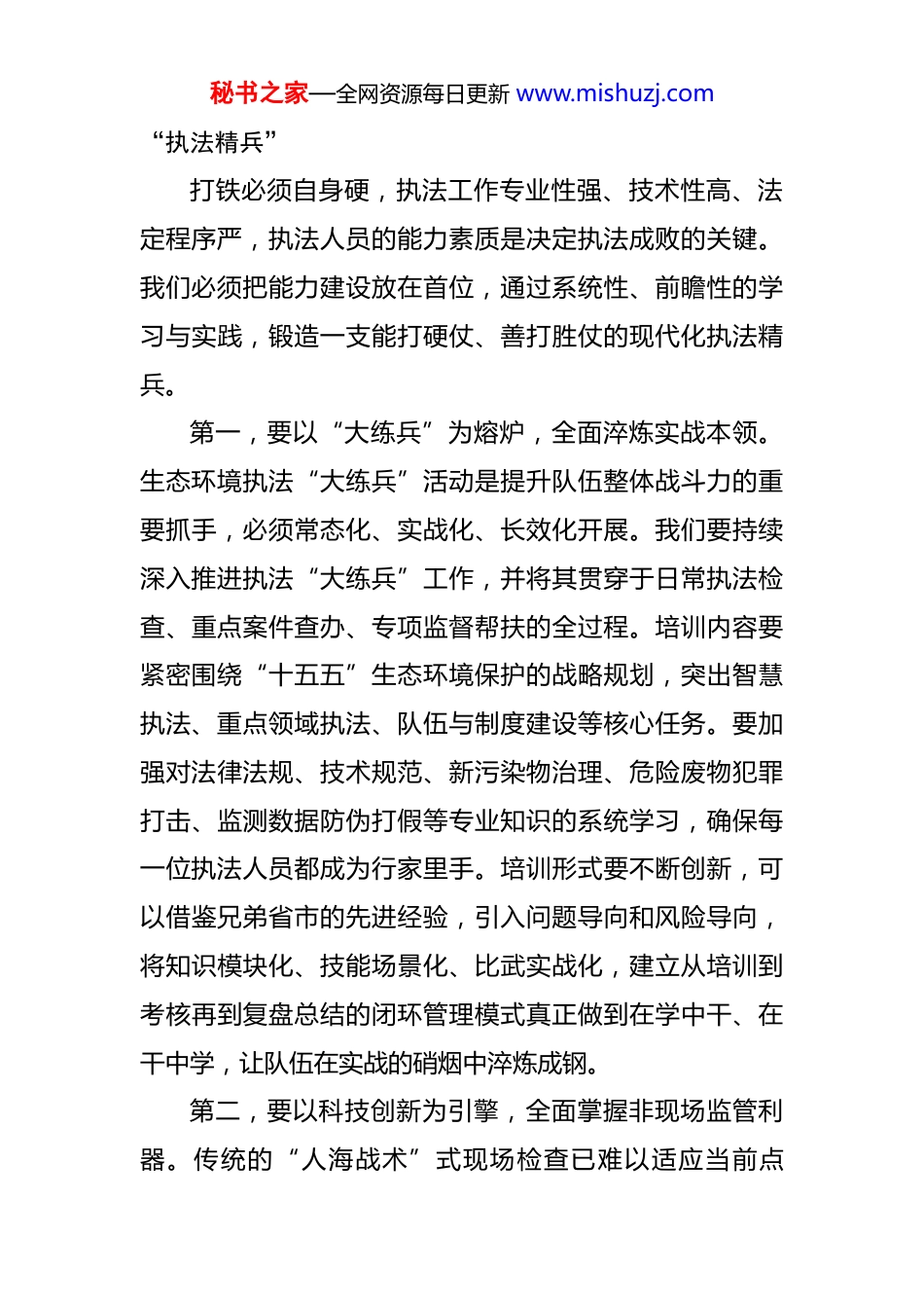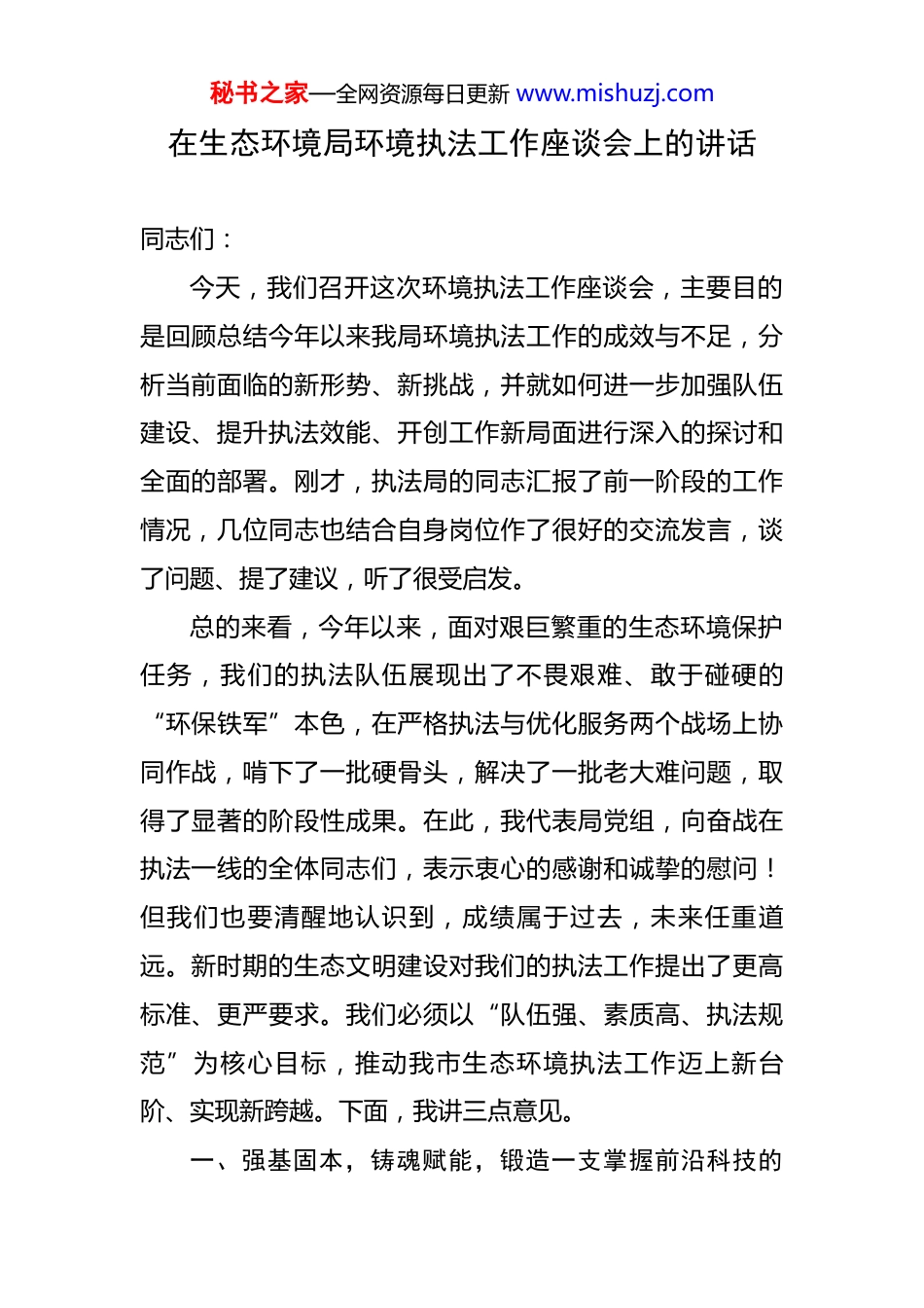 秘书之家—全网资源每日更新 www.mishuzj.com在生态环境局环境执法工作座谈会上的讲话 同志们:今天,我们召开这次环境执法工作座谈会,主要目的是回顾总结今年以来我局环境执法工作的成效与不足,分析当前面临的新形势、新挑战,并就如何进一步加强队伍建设、提升执法效能、开创工作新局面进行深入的探讨和全面的部署。刚才,执法局的同志汇报了前一阶段的工作情况,几位同志也结合自身岗位作了很好的交流发言,谈了问题、提了建议,听了很受启发。总的来看,今年以来,面对艰巨繁重的生态环境保护任务,我们的执法队伍展现出了不畏艰难、敢于碰硬的“环保铁军”本色,在严格执法与优化服务两个战场上协同作战,啃下了一批硬骨头,解决了一批老大难问题,取得了显著的阶段性成果。在此,我代表局党组,向奋战在执法一线的全体同志们,表示衷心的感谢和诚挚的慰问!但我们也要清醒地认识到,成绩属于过去,未来任重道远。新时期的生态文明建设对我们的执法工作提出了更高标准、更严要求。我们必须以“队伍强、素质高、执法规范”为核心目标,推动我市生态环境执法工作迈上新台阶、实现新跨越。下面,我讲三点意见。一、强基固本,铸魂赋能,锻造一支掌握前沿科技的秘书之家—全网资源每日更新 www.mishuzj.com“执法精兵”打铁必须自身硬,执法工作专业性强、技术性高、法定程序严,执法人员的能力素质是决定执法成败的关键。我们必须把能力建设放在首位,通过系统性、前瞻性的学习与实践,锻造一支能打硬仗、善打胜仗的现代化执法精兵。第一,要以“大练兵”为熔炉,全面淬炼实战本领。生态环境执法“大练兵”活动是提升队伍整体战斗力的重要抓手,必须常态化、实战化、长效化开展。我们要持续深入推进执法“大练兵”工作,并将其贯穿于日常执法检查、重点案件查办、专项监督帮扶的全过程。培训内容要紧密围绕“十五五”生态环境保护的战略规划,突出智慧执法、重点领域执法、队伍与制度建设等核心任务。要加强对法律法规、技术规范、新污染物治理、危险废物犯罪打击、监测数据防伪打假等专业知识的系统学习,确保每一位执法人员都成为行家里手。培训形式要不断创新,可以借鉴兄弟省市的先进经验,引入问题导向和风险导向,将知识模块化、技能场景化、比武实战化,建立从培训到考核再到复盘总结的闭环管理模式真正做到在学中干、在干中学,让队伍在实战的硝烟中淬炼成钢。第二,要以科技创新为引擎,全面掌握非现场监管利器。传统的“人海战术”式现场检查已难以适应当前点秘书之家—全网资源每日更新 www.mishuzj.com多、面广、线长的监管需求。我们必须抢抓机遇,主动拥抱大数据、物联网、人工智能等现代信息技术带来的深刻变革,大力推进非现场监管模式。要将污染源自动监控系统作为非现场执法的核心手段,强化数据的实时采集与分析,为精准执法提供第一手依据。同时,要综合运用视频监控、环保设施用水用电监控、无人机巡查、移动“走航车”监测、卫星遥感乃至激光雷达等多种先进技术手段构建一个“天地空一体化”的立体监控网络。比如,针对挥发性有机物治理,我们可以引入活性炭低效预警技术,变被动查处为主动预防。通过这些技术,将执法触角延伸到每一个角落,让环境违法行为无处遁形。第三,要以数据研判为核心,全面提升精准执法水平。技术是工具,数据是灵魂。拥有了海量的监控数据,关键在于如何用好、盘活这些数据。我们要加快建设统一的非现场监管与精准执法平台,实现各类监控数据的归集共享与深度融合。要成立数据分析专班,加强对海量、多源数据的智能研判,通过 AI 模型算法,自动识别异常信号、预警环境风险、筛选违法线索。要建立健全从线上预警到线下核查的快速响应与联动机制,一旦非现场监管系统发出警报,执法人员能够迅速响应、精准出击、依法查处彻底改变过去“大海捞针”式的执法窘境,实现对环境违法行为的“靶向治疗”和“外科手术式”打击。秘书之家—全网资源每日更新 www.mishuzj.com二、优化方式,提质增效,争当服务发展大局的“执法先锋”执法既要有力度,更要有温度。我们的最终目的不是处罚,而是通过执法推动企业履行环保主体责任,...