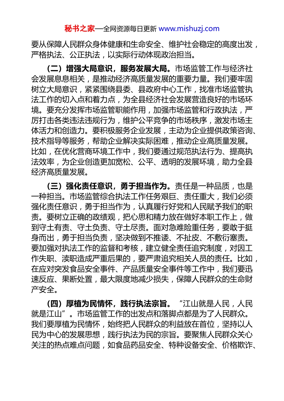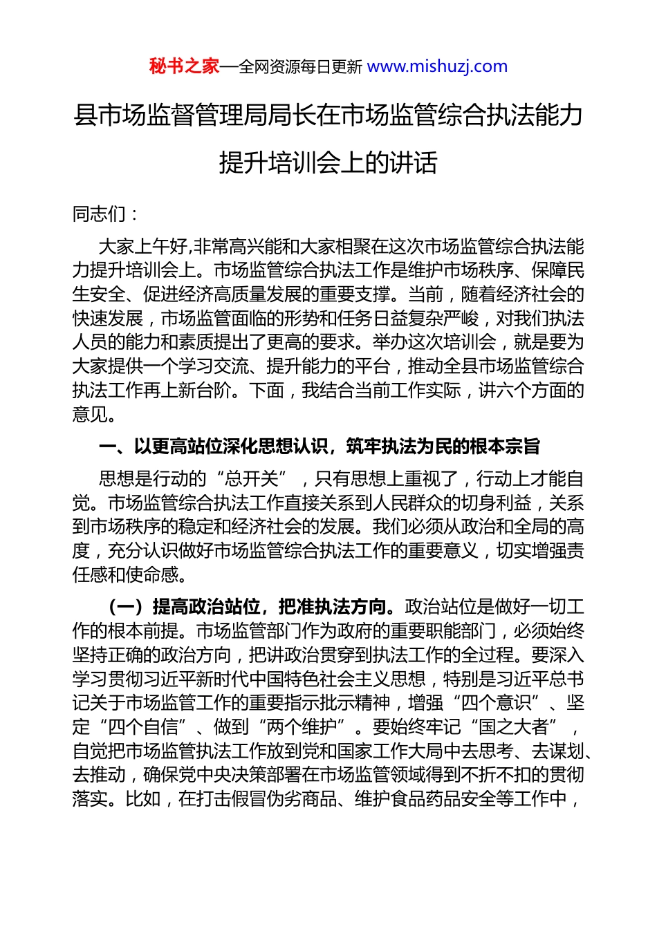 秘书之家—全网资源每日更新 www.mishuzj.com县市场监督管理局局长在市场监管综合执法能力提升培训会上的讲话同志们:大家上午好,非常高兴能和大家相聚在这次市场监管综合执法能力提升培训会上。市场监管综合执法工作是维护市场秩序、保障民生安全、促进经济高质量发展的重要支撑。当前,随着经济社会的快速发展,市场监管面临的形势和任务日益复杂严峻,对我们执法人员的能力和素质提出了更高的要求。举办这次培训会,就是要为大家提供一个学习交流、提升能力的平台,推动全县市场监管综合执法工作再上新台阶。下面,我结合当前工作实际,讲六个方面的意见。一、以更高站位深化思想认识,筑牢执法为民的根本宗旨思想是行动的“总开关”,只有思想上重视了,行动上才能自觉。市场监管综合执法工作直接关系到人民群众的切身利益,关系到市场秩序的稳定和经济社会的发展。我们必须从政治和全局的高度,充分认识做好市场监管综合执法工作的重要意义,切实增强责任感和使命感。(一)提高政治站位,把准执法方向。政治站位是做好一切工作的根本前提。市场监管部门作为政府的重要职能部门,必须始终坚持正确的政治方向,把讲政治贯穿到执法工作的全过程。要深入学习贯彻习近平新时代中国特色社会主义思想,特别是习近平总书记关于市场监管工作的重要指示批示精神,增强“四个意识”、坚定“四个自信”、做到“两个维护”。要始终牢记“国之大者”,自觉把市场监管执法工作放到党和国家工作大局中去思考、去谋划、去推动,确保党中央决策部署在市场监管领域得到不折不扣的贯彻落实。比如,在打击假冒伪劣商品、维护食品药品安全等工作中,秘书之家—全网资源每日更新 www.mishuzj.com要从保障人民群众身体健康和生命安全、维护社会稳定的高度出发,严格执法、公正执法,以实际行动体现政治担当。(二)增强大局意识,服务发展大局。市场监管工作与经济社会发展息息相关,是推动经济高质量发展的重要力量。我们要牢固树立大局意识,紧紧围绕县委、县政府中心工作,找准市场监管执法工作的切入点和着力点,为全县经济社会发展营造良好的市场环境。要充分发挥市场监管职能作用,加强市场监管和行政执法,严厉打击各类违法违规行为,维护公平竞争的市场秩序,激发市场主体活力和创造力。要积极服务企业发展,主动为企业提供政策咨询、技术指导等服务,帮助企业解决实际困难,推动企业高质量发展。比如,在优化营商环境工作中,我们要通过规范执法行为、提高执法效率,为企业创造更加宽松、公平、透明的发展环境,助力全县经济高质量发展。(三)强化责任意识,勇于担当作为。责任是一种品质,也是一种担当。市场监管综合执法工作任务艰巨、责任重大,我们必须强化责任意识,勇于担当作为,认真履行好党和人民赋予我们的职责。要树立正确的政绩观,把心思和精力放在做好本职工作上,做到守土有责、守土负责、守土尽责。面对急难险重任务,要敢于挺身而出,勇于担当负责,坚决做到不推诿、不扯皮、不敷衍塞责。要加强对执法工作的监督和考核,建立健全责任追究制度,对因工作失职、渎职造成严重后果的,要严肃追究相关人员的责任。比如,在应对突发食品安全事件、产品质量安全事件等工作中,我们要迅速反应、果断处置,最大限度地减少损失,保障人民群众的生命财产安全。(四)厚植为民情怀,践行执法宗旨。“江山就是人民,人民就是江山”。市场监管工作的出发点和落脚点都是为了人民群众。我们要厚植为民情怀,始终把人民群众的利益放在首位,坚持以人民为中心的发展思想,践行执法为民的宗旨。要聚焦人民群众关心关注的热点难点问题,如食品药品安全、特种设备安全、价格欺诈、秘书之家—全网资源每日更新 www.mishuzj.com虚假宣传等,加大执法力度,严厉打击各类侵害人民群众合法权益的违法行为,让人民群众有更多的获得感、幸福感和安全感。要积极回应人民群众的诉求和期待,加强与人民群众的沟通交流,主动接受人民群众的监督,不断改进执法工作,提高执法水平和服务质量。比如,通过开展“12315”消费者权益保护专项行动、食品药品安全专项整治等工作,切实维护人民群众的合法权益,...