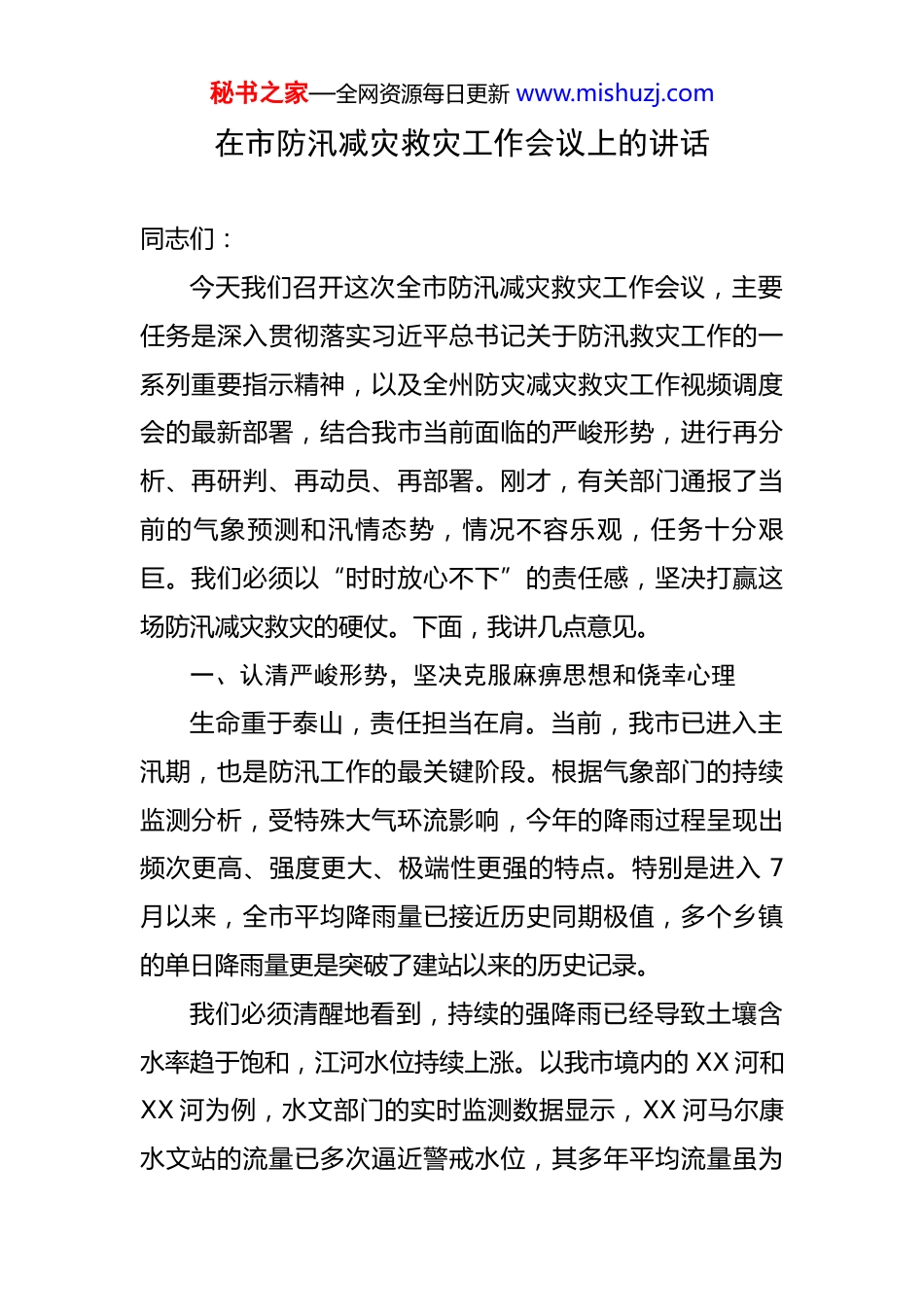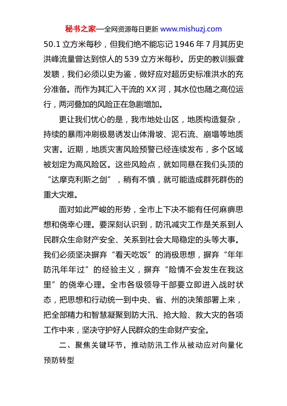 秘书之家—全网资源每日更新 www.mishuzj.com在市防汛减灾救灾工作会议上的讲话 同志们:今天我们召开这次全市防汛减灾救灾工作会议,主要任务是深入贯彻落实习近平总书记关于防汛救灾工作的一系列重要指示精神,以及全州防灾减灾救灾工作视频调度会的最新部署,结合我市当前面临的严峻形势,进行再分析、再研判、再动员、再部署。刚才,有关部门通报了当前的气象预测和汛情态势,情况不容乐观,任务十分艰巨。我们必须以“时时放心不下”的责任感,坚决打赢这场防汛减灾救灾的硬仗。下面,我讲几点意见。一、认清严峻形势,坚决克服麻痹思想和侥幸心理生命重于泰山,责任担当在肩。当前,我市已进入主汛期,也是防汛工作的最关键阶段。根据气象部门的持续监测分析,受特殊大气环流影响,今年的降雨过程呈现出频次更高、强度更大、极端性更强的特点。特别是进入 7月以来,全市平均降雨量已接近历史同期极值,多个乡镇的单日降雨量更是突破了建站以来的历史记录。我们必须清醒地看到,持续的强降雨已经导致土壤含水率趋于饱和,江河水位持续上涨。以我市境内的 XX 河和XX 河为例,水文部门的实时监测数据显示,XX 河马尔康水文站的流量已多次逼近警戒水位,其多年平均流量虽为秘书之家—全网资源每日更新 www.mishuzj.com50.1 立方米每秒,但我们绝不能忘记 1946 年 7 月其历史洪峰流量曾达到惊人的 539 立方米每秒。历史的教训振聋发聩,我们必须以史为鉴,做好应对超历史标准洪水的充分准备。而作为其汇入干流的 XX 河,其水位也随之高位运行,两河叠加的风险正在急剧增加。更让我们忧心的是,我市地处山区,地质构造复杂,持续的暴雨冲刷极易诱发山体滑坡、泥石流、崩塌等地质灾害。近期,地质灾害风险预警已经连续发布,多个区域被划定为高风险区。这些风险点,就如同悬在我们头顶的“达摩克利斯之剑”,稍有不慎,就可能造成群死群伤的重大灾难。面对如此严峻的形势,全市上下决不能有任何麻痹思想和侥幸心理。要深刻认识到,防汛减灾工作是关系到人民群众生命财产安全、关系到社会大局稳定的头等大事。我们必须坚决摒弃“看天吃饭”的消极思想,摒弃“年年防汛年年过”的经验主义,摒弃“险情不会发生在我这里”的侥幸心理。全市各级领导干部要立即进入战时状态,把思想和行动统一到中央、省、州的决策部署上来,把全部精力和智慧凝聚到防大汛、抢大险、救大灾的各项工作中来,坚决守护好人民群众的生命财产安全。二、聚焦关键环节,推动防汛工作从被动应对向量化预防转型秘书之家—全网资源每日更新 www.mishuzj.com传统的防汛工作模式,往往依赖于经验判断和灾后应急,这在应对当前频发、突发的极端天气时,已经显得力不从心。在昨天的会议上,我们深入查摆了自身存在的短板,包括降雨多频集中带来的持续压力、部分干部群众危机意识不足、工程区域点多面广难以全面兼顾、监测设备相对落后、监测手段较为单一等问题。要解决这些问题,就必须推动一场深刻的变革,核心是实现“三个转型”。第一,从“应急为主”向“预防为要”转变,核心在于数字赋能。预防是最好的减灾。我们必须把工作的关口前移,利用现代科技手段,构建全域覆盖、实时感知的监测预警网络,真正做到“防在前、预在早”。一是要构建更加精密的监测网络。目前,我市已初步建成了覆盖主要流域和地质灾害隐患点的全域气象监测体系,但还存在盲区和短板。要对照最新的技术标准,对现有设备进行全面排查升级。我们的自动雨量站,测量精度要达到 0.1 毫米分辨率,误差必须控制在国家标准±4%以内。我们的水位监测设备,要能够实时回传数据,确保数据不中断、不失真。尤其要强化对短时强降雨的监测能力,确保手持气象仪等机动设备能够第一时间抵达现场,为一线指挥提供实时气象数据支持。所有设备必须具备高防护等级,如 IP66标准,确保在高寒、高湿的恶劣环境下能稳定运行。二是要实现更加迅捷的预警响应。数据采集是基础,快速响应秘书之家—全网资源每日更新 www.mishuzj.com才是关键。我们不能满足于“发布了预警”,而要追求“预警能救命”。当前,先进地区的洪水预警时效已经从传统的...