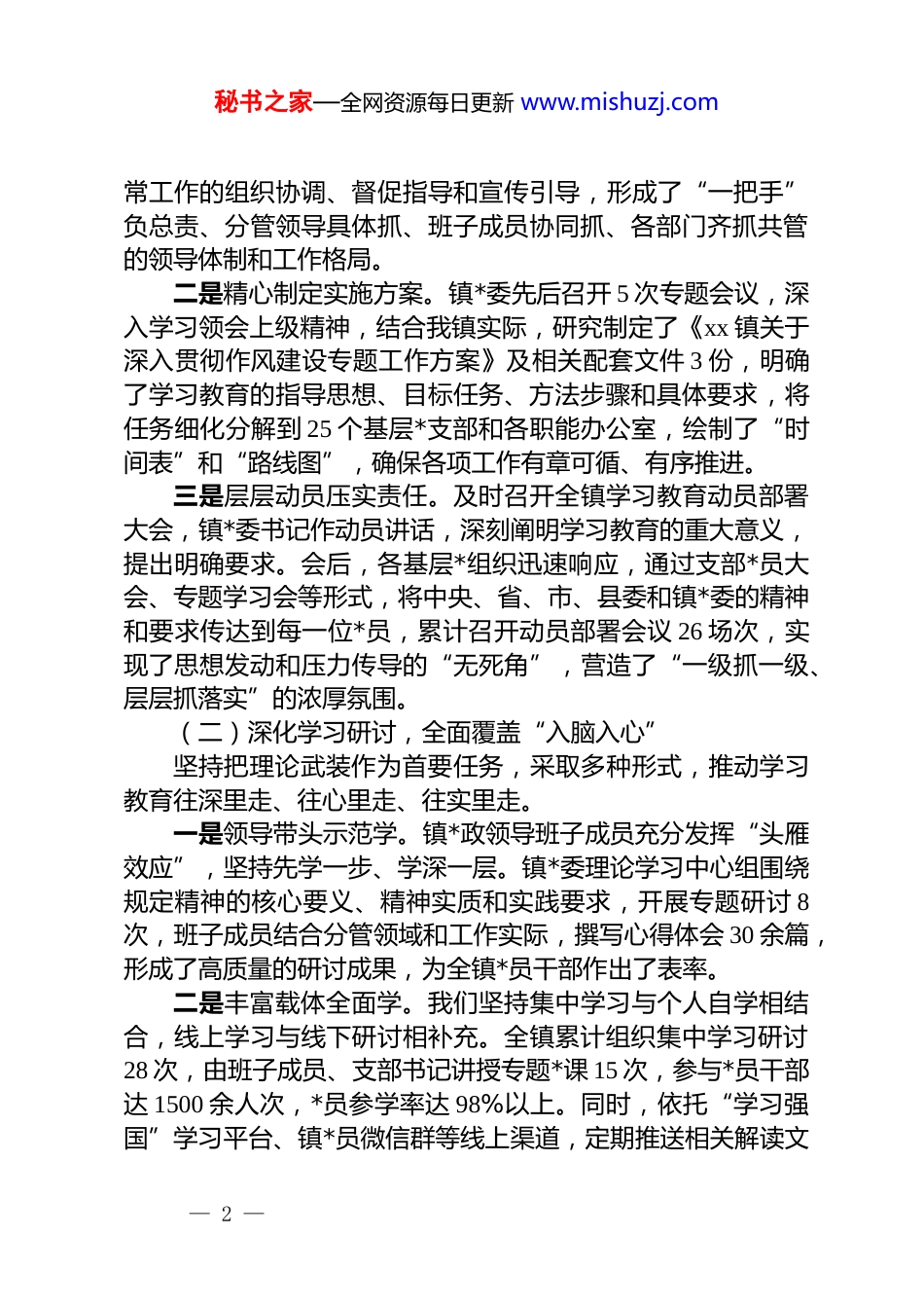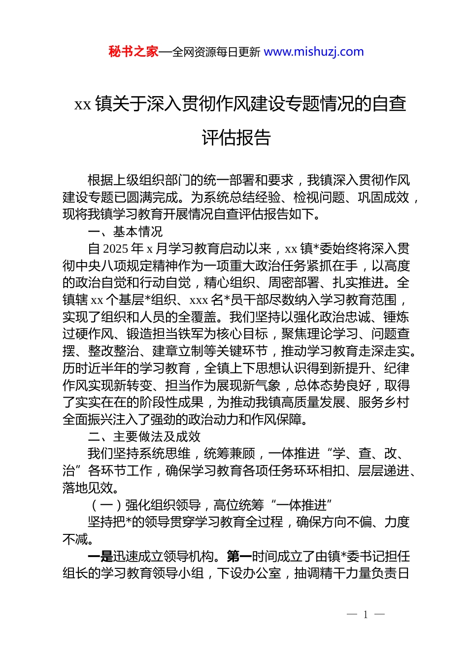 秘书之家—全网资源每日更新 www.mishuzj.comxx 镇关于深入贯彻作风建设专题情况的自查评估报告根据上级组织部门的统一部署和要求,我镇深入贯彻作风建设专题已圆满完成。为系统总结经验、检视问题、巩固成效,现将我镇学习教育开展情况自查评估报告如下。一、基本情况自 2025 年 x 月学习教育启动以来,xx 镇*委始终将深入贯彻中央八项规定精神作为一项重大政治任务紧抓在手,以高度的政治自觉和行动自觉,精心组织、周密部署、扎实推进。全镇辖 xx 个基层*组织、xxx 名*员干部尽数纳入学习教育范围,实现了组织和人员的全覆盖。我们坚持以强化政治忠诚、锤炼过硬作风、锻造担当铁军为核心目标,聚焦理论学习、问题查摆、整改整治、建章立制等关键环节,推动学习教育走深走实。历时近半年的学习教育,全镇上下思想认识得到新提升、纪律作风实现新转变、担当作为展现新气象,总体态势良好,取得了实实在在的阶段性成果,为推动我镇高质量发展、服务乡村全面振兴注入了强劲的政治动力和作风保障。二、主要做法及成效我们坚持系统思维,统筹兼顾,一体推进“学、查、改、治”各环节工作,确保学习教育各项任务环环相扣、层层递进、落地见效。(一)强化组织领导,高位统筹“一体推进”坚持把*的领导贯穿学习教育全过程,确保方向不偏、力度不减。一是迅速成立领导机构。第一时间成立了由镇*委书记担任组长的学习教育领导小组,下设办公室,抽调精干力量负责日— 1 —秘书之家—全网资源每日更新 www.mishuzj.com常工作的组织协调、督促指导和宣传引导,形成了“一把手”负总责、分管领导具体抓、班子成员协同抓、各部门齐抓共管的领导体制和工作格局。二是精心制定实施方案。镇*委先后召开 5 次专题会议,深入学习领会上级精神,结合我镇实际,研究制定了《xx 镇关于深入贯彻作风建设专题工作方案》及相关配套文件 3 份,明确了学习教育的指导思想、目标任务、方法步骤和具体要求,将任务细化分解到 25 个基层*支部和各职能办公室,绘制了“时间表”和“路线图”,确保各项工作有章可循、有序推进。三是层层动员压实责任。及时召开全镇学习教育动员部署大会,镇*委书记作动员讲话,深刻阐明学习教育的重大意义,提出明确要求。会后,各基层*组织迅速响应,通过支部*员大会、专题学习会等形式,将中央、省、市、县委和镇*委的精神和要求传达到每一位*员,累计召开动员部署会议 26 场次,实现了思想发动和压力传导的“无死角”,营造了“一级抓一级、层层抓落实”的浓厚氛围。(二)深化学习研讨,全面覆盖“入脑入心”坚持把理论武装作为首要任务,采取多种形式,推动学习教育往深里走、往心里走、往实里走。一是领导带头示范学。镇*政领导班子成员充分发挥“头雁效应”,坚持先学一步、学深一层。镇*委理论学习中心组围绕规定精神的核心要义、精神实质和实践要求,开展专题研讨 8次,班子成员结合分管领域和工作实际,撰写心得体会 30 余篇,形成了高质量的研讨成果,为全镇*员干部作出了表率。二是丰富载体全面学。我们坚持集中学习与个人自学相结合,线上学习与线下研讨相补充。全镇累计组织集中学习研讨28 次,由班子成员、支部书记讲授专题*课 15 次,参与*员干部达 1500 余人次,*员参学率达 98%以上。同时,依托“学习强国”学习平台、镇*员微信群等线上渠道,定期推送相关解读文— 2 —秘书之家—全网资源每日更新 www.mishuzj.com章、警示教育案例等学习资料 120 余篇,组织线上专题知识测试 3 次,参考率达到 100%,有效解决了部分在外流动*员学习不便的难题,确保了学习教育的全覆盖和时效性。三是结合实际融入学。我们强调学以致用、学用相长,将学习研讨与我镇中心工作紧密结合。在学习中,组织*员干部围绕“如何以优良作风保障 xx 特色茶产业发展”“如何破解 xx文旅项目推进中的瓶颈”等议题展开热烈讨论,引导大家把学习成果转化为谋划工作的思路、破解难题的办法和推动发展的能力,实现了学习教育与事业发展的深度融合、同频共振。(三)坚持问题导向,深刻查摆“动真碰硬”我们以刀刃向内的勇气和自我革命的精神,广开言...