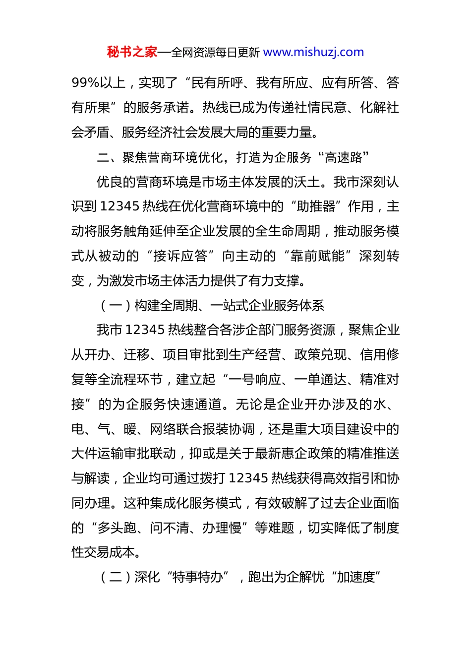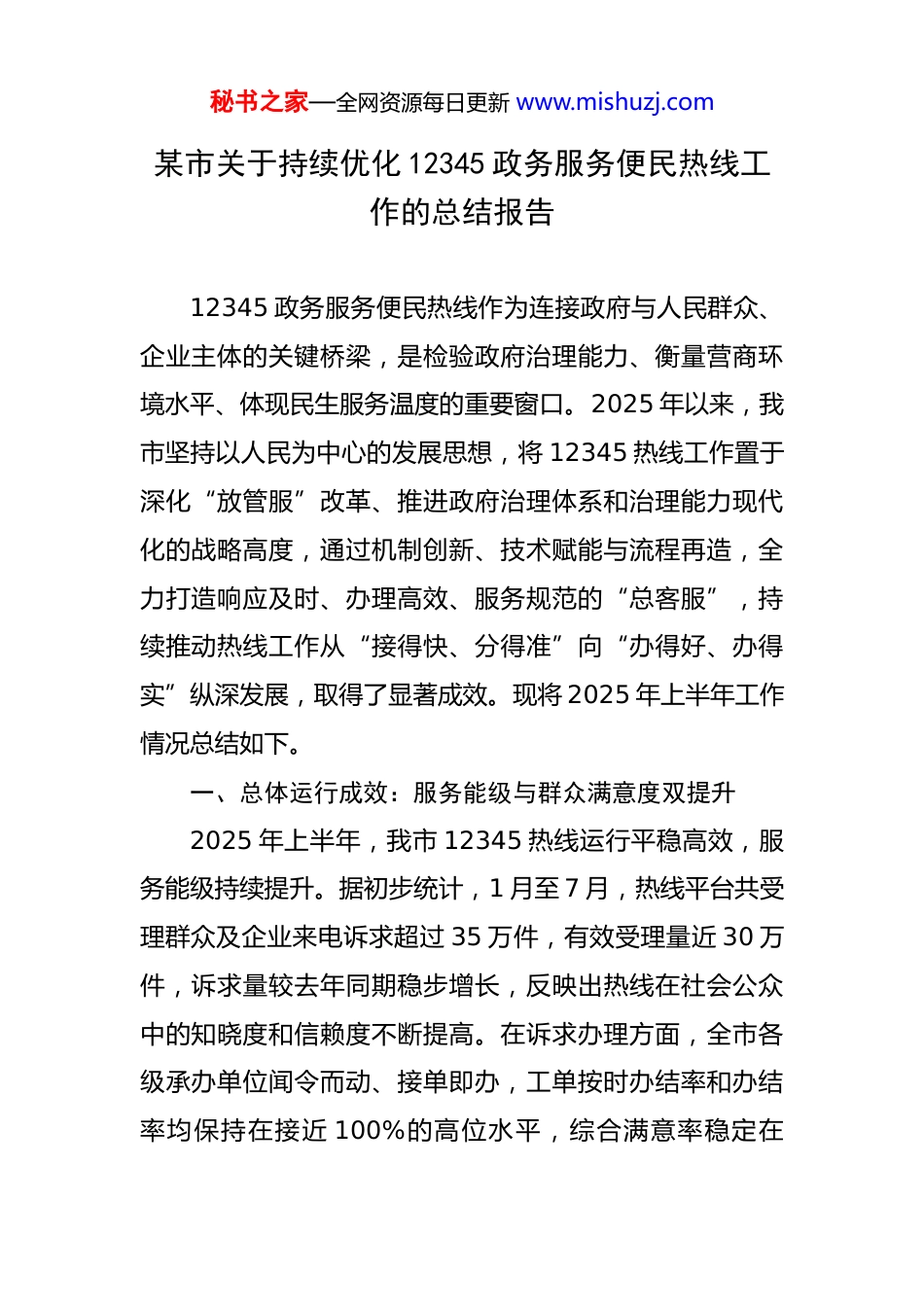 秘书之家—全网资源每日更新 www.mishuzj.com某市关于持续优化 12345 政务服务便民热线工作的总结报告 12345 政务服务便民热线作为连接政府与人民群众、企业主体的关键桥梁,是检验政府治理能力、衡量营商环境水平、体现民生服务温度的重要窗口。2025 年以来,我市坚持以人民为中心的发展思想,将 12345 热线工作置于深化“放管服”改革、推进政府治理体系和治理能力现代化的战略高度,通过机制创新、技术赋能与流程再造,全力打造响应及时、办理高效、服务规范的“总客服”,持续推动热线工作从“接得快、分得准”向“办得好、办得实”纵深发展,取得了显著成效。现将 2025 年上半年工作情况总结如下。一、总体运行成效:服务能级与群众满意度双提升2025 年上半年,我市 12345 热线运行平稳高效,服务能级持续提升。据初步统计,1 月至 7 月,热线平台共受理群众及企业来电诉求超过 35 万件,有效受理量近 30 万件,诉求量较去年同期稳步增长,反映出热线在社会公众中的知晓度和信赖度不断提高。在诉求办理方面,全市各级承办单位闻令而动、接单即办,工单按时办结率和办结率均保持在接近 100%的高位水平,综合满意率稳定在秘书之家—全网资源每日更新 www.mishuzj.com99%以上,实现了“民有所呼、我有所应、应有所答、答有所果”的服务承诺。热线已成为传递社情民意、化解社会矛盾、服务经济社会发展大局的重要力量。二、聚焦营商环境优化,打造为企服务“高速路”优良的营商环境是市场主体发展的沃土。我市深刻认识到 12345 热线在优化营商环境中的“助推器”作用,主动将服务触角延伸至企业发展的全生命周期,推动服务模式从被动的“接诉应答”向主动的“靠前赋能”深刻转变,为激发市场主体活力提供了有力支撑。(一)构建全周期、一站式企业服务体系我市 12345 热线整合各涉企部门服务资源,聚焦企业从开办、迁移、项目审批到生产经营、政策兑现、信用修复等全流程环节,建立起“一号响应、一单通达、精准对接”的为企服务快速通道。无论是企业开办涉及的水、电、气、暖、网络联合报装协调,还是重大项目建设中的大件运输审批联动,抑或是关于最新惠企政策的精准推送与解读,企业均可通过拨打 12345 热线获得高效指引和协同办理。这种集成化服务模式,有效破解了过去企业面临的“多头跑、问不清、办理慢”等难题,切实降低了制度性交易成本。(二)深化“特事特办”,跑出为企解忧“加速度”秘书之家—全网资源每日更新 www.mishuzj.com在服务企业的实践中,我市 12345 热线始终秉持“特事特办、急事急办”的服务原则,建立涉企诉求优先派发、优先办理、优先反馈的绿色通道。上半年,*区某印刷企业在线上成功申请了印刷品经营许可证,但因流程衔接问题迟迟未能收到实体证件,影响了正常业务开展。企业负责人焦急之下拨通了 12345 热线。热线平台接报后,立即将该诉求标记为“加急”,第一时间通过“*商通”企业服务专席流转至市委*部。相关负责同志收到工单后高度重视,立即启动应急处理程序,委派工作人员于当日下午即赴企业现场进行核验。在确认所有材料真实无误后,当场为企业发放了许可证,解决了企业的燃眉之急。企业负责人对此高度赞扬,称“没想到一个电话真能解决大问题,*市的服务效率让人暖心、放心”。此类案例的成功处置,不仅为企业赢得了宝贵时间,更擦亮了我市亲商、安商、富商的营商环境“金字招牌”。三、紧扣民生福祉改善,筑牢为民解忧“连心桥”民生无小事,枝叶总关情。我市 12345 热线始终将保障和改善民生作为工作的出发点和落脚点,积极响应党中央、国务院关于“高效办成一件事”的重大决策部署,聚焦人民群众最关心、最直接、最现实的利益问题,推动服务整合与流程优化,全力将群众的“问题清单”转化为政秘书之家—全网资源每日更新 www.mishuzj.com府的“服务清单”和群众的“满意清单”。(一)推动“一件事一次办”,提升群众办事便捷度围绕新生儿出生、教育升学、社保卡申领激活、医保异地报销结算、老年人居家适老化改造、大宗消费品以旧换新、公民退休手续联办等一系列高频民生事项,12345热线积极发挥...