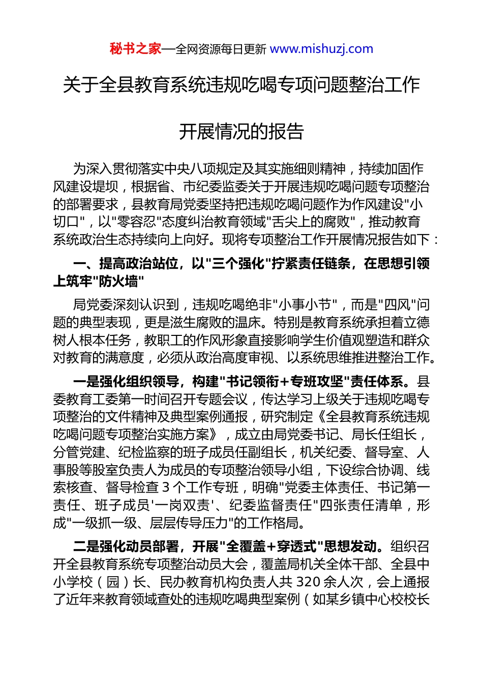 秘书之家—全网资源每日更新 www.mishuzj.com关于全县教育系统违规吃喝专项问题整治工作开展情况的报告为深入贯彻落实中央八项规定及其实施细则精神,持续加固作风建设堤坝,根据省、市纪委监委关于开展违规吃喝问题专项整治的部署要求,县教育局党委坚持把违规吃喝问题作为作风建设"小切口",以"零容忍"态度纠治教育领域"舌尖上的腐败",推动教育系统政治生态持续向上向好。现将专项整治工作开展情况报告如下:一、提高政治站位,以"三个强化"拧紧责任链条,在思想引领上筑牢"防火墙"局党委深刻认识到,违规吃喝绝非"小事小节",而是"四风"问题的典型表现,更是滋生腐败的温床。特别是教育系统承担着立德树人根本任务,教职工的作风形象直接影响学生价值观塑造和群众对教育的满意度,必须从政治高度审视、以系统思维推进整治工作。一是强化组织领导,构建"书记领衔+专班攻坚"责任体系。县委教育工委第一时间召开专题会议,传达学习上级关于违规吃喝专项整治的文件精神及典型案例通报,研究制定《全县教育系统违规吃喝问题专项整治实施方案》,成立由局党委书记、局长任组长,分管党建、纪检监察的班子成员任副组长,机关纪委、督导室、人事股等股室负责人为成员的专项整治领导小组,下设综合协调、线索核查、督导检查 3 个工作专班,明确"党委主体责任、书记第一责任、班子成员'一岗双责'、纪委监督责任"四张责任清单,形成"一级抓一级、层层传导压力"的工作格局。二是强化动员部署,开展"全覆盖+穿透式"思想发动。组织召开全县教育系统专项整治动员大会,覆盖局机关全体干部、全县中小学校(园)长、民办教育机构负责人共 320 余人次,会上通报了近年来教育领域查处的违规吃喝典型案例(如某乡镇中心校校长秘书之家—全网资源每日更新 www.mishuzj.com借教研活动之名组织教师聚餐并饮酒、某民办学校负责人通过"家长答谢宴"变相收受礼品等问题),用"身边事"警醒"身边人"。同步印发《致全县教职工的一封公开信》,明确"十严禁"纪律要求(包括严禁接受管理和服务对象宴请、严禁以教研培训名义组织高消费餐饮活动、严禁借婚丧嫁娶事宜大操大办借机敛财等),通过校园公众号、家长群、公示栏等多渠道公开,推动纪律规矩入脑入心。三是强化压力传导,建立"书记约谈+签字背书"推进机制。局党委书记与全县 42 所中小学、18 所幼儿园党组织书记开展"一对一"廉政谈话,重点了解班子成员是否存在违规吃喝苗头性问题,要求党组织书记签订《违规吃喝问题专项整治责任承诺书》,承诺"管好自己的人、守好自己的门"。各学校同步召开教职工大会,组织签订《个人廉洁自律承诺书》5600 余份,将整治要求延伸到每一名教职工(含临聘人员),构建起"横向到边、纵向到底"的责任网络。二、坚持问题导向,以"三个聚焦"深挖病灶根源,在精准施治上打好"组合拳"我们坚持把发现问题作为整治工作的关键环节,既紧盯"关键少数",又关注"绝大多数",通过"自己查、群众提、上级点"相结合的方式,全面起底教育系统违规吃喝问题。一是聚焦"重点领域",开展"拉网式"自查自纠。围绕"公务接待、教研活动、校际交流、家长接待"等易发多发场景,制定《违规吃喝问题自查清单》,细化 12 类具体表现(如超标准接待、虚列开支报销吃喝费用、借课题研究名义组织聚餐、通过家长委员会变相安排宴请等)。要求各学校对照清单开展"三查三看":查财务账目,看是否存在"化整为零"报销餐饮费用、虚列"培训费""资料费"套取资金用于吃喝等问题;查活动记录,看是否存在以教研、家访、志愿服务等名义组织无实质内容的聚餐活动;查群众反映,看是否存在教职工接受家长宴请、违规参加"谢师宴""升学宴"等问秘书之家—全网资源每日更新 www.mishuzj.com题。全县共排查公务接待单据 1200 余份、教研活动记录 800 余本、家长委员会台账 500 余份,发现一般性苗头问题 17 个(如个别学校存在接待清单填写不规范、教研活动后简单聚餐未报备等问题),均已当场整改。二是聚焦"关键少数",开展"点穴式"线索核查。建立"班子成员联片、股室包校、纪检干部驻点"的线索摸排机制,由局领导班子成员带队,深入 11 个学区、28 ...