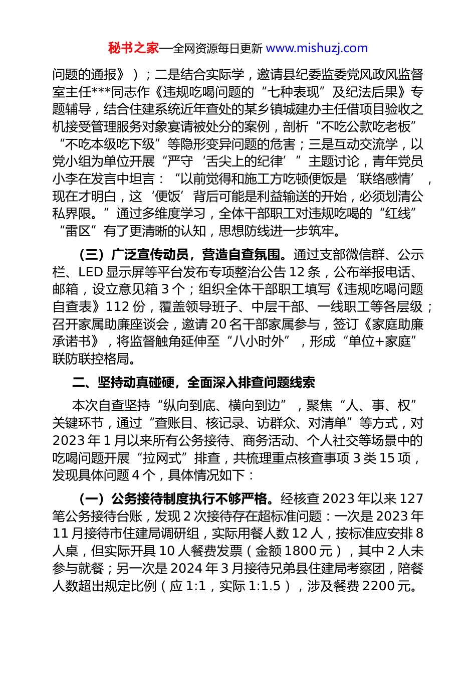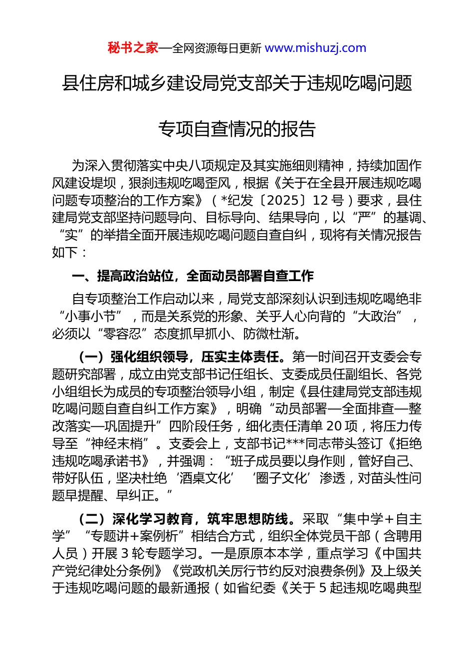 秘书之家—全网资源每日更新 www.mishuzj.com县住房和城乡建设局党支部关于违规吃喝问题专项自查情况的报告为深入贯彻落实中央八项规定及其实施细则精神,持续加固作风建设堤坝,狠刹违规吃喝歪风,根据《关于在全县开展违规吃喝问题专项整治的工作方案》(*纪发〔2025〕12 号)要求,县住建局党支部坚持问题导向、目标导向、结果导向,以“严”的基调、“实”的举措全面开展违规吃喝问题自查自纠,现将有关情况报告如下:一、提高政治站位,全面动员部署自查工作自专项整治工作启动以来,局党支部深刻认识到违规吃喝绝非“小事小节”,而是关系党的形象、关乎人心向背的“大政治”,必须以“零容忍”态度抓早抓小、防微杜渐。(一)强化组织领导,压实主体责任。第一时间召开支委会专题研究部署,成立由党支部书记任组长、支委成员任副组长、各党小组组长为成员的专项整治领导小组,制定《县住建局党支部违规吃喝问题自查自纠工作方案》,明确“动员部署—全面排查—整改落实—巩固提升”四阶段任务,细化责任清单 20 项,将压力传导至“神经末梢”。支委会上,支部书记***同志带头签订《拒绝违规吃喝承诺书》,并强调:“班子成员要以身作则,管好自己、带好队伍,坚决杜绝‘酒桌文化’‘圈子文化’渗透,对苗头性问题早提醒、早纠正。”(二)深化学习教育,筑牢思想防线。采取“集中学+自主学”“专题讲+案例析”相结合方式,组织全体党员干部(含聘用人员)开展 3 轮专题学习。一是原原本本学,重点学习《中国共产党纪律处分条例》《党政机关厉行节约反对浪费条例》及上级关于违规吃喝问题的最新通报(如省纪委《关于 5 起违规吃喝典型秘书之家—全网资源每日更新 www.mishuzj.com问题的通报》);二是结合实际学,邀请县纪委监委党风政风监督室主任***同志作《违规吃喝问题的“七种表现”及纪法后果》专题辅导,结合住建系统近年查处的某乡镇城建办主任借项目验收之机接受管理服务对象宴请被处分的案例,剖析“不吃公款吃老板”“不吃本级吃下级”等隐形变异问题的危害;三是互动交流学,以党小组为单位开展“严守‘舌尖上的纪律’”主题讨论,青年党员小李在发言中坦言:“以前觉得和施工方吃顿便饭是‘联络感情’,现在才明白,这‘便饭’背后可能是利益输送的开始,必须划清公私界限。”通过多维度学习,全体干部职工对违规吃喝的“红线”“雷区”有了更清晰的认知,思想防线进一步筑牢。(三)广泛宣传动员,营造自查氛围。通过支部微信群、公示栏、LED 显示屏等平台发布专项整治公告 12 条,公布举报电话、邮箱,设立意见箱 3 个;组织全体干部职工填写《违规吃喝问题自查表》112 份,覆盖领导班子、中层干部、一线职工等各层级;召开家属助廉座谈会,邀请 20 名干部家属参与,签订《家庭助廉承诺书》,将监督触角延伸至“八小时外”,形成“单位+家庭”联防联控格局。二、坚持动真碰硬,全面深入排查问题线索本次自查坚持“纵向到底、横向到边”,聚焦“人、事、权”关键环节,通过“查账目、核记录、访群众、对清单”等方式,对2023 年 1 月以来所有公务接待、商务活动、个人社交等场景中的吃喝问题开展“拉网式”排查,共梳理重点核查事项 3 类 15 项,发现具体问题 4 个,具体情况如下:(一)公务接待制度执行不够严格。经核查 2023 年以来 127笔公务接待台账,发现 2 次接待存在超标准问题:一次是 2023 年11 月接待市住建局调研组,实际用餐人数 12 人,按标准应安排 8人桌,但实际开具 10 人餐费发票(金额 1800 元),其中 2 人未参与就餐;另一次是 2024 年 3 月接待兄弟县住建局考察团,陪餐人数超出规定比例(应 1:1,实际 1:1.5),涉及餐费 2200 元。秘书之家—全网资源每日更新 www.mishuzj.com问题根源在于经办人员对最新《**县党政机关公务接待管理办法》(2024 年修订版)学习不深,误以为“接待上级可适当放宽标准”,加之财务审核环节仅核对票据合规性,未严格核查就餐人数与审批单是否一致。(二)个别干部存在“不吃公款吃老板”倾向。通过访谈项目管理人员、查阅企业座谈会记录发现,2024...