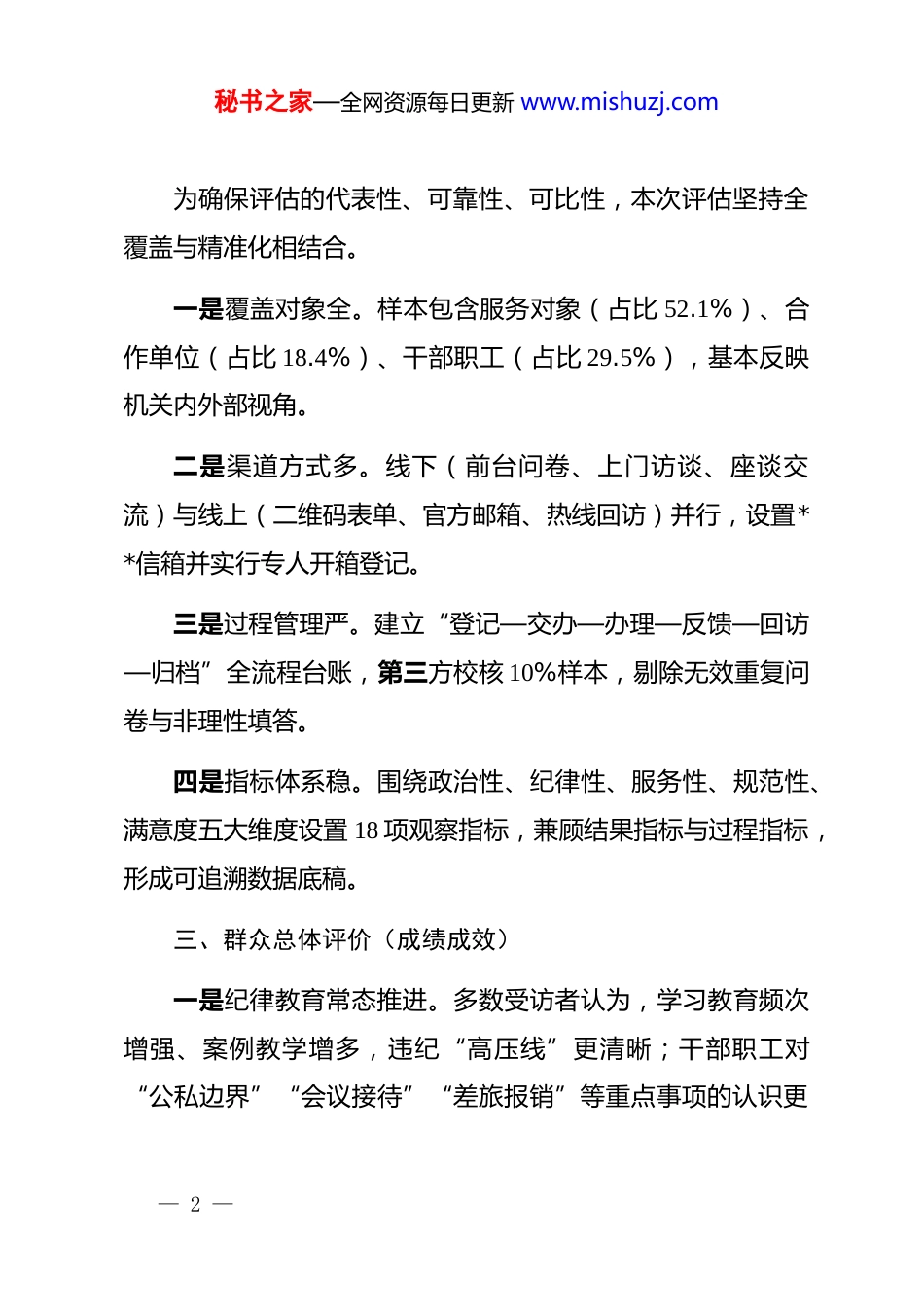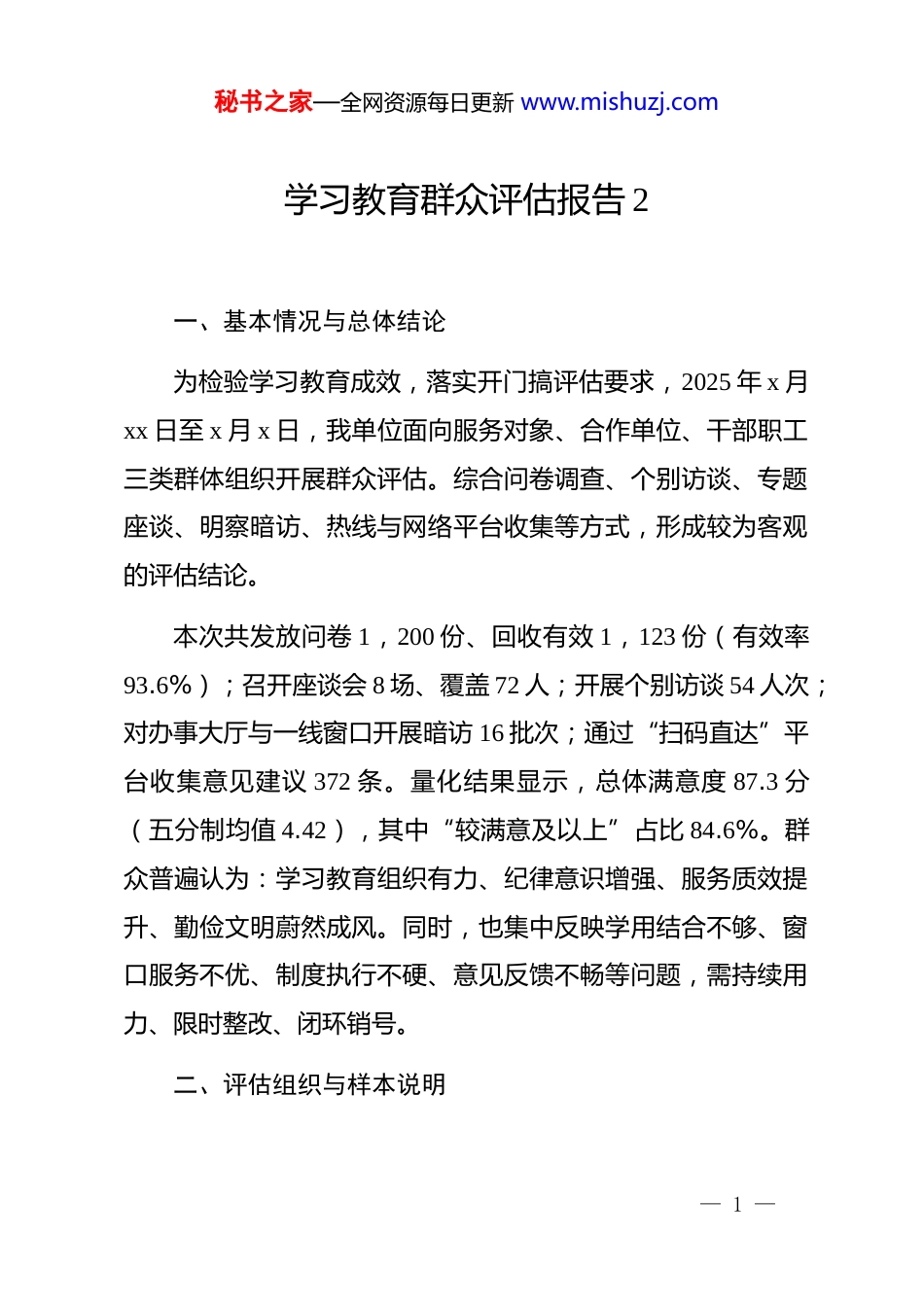 秘书之家—全网资源每日更新 www.mishuzj.com学习教育群众评估报告 2一、基本情况与总体结论为检验学习教育成效,落实开门搞评估要求,2025 年 x 月xx 日至 x 月 x 日,我单位面向服务对象、合作单位、干部职工三类群体组织开展群众评估。综合问卷调查、个别访谈、专题座谈、明察暗访、热线与网络平台收集等方式,形成较为客观的评估结论。本次共发放问卷 1,200 份、回收有效 1,123 份(有效率93.6%);召开座谈会 8 场、覆盖 72 人;开展个别访谈 54 人次;对办事大厅与一线窗口开展暗访 16 批次;通过“扫码直达”平台收集意见建议 372 条。量化结果显示,总体满意度 87.3 分(五分制均值 4.42),其中“较满意及以上”占比 84.6%。群众普遍认为:学习教育组织有力、纪律意识增强、服务质效提升、勤俭文明蔚然成风。同时,也集中反映学用结合不够、窗口服务不优、制度执行不硬、意见反馈不畅等问题,需持续用力、限时整改、闭环销号。二、评估组织与样本说明— 1 —秘书之家—全网资源每日更新 www.mishuzj.com为确保评估的代表性、可靠性、可比性,本次评估坚持全覆盖与精准化相结合。一是覆盖对象全。样本包含服务对象(占比 52.1%)、合作单位(占比 18.4%)、干部职工(占比 29.5%),基本反映机关内外部视角。二是渠道方式多。线下(前台问卷、上门访谈、座谈交流)与线上(二维码表单、官方邮箱、热线回访)并行,设置**信箱并实行专人开箱登记。三是过程管理严。建立“登记—交办—办理—反馈—回访—归档”全流程台账,第三方校核 10%样本,剔除无效重复问卷与非理性填答。四是指标体系稳。围绕政治性、纪律性、服务性、规范性、满意度五大维度设置 18 项观察指标,兼顾结果指标与过程指标,形成可追溯数据底稿。三、群众总体评价(成绩成效)一是纪律教育常态推进。多数受访者认为,学习教育频次增强、案例教学增多,违纪“高压线”更清晰;干部职工对“公私边界”“会议接待”“差旅报销”等重点事项的认识更— 2 —秘书之家—全网资源每日更新 www.mishuzj.com为明确(同类知识测验平均正确率由 78.4%提升至 91.2%)。二是服务效率明显改善。窗口“平均等待时长”由 23 分钟降至 14 分钟,“一次办结率”由 72%升至 86%,“午间不断档”覆盖率提升至 92%,群众“跑一次”感知增强。三是厉行节约持续走深。公务用车、会议培训、公务接待等支出同比下降 14.8%,务实节俭、反对铺张浪费成为共识;内部监督抽查问题发现率环比下降 21.5%。四是制度规范逐项完善。修订完善议事规则、财务报销、物资采购、礼品礼金登记等制度 17 项,新增关键岗位风险点防控清单 28 条,管理闭环更为清晰。【案例 1】在“简化材料证明”专项行动中,梳理高频事项 42 项,取消重复提交材料 19 项、合并证明 6 项,办理时长平均缩短 25%。四、突出问题与典型表现(群众反映集中的痛点)一是学用结合不够精准。群众反映,学习内容偏“读文件、念规定”,缺少岗位化、场景化指引。问卷显示,67.3%的受访者希望尽快编制“岗位常见风险与处置要点”操作手册;在“礼品礼金处置”“加班用餐标准”“同城差旅报销边界”等— 3 —秘书之家—全网资源每日更新 www.mishuzj.com细节上仍存在把握不准情况。【案例 2】某科室在节假日前收到合作单位赠送土特产,先“收后退”,虽按规定上交退回,但对外形象受损,暴露事前拒收机制不健全。二是窗口服务仍有短板。暗访发现个别岗位存在“低头看手机、答复不完整、指引不到位”等现象;服务礼仪与文明用语执行不稳定,投诉主要集中于“指路不清、来回折返”。【数据提示】近三个月服务态度相关不满意反馈占全部不满意的 38.6%,集中于少数高频窗口时段。三是制度执行弹性偏大。个别环节存在“熟人走捷径”的感知风险,个别流程存在“先口头承诺、后补手续”的不规范行为;业务交接不严导致“重复问询、信息丢失”。【数据提示】随机复核 120 宗业务,发现资料补录不及时、流转记录不完整问题率 2.5%。四是意见反馈闭环不严密。群众普遍认可“有人收集”,但期望“有人回复、有处...