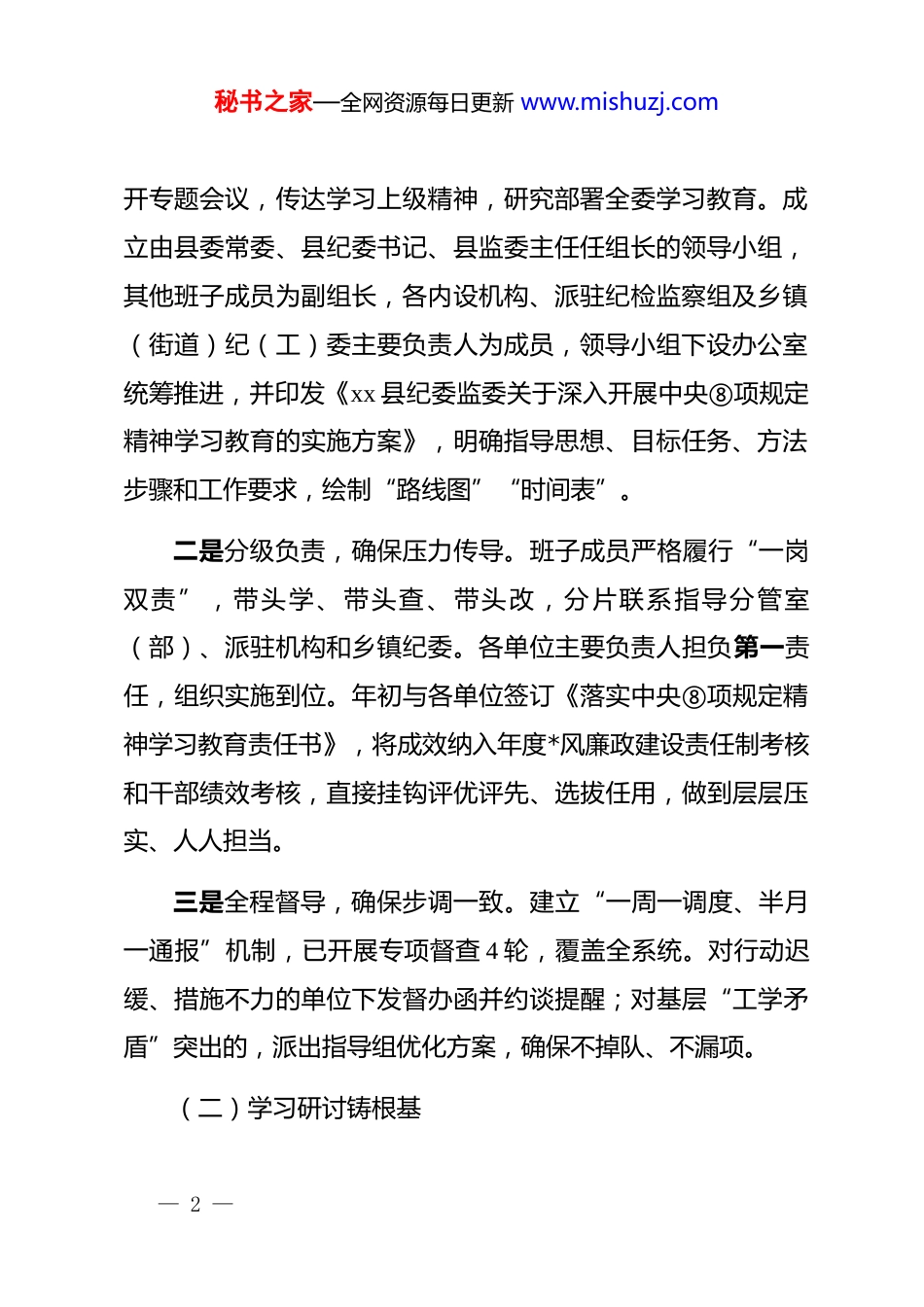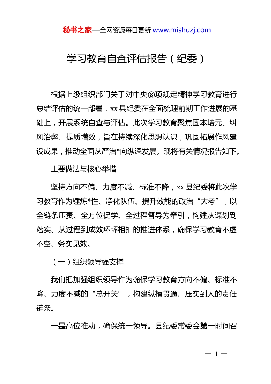 秘书之家—全网资源每日更新 www.mishuzj.com学习教育自查评估报告(纪委)根据上级组织部门关于对中央⑧项规定精神学习教育进行总结评估的统一部署,xx 县纪委在全面梳理前期工作进展的基础上,开展系统自查与评估。此次学习教育聚焦固本培元、纠风治弊、提质增效,旨在持续深化思想认识,巩固拓展作风建设成果,推动全面从严治*向纵深发展。现将有关情况报告如下。主要做法与核心举措坚持方向不偏、力度不减、标准不降,xx 县纪委将此次学习教育作为锤炼*性、净化队伍、提升效能的政治“大考”,以全链条压责、全方位促学、全过程督导为牵引,构建从谋划到落实、从过程到成效环环相扣的推进体系,确保学习教育不虚不空、务实见效。(一)组织领导强支撑我们把加强组织领导作为确保学习教育方向不偏、标准不降、力度不减的“总开关”,构建纵横贯通、压实到人的责任链条。一是高位推动,确保统一领导。县纪委常委会第一时间召— 1 —秘书之家—全网资源每日更新 www.mishuzj.com开专题会议,传达学习上级精神,研究部署全委学习教育。成立由县委常委、县纪委书记、县监委主任任组长的领导小组,其他班子成员为副组长,各内设机构、派驻纪检监察组及乡镇(街道)纪(工)委主要负责人为成员,领导小组下设办公室统筹推进,并印发《xx 县纪委监委关于深入开展中央⑧项规定精神学习教育的实施方案》,明确指导思想、目标任务、方法步骤和工作要求,绘制“路线图”“时间表”。二是分级负责,确保压力传导。班子成员严格履行“一岗双责”,带头学、带头查、带头改,分片联系指导分管室(部)、派驻机构和乡镇纪委。各单位主要负责人担负第一责任,组织实施到位。年初与各单位签订《落实中央⑧项规定精神学习教育责任书》,将成效纳入年度*风廉政建设责任制考核和干部绩效考核,直接挂钩评优评先、选拔任用,做到层层压实、人人担当。三是全程督导,确保步调一致。建立“一周一调度、半月一通报”机制,已开展专项督查 4 轮,覆盖全系统。对行动迟缓、措施不力的单位下发督办函并约谈提醒;对基层“工学矛盾”突出的,派出指导组优化方案,确保不掉队、不漏项。(二)学习研讨铸根基— 2 —秘书之家—全网资源每日更新 www.mishuzj.com坚持以学铸魂、以学正风、以学促干,构建分层分类、贯通融合的学习体系。一是领导带头,示范引领。截至目前,理论学习中心组专题学习 6 次、专题研讨 4 次,原原本本学习中央⑧项规定及配套法规、******关于作风建设的重要论述,结合 xx 地区及全国典型案例深析研判,班子成员撰写心得体会 20 余篇,形成“作风建设永远在路上、纠治‘四风’寸步不能让”的共识。二是全员覆盖,立体推进。实行“集中培训+线上课堂+岗位微学”。举办专题培训班和辅导讲座 15 期,累计培训 1500余人次,实现全员轮训;依托“xx 智慧纪检”开设专栏、组织线上测试,参与率达 100%;推广“班前十分钟、午间半小时”微学习、微讨论,做到常学常新、学用相长。三是警示震慑,以案明纪。集中观看《作风建设永远在路上》《持续发力纵深推进》等专题片,选取近年县内及周边违反中央⑧项规定精神典型案例 30 余件,由业务骨干以案说法;分批组织 400 余名干部赴 xx 市廉政教育基地现场教学,促使广大干部把“红线不可逾越、底线不可触碰”内化于心、外化于行。— 3 —秘书之家—全网资源每日更新 www.mishuzj.com(三)查摆剖析找病灶坚持问题导向,刀刃向内找差距、挖根源、明方向。一是明确范围,精准对焦。印发《关于聚焦中央⑧项规定精神深入查摆问题的通知》,围绕文山会海、检查考核过多过滥、超标准公务接待、违规配备使用公车、违规收送礼品礼金、形式主义官僚主义新变种等 12 个方面逐项查摆;同步检视监督执纪问责中的作风短板,如监督检查“走过场”、执纪问责“宽松软”等。二是拓宽渠道,全面覆盖。构建“自己找、群众提、上级点、互相帮”的查找机制,组织全体干部逐项自查形成个人问题清单;在官方网站和微信公众号开设“作风建设意见箱”,设置匿名邮箱,广泛征求意见;召开 4 场座谈会,邀请人大代表、政协委员、特约监...