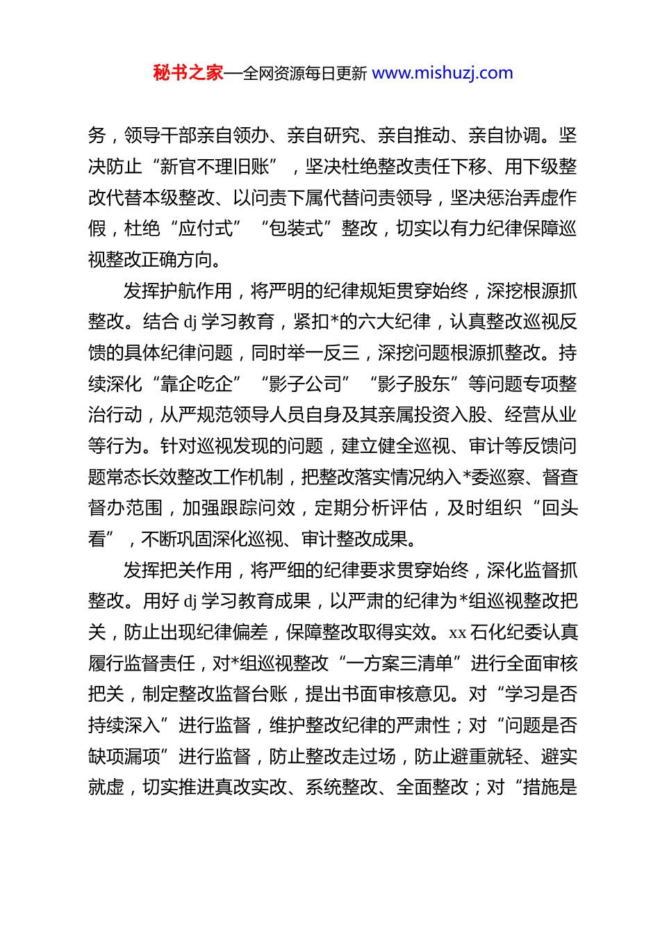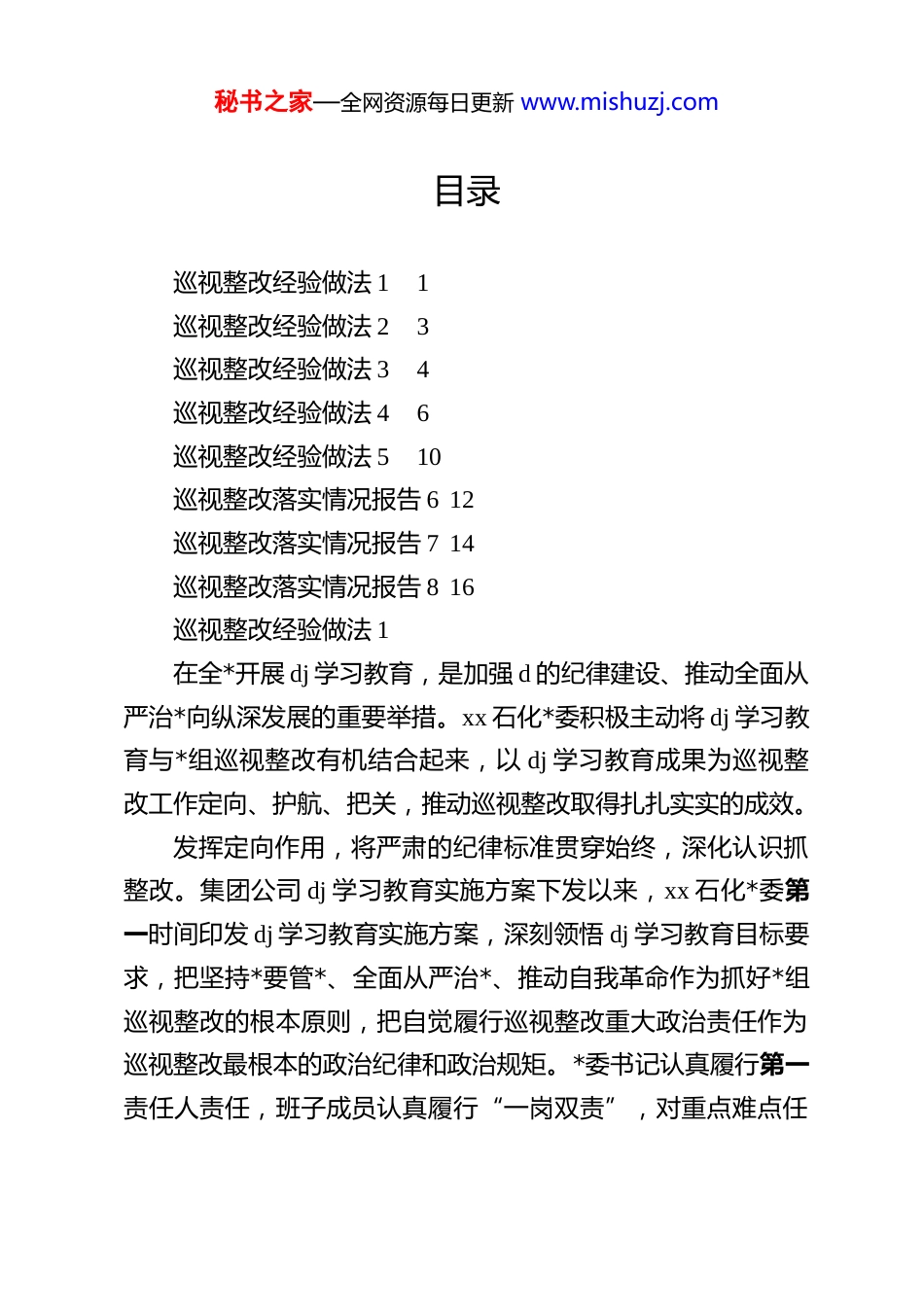 秘书之家—全网资源每日更新 www.mishuzj.com目录巡视整改经验做法 11巡视整改经验做法 23巡视整改经验做法 34巡视整改经验做法 46巡视整改经验做法 510巡视整改落实情况报告 6 12巡视整改落实情况报告 7 14巡视整改落实情况报告 8 16巡视整改经验做法 1在全*开展 dj 学习教育,是加强 d 的纪律建设、推动全面从严治*向纵深发展的重要举措。xx 石化*委积极主动将 dj 学习教育与*组巡视整改有机结合起来,以 dj 学习教育成果为巡视整改工作定向、护航、把关,推动巡视整改取得扎扎实实的成效。发挥定向作用,将严肃的纪律标准贯穿始终,深化认识抓整改。集团公司 dj 学习教育实施方案下发以来,xx 石化*委第一时间印发 dj 学习教育实施方案,深刻领悟 dj 学习教育目标要求,把坚持*要管*、全面从严治*、推动自我革命作为抓好*组巡视整改的根本原则,把自觉履行巡视整改重大政治责任作为巡视整改最根本的政治纪律和政治规矩。*委书记认真履行第一责任人责任,班子成员认真履行“一岗双责”,对重点难点任秘书之家—全网资源每日更新 www.mishuzj.com务,领导干部亲自领办、亲自研究、亲自推动、亲自协调。坚决防止“新官不理旧账”,坚决杜绝整改责任下移、用下级整改代替本级整改、以问责下属代替问责领导,坚决惩治弄虚作假,杜绝“应付式”“包装式”整改,切实以有力纪律保障巡视整改正确方向。发挥护航作用,将严明的纪律规矩贯穿始终,深挖根源抓整改。结合 dj 学习教育,紧扣*的六大纪律,认真整改巡视反馈的具体纪律问题,同时举一反三,深挖问题根源抓整改。持续深化“靠企吃企”“影子公司”“影子股东”等问题专项整治行动,从严规范领导人员自身及其亲属投资入股、经营从业等行为。针对巡视发现的问题,建立健全巡视、审计等反馈问题常态长效整改工作机制,把整改落实情况纳入*委巡察、督查督办范围,加强跟踪问效,定期分析评估,及时组织“回头看”,不断巩固深化巡视、审计整改成果。发挥把关作用,将严细的纪律要求贯穿始终,深化监督抓整改。用好 dj 学习教育成果,以严肃的纪律为*组巡视整改把关,防止出现纪律偏差,保障整改取得实效。xx 石化纪委认真履行监督责任,对*组巡视整改“一方案三清单”进行全面审核把关,制定整改监督台账,提出书面审核意见。对“学习是否持续深入”进行监督,维护整改纪律的严肃性;对“问题是否缺项漏项”进行监督,防止整改走过场,防止避重就轻、避实就虚,切实推进真改实改、系统整改、全面整改;对“措施是秘书之家—全网资源每日更新 www.mishuzj.com否务实管用”进行监督,做到所有问题都有下文、有结果;对“责任是否清晰明确”进行监督,明确“一把手”及班子成员纪律责任,压实责任链条。巡视整改经验做法 2近年来,xx 县将巡察制度化规范化建设作为巡察高质量发展的重要内容,认真制定巡察“四张清单”并抓好落实,有效提高了县委巡察工作质量水平。一是巡察对象清单。严格按照《中共 xx 县委巡察工作实施办法》《xx 县委巡察工作规划》,将县委管理*组织和村(社区)*组织以及与群众密切相关的基层站所、医院学校作为县级巡察监督范围,结合省市县联动工作安排,统筹制定本届县委任期内巡察对象清单,明确各年度巡察对象、轮次安排,稳步扎实推进县委巡察全覆盖工作任务。二是监督内容清单。准确把握县级巡察工作重点,全面细化“三个聚焦”监督重点,制定出台县委巡察监督重点内容清单。清单从 3 个大类 11 个方面,细化具体问题表现 69 条,提供各巡察组逐项对照开展监督检查。监督清单的制定,进一步明晰了监督“靶心”,提高巡察发现问题“精准度”,有效破解了监督内容失焦失准难题。三是纪律约束清单。对照中央八项规定精神、巡察工作“十不准”、反对形式主义部署安排、巡察“两不一依”原则等,将巡察纪律作风、方式方法、**安全等内容进行细化,制秘书之家—全网资源每日更新 www.mishuzj.com定县委巡察工作负面清单,加强巡察纪律约束。如,要求不随意开展知识测试,不简单检查学习笔记,得到被巡单位一致认可,有效防止滋生新的形式主义。四是整改责任清单...