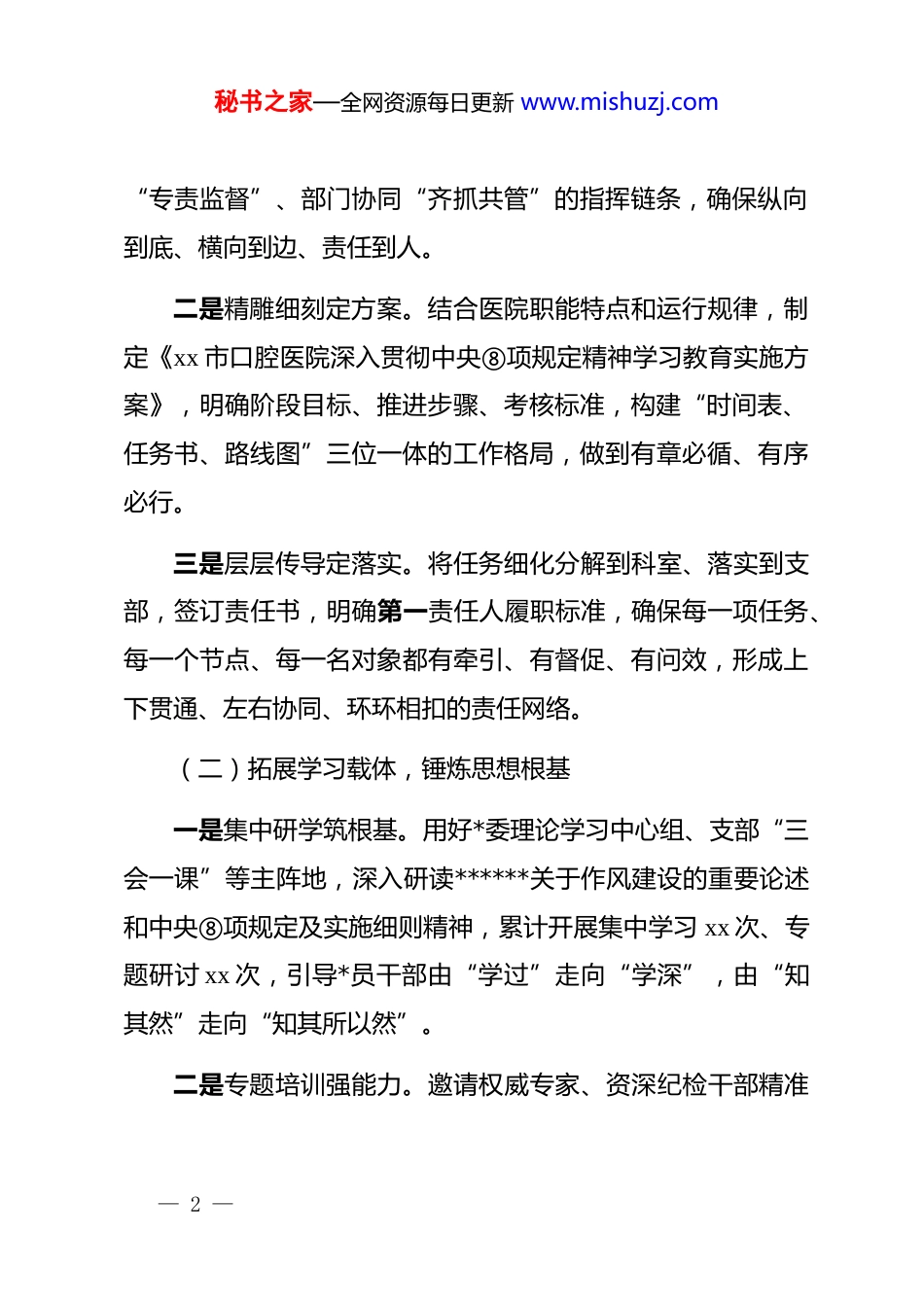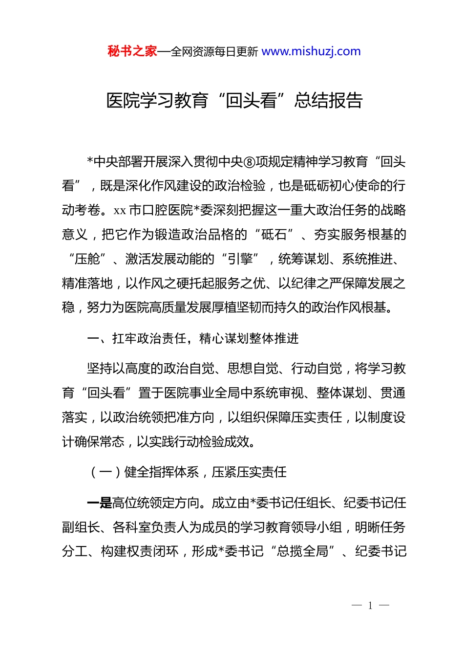 秘书之家—全网资源每日更新 www.mishuzj.com医院学习教育“回头看”总结报告*中央部署开展深入贯彻中央⑧项规定精神学习教育“回头看”,既是深化作风建设的政治检验,也是砥砺初心使命的行动考卷。xx 市口腔医院*委深刻把握这一重大政治任务的战略意义,把它作为锻造政治品格的“砥石”、夯实服务根基的“压舱”、激活发展动能的“引擎”,统筹谋划、系统推进、精准落地,以作风之硬托起服务之优、以纪律之严保障发展之稳,努力为医院高质量发展厚植坚韧而持久的政治作风根基。一、扛牢政治责任,精心谋划整体推进坚持以高度的政治自觉、思想自觉、行动自觉,将学习教育“回头看”置于医院事业全局中系统审视、整体谋划、贯通落实,以政治统领把准方向,以组织保障压实责任,以制度设计确保常态,以实践行动检验成效。(一)健全指挥体系,压紧压实责任一是高位统领定方向。成立由*委书记任组长、纪委书记任副组长、各科室负责人为成员的学习教育领导小组,明晰任务分工、构建权责闭环,形成*委书记“总揽全局”、纪委书记— 1 —秘书之家—全网资源每日更新 www.mishuzj.com“专责监督”、部门协同“齐抓共管”的指挥链条,确保纵向到底、横向到边、责任到人。二是精雕细刻定方案。结合医院职能特点和运行规律,制定《xx 市口腔医院深入贯彻中央⑧项规定精神学习教育实施方案》,明确阶段目标、推进步骤、考核标准,构建“时间表、任务书、路线图”三位一体的工作格局,做到有章必循、有序必行。三是层层传导定落实。将任务细化分解到科室、落实到支部,签订责任书,明确第一责任人履职标准,确保每一项任务、每一个节点、每一名对象都有牵引、有督促、有问效,形成上下贯通、左右协同、环环相扣的责任网络。(二)拓展学习载体,锤炼思想根基一是集中研学筑根基。用好*委理论学习中心组、支部“三会一课”等主阵地,深入研读******关于作风建设的重要论述和中央⑧项规定及实施细则精神,累计开展集中学习 xx 次、专题研讨 xx 次,引导*员干部由“学过”走向“学深”,由“知其然”走向“知其所以然”。二是专题培训强能力。邀请权威专家、资深纪检干部精准— 2 —秘书之家—全网资源每日更新 www.mishuzj.com解读政策要义,累计举办讲座 xx 场次、培训覆盖 xx 余人次,让纪律规矩转化为全员的职业信条和行为自觉。三是数智赋能促常学。依托医院微信、内部办公系统等平台,推送学习资料 xx 余篇,组织线上知识问答 xx 次、参与 xx余人次,让学习教育由“会场”延伸到“指尖”,实现全时全域、无缝衔接。(三)强化宣传引导,汇聚奋进合力一是阵地前移显可视。在门诊大厅、住院部等关键位置设置宣传展板 xx 块,图文并茂展示制度要求与典型案例,让纪律意识和服务规范“抬眼可见、入脑可记”。二是信息传导强互动。定期编发学习教育简报,共发布 xx期、上报 xx 期,既总结进度亮成绩,又交流经验促提升,形成纵横互动、互学共进的良好态势。三是典型示范立标杆。开展“作风建设先进科室”“作风建设标兵”评选,表彰先进科室 xx 个、标兵 xx 人,用看得见的榜样力量引导全员“见贤思齐、比学赶超、久久为功”。二、聚焦问题短板,精准靶向整改提升坚持问题导向,把查摆不足作为检验学习教育成效的“经— 3 —秘书之家—全网资源每日更新 www.mishuzj.com验交流”,把整改整治作为推动作风转变的“硬杠杆”,做到问题找得准、原因析得透、措施落得实,确保“回头看”真正看出质量、改出成效。(一)全面审视现状,掌握运行底数一是学习氛围持续升温。通过集中研学、交流研讨、线上互动等多元形式,全院职工对中央⑧项规定精神的理解深度和广度同步提升,学习积极性和自主性显著增强,参与学习研讨人次同比增长 xx%,人均自主学习时长每周增加 xx 小时。二是思想认知同步提升。*员干部*性修养更加坚定,廉洁自律意识不断增强,自觉将中央⑧项规定精神内化于心、外化于行。问卷调查显示,职工对作风建设重要性的正确认知率达到 xx%,较学习教育前提升 xx 个百分点。三是工作作风明显转变。全院形成务实担当、真抓实干的氛围,迟到早退现...