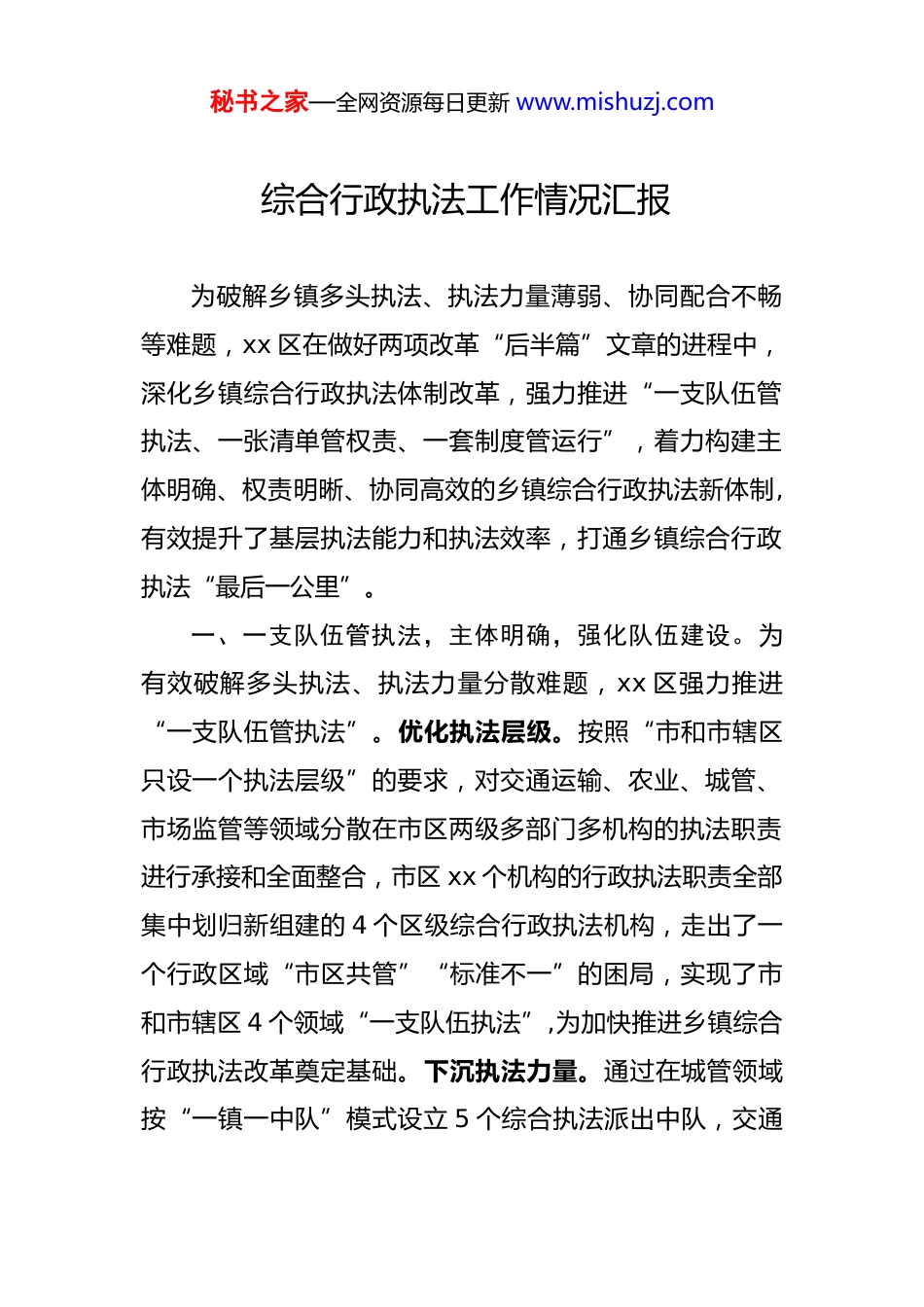 秘书之家—全网资源每日更新 www.mishuzj.com 综合行政执法工作情况汇报为破解乡镇多头执法、执法力量薄弱、协同配合不畅等难题,xx 区在做好两项改革“后半篇”文章的进程中,深化乡镇综合行政执法体制改革,强力推进“一支队伍管执法、一张清单管权责、一套制度管运行”,着力构建主体明确、权责明晰、协同高效的乡镇综合行政执法新体制,有效提升了基层执法能力和执法效率,打通乡镇综合行政执法“最后一公里”。一、一支队伍管执法,主体明确,强化队伍建设。为有效破解多头执法、执法力量分散难题,xx 区强力推进“一支队伍管执法”。优化执法层级。按照“市和市辖区只设一个执法层级”的要求,对交通运输、农业、城管、市场监管等领域分散在市区两级多部门多机构的执法职责进行承接和全面整合,市区 xx 个机构的行政执法职责全部集中划归新组建的 4 个区级综合行政执法机构,走出了一个行政区域“市区共管”“标准不一”的困局,实现了市和市辖区 4 个领域“一支队伍执法”,为加快推进乡镇综合行政执法改革奠定基础。下沉执法力量。通过在城管领域按“一镇一中队”模式设立 5 个综合执法派出中队,交通秘书之家—全网资源每日更新 www.mishuzj.com运输和农业领域分片区分别派出 3 个执法中队,5 个乡镇市场监管所加挂执法中队牌子的方式,在全区范围内率先实现综合执法中队全覆盖下沉乡镇。派出中队在区级职能部门和乡镇的双重领导下,负责日常巡查、快速处置、调查取证和执法办案等工作,最大程度实现基层执法扁平化。统筹执法机构。将辖区乡镇现有的综合行政执法协调办公室调整为综合行政执法办公室,负责履行乡镇的行政执法,统筹辖区内派出(驻)机构和上级部门的执法协调工作。二、一张清单管权责,职责明晰,强化执法职责。为解决乡镇综合执法权小责大、区镇权责不清的问题,强力推进“一张清单管权责”,理清区镇两级执法职责,是推进乡镇综合行政执法改革的核心。赋权增能。根据履职需要和承接能力,分期分批将住建、城管、交通、农业等区级部门同乡镇相关的执法频率高、与群众生产生活密切相关的行政处罚、行政强制和行政检查权委托下放乡镇,形成乡镇综合执法清单权力 66 项,其中各乡镇普遍适用的基础权力 24 项,乡镇自主选择特色清单权力 42 项。权限下放后,区级部门在业务培训、技术指导上主动加强对接,确保权力放得下、接得住。合理分工。在下放权限的同时,统筹考虑综合执法的连续性、高效性和便民性,坚持秘书之家—全网资源每日更新 www.mishuzj.com事权、财权和责任相统一,明确区镇两级执法责任分工。拟订《乡镇属地事项责任清单(试行)》,将部门和乡镇共有的 93 项行政权力事项逐项明确主体责任和配合责任,其中乡镇主体责任 53 项、配合责任 40 项,明确了谁为主、谁配合的主次关系和职责分工,作为区镇履职、监管和问责责任界定的重要依据,切实厘清区镇执法边界,避免重复执法和推诿扯皮。三、一套制度管运行,协作联动,强化执法质量。为最大程度整合乡镇执法力量,解决乡镇执法工作效率不高等问题,强力推行“一套制度管运行”。建立执法联动制度。建立区级部门与乡镇联席会议制度,拟订《乡镇综合行政执法统一指挥协调工作办法》,构建“轻审批+强监管+严执法”模式,每年不少于 2 次对乡镇综合行政执法过程中遇到的问题和困难进行研究、沟通。区镇纵向完善违法线索移送、联合执法检查、举报投诉受理、执法信息共享等制度,形成事前预防、事中检查、事后查处有机结合的长效监管机制。乡镇内部横向建立信息共享、沟通协作机制,推动综合执法办公室与其他*政办事机构的职能互补、无缝对接。调整后,凡涉及乡镇的执法事项坚持乡镇综合行政执法办公室“一个口子进出”。建立力量融合制度。秘书之家—全网资源每日更新 www.mishuzj.com区直部门 16 个派出(驻)中队、60 余名干部下沉乡镇后,日常管理由乡镇负责,给予乡镇 50%的管理考核权限,负责执法人员日常考核和年度目标考核奖励绩效发放,赋予乡镇对派出(驻)执法队伍的整体调配权及负责人任免征得同意权。拉近了派出(驻)执法人员与乡镇综合执法办执法人员的距离,让...