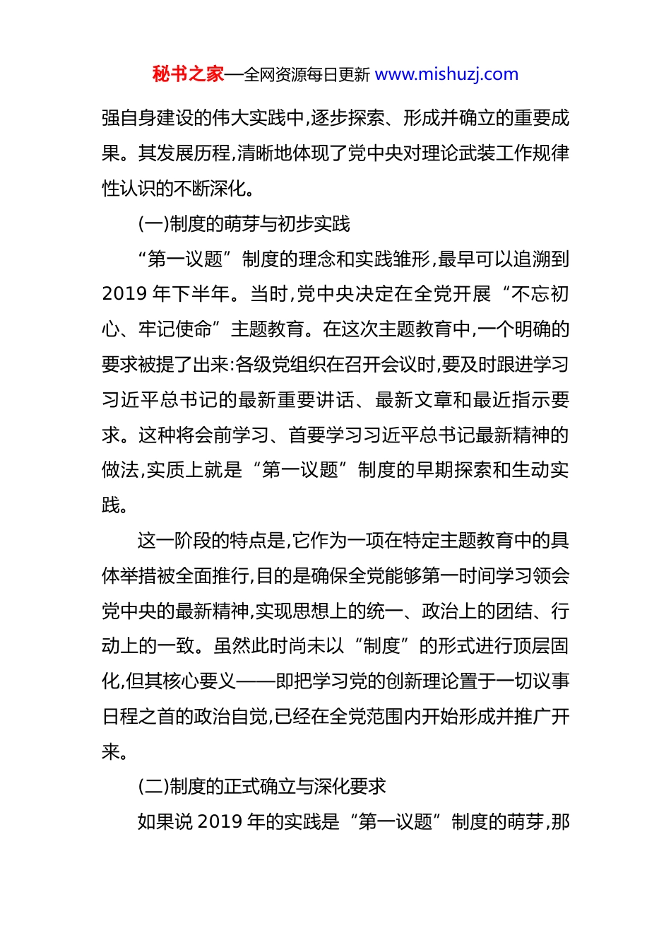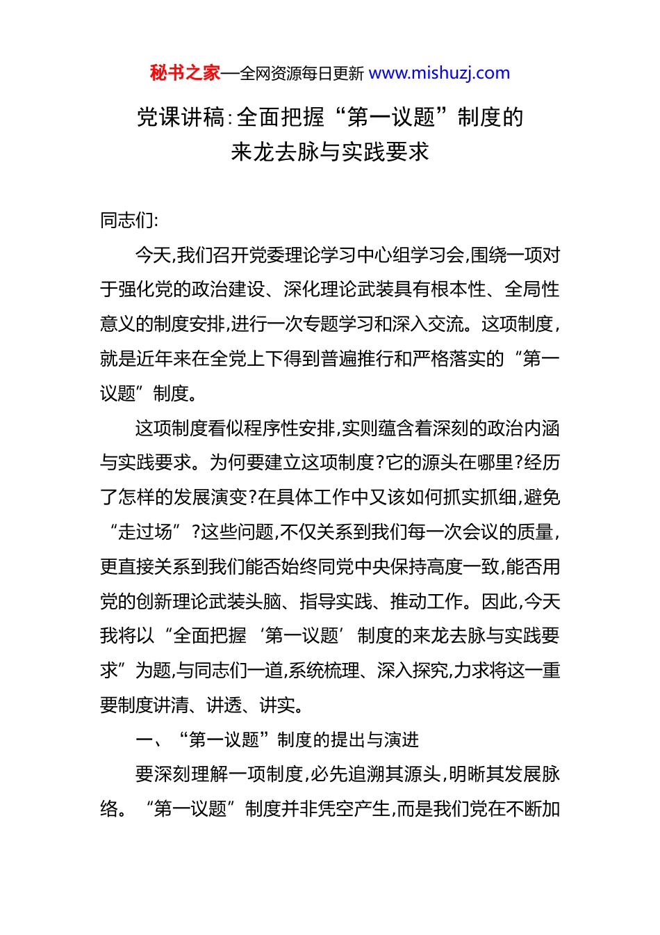 秘书之家—全网资源每日更新 www.mishuzj.com党课讲稿:全面把握“第一议题”制度的来龙去脉与实践要求 同志们:今天,我们召开党委理论学习中心组学习会,围绕一项对于强化党的政治建设、深化理论武装具有根本性、全局性意义的制度安排,进行一次专题学习和深入交流。这项制度,就是近年来在全党上下得到普遍推行和严格落实的“第一议题”制度。这项制度看似程序性安排,实则蕴含着深刻的政治内涵与实践要求。为何要建立这项制度?它的源头在哪里?经历了怎样的发展演变?在具体工作中又该如何抓实抓细,避免“走过场”?这些问题,不仅关系到我们每一次会议的质量,更直接关系到我们能否始终同党中央保持高度一致,能否用党的创新理论武装头脑、指导实践、推动工作。因此,今天我将以“全面把握‘第一议题’制度的来龙去脉与实践要求”为题,与同志们一道,系统梳理、深入探究,力求将这一重要制度讲清、讲透、讲实。一、“第一议题”制度的提出与演进要深刻理解一项制度,必先追溯其源头,明晰其发展脉络。“第一议题”制度并非凭空产生,而是我们党在不断加秘书之家—全网资源每日更新 www.mishuzj.com强自身建设的伟大实践中,逐步探索、形成并确立的重要成果。其发展历程,清晰地体现了党中央对理论武装工作规律性认识的不断深化。(一)制度的萌芽与初步实践“第一议题”制度的理念和实践雏形,最早可以追溯到2019 年下半年。当时,党中央决定在全党开展“不忘初心、牢记使命”主题教育。在这次主题教育中,一个明确的要求被提了出来:各级党组织在召开会议时,要及时跟进学习习近平总书记的最新重要讲话、最新文章和最近指示要求。这种将会前学习、首要学习习近平总书记最新精神的做法,实质上就是“第一议题”制度的早期探索和生动实践。这一阶段的特点是,它作为一项在特定主题教育中的具体举措被全面推行,目的是确保全党能够第一时间学习领会党中央的最新精神,实现思想上的统一、政治上的团结、行动上的一致。虽然此时尚未以“制度”的形式进行顶层固化,但其核心要义——即把学习党的创新理论置于一切议事日程之首的政治自觉,已经在全党范围内开始形成并推广开来。(二)制度的正式确立与深化要求如果说 2019 年的实践是“第一议题”制度的萌芽,那秘书之家—全网资源每日更新 www.mishuzj.com么,2024 年则是其正式确立并走向制度化、规范化的关键之年。2024 年 2 月 23 日,中共中央办公厅印发了《关于巩固拓展学习贯彻习近平新时代中国特色社会主义思想主题教育成果的意见》。这份至关重要的中央文件,在总结主题教育成功经验的基础上,对未来如何持续深化理论武装作出了长远规划和制度安排。其中,明确提出了“建立健全‘第一议题’制度”的要求。这一提法的出现,标志着“第一议题”从一项在主题教育期间行之有效的“工作方法”,正式上升为一项必须长期坚持、不断完善的“政治制度”。它不再仅仅是某个阶段、某项活动的临时要求,而是融入党的组织生活、嵌入各级党组织议事决策流程的刚性约束。这份《意见》的发布,为“第一议题”制度赋予了前所未有的权威性和规范性。它要求各级党委(党组)在召开常委会会议或理论学习中心组学习会时,必须将学习习近平新时代中国特色社会主义思想和习近平总书记的重要讲话作为首要内容,以此来把握正确的政治方向。这深刻表明,坚持“第一议题”制度,本质上就是坚持党的领导、加强党的政治建设的具体体现,是衡量一个党组织政治判断力、政治领悟力、政治执行力的重要标尺。秘书之家—全网资源每日更新 www.mishuzj.com从 2019 年的实践探索到 2024 年的正式确立,这条来龙去脉清晰地告诉我们,“第一议题”制度是我们党深化理论武装、强化政治忠诚的必然产物和制度结晶,必须从政治和全局的高度来认识和把握其极端重要性。二、准确把握“第一议题”制度的核心要求明确了“第一议题”制度的来龙去脉,我们还需要深入剖析其内在规定和核心要求,确保在执行过程中不偏向、不走样。顾名思义,“第一”凸显的是其政治站位和重要程度,“议题”则明确了其学习内容和基本属性。(一)学习内容的权威性与时代性“第一议题”学什么?这是首要问题。其学习内容具有高度的权威性和鲜...