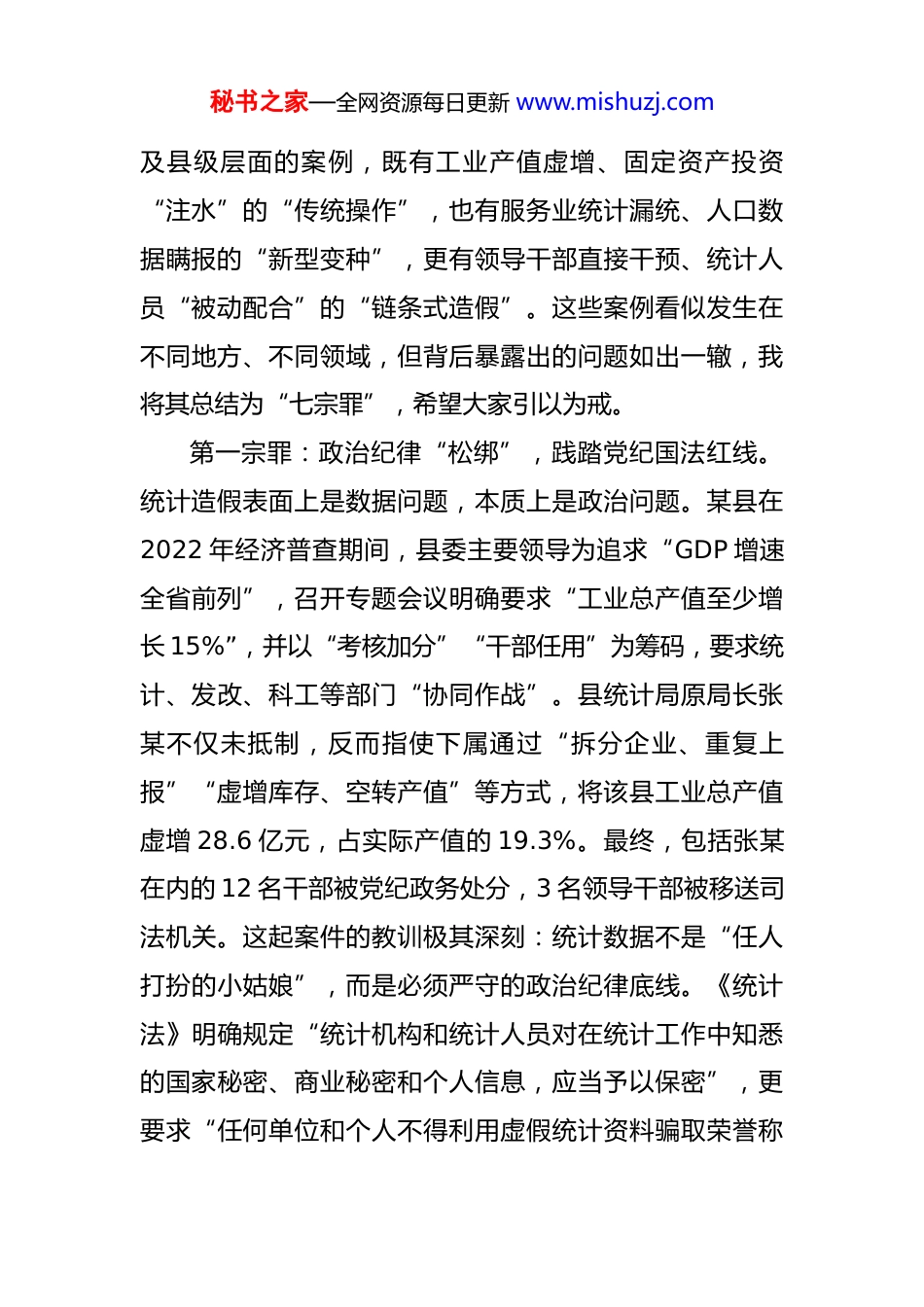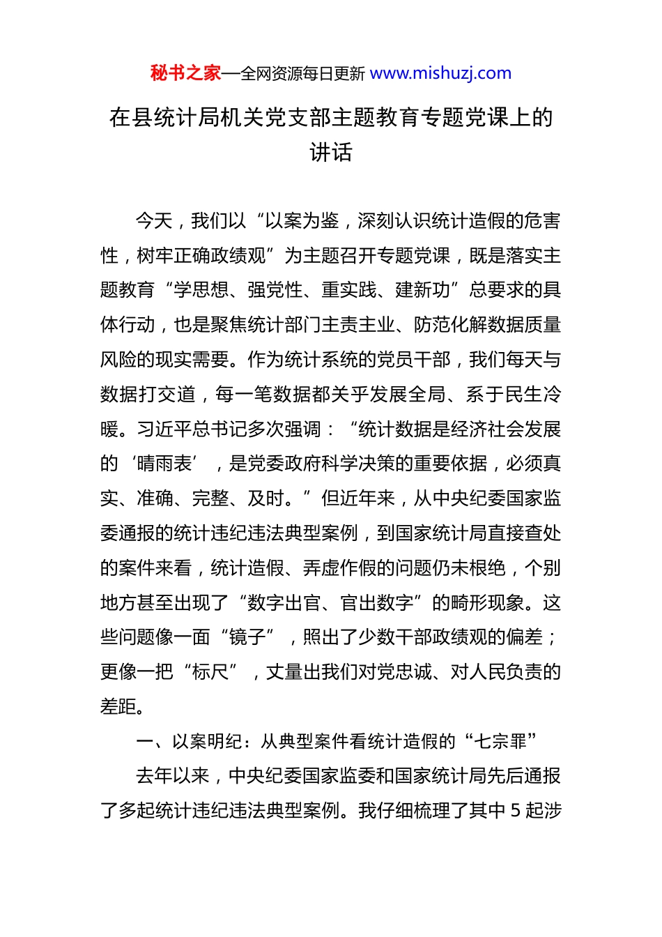 秘书之家—全网资源每日更新 www.mishuzj.com在县统计局机关党支部主题教育专题党课上的讲话 今天,我们以“以案为鉴,深刻认识统计造假的危害性,树牢正确政绩观”为主题召开专题党课,既是落实主题教育“学思想、强党性、重实践、建新功”总要求的具体行动,也是聚焦统计部门主责主业、防范化解数据质量风险的现实需要。作为统计系统的党员干部,我们每天与数据打交道,每一笔数据都关乎发展全局、系于民生冷暖。习近平总书记多次强调:“统计数据是经济社会发展的‘晴雨表’,是党委政府科学决策的重要依据,必须真实、准确、完整、及时。”但近年来,从中央纪委国家监委通报的统计违纪违法典型案例,到国家统计局直接查处的案件来看,统计造假、弄虚作假的问题仍未根绝,个别地方甚至出现了“数字出官、官出数字”的畸形现象。这些问题像一面“镜子”,照出了少数干部政绩观的偏差;更像一把“标尺”,丈量出我们对党忠诚、对人民负责的差距。一、以案明纪:从典型案件看统计造假的“七宗罪”去年以来,中央纪委国家监委和国家统计局先后通报了多起统计违纪违法典型案例。我仔细梳理了其中 5 起涉秘书之家—全网资源每日更新 www.mishuzj.com及县级层面的案例,既有工业产值虚增、固定资产投资“注水”的“传统操作”,也有服务业统计漏统、人口数据瞒报的“新型变种”,更有领导干部直接干预、统计人员“被动配合”的“链条式造假”。这些案例看似发生在不同地方、不同领域,但背后暴露出的问题如出一辙,我将其总结为“七宗罪”,希望大家引以为戒。第一宗罪:政治纪律“松绑”,践踏党纪国法红线。统计造假表面上是数据问题,本质上是政治问题。某县在2022 年经济普查期间,县委主要领导为追求“GDP 增速全省前列”,召开专题会议明确要求“工业总产值至少增长 15%”,并以“考核加分”“干部任用”为筹码,要求统计、发改、科工等部门“协同作战”。县统计局原局长张某不仅未抵制,反而指使下属通过“拆分企业、重复上报”“虚增库存、空转产值”等方式,将该县工业总产值虚增 28.6 亿元,占实际产值的 19.3%。最终,包括张某在内的 12 名干部被党纪政务处分,3 名领导干部被移送司法机关。这起案件的教训极其深刻:统计数据不是“任人打扮的小姑娘”,而是必须严守的政治纪律底线。《统计法》明确规定“统计机构和统计人员对在统计工作中知悉的国家秘密、商业秘密和个人信息,应当予以保密”,更要求“任何单位和个人不得利用虚假统计资料骗取荣誉称秘书之家—全网资源每日更新 www.mishuzj.com号、物质利益或者职务晋升”。突破这条红线,就是对党的不忠诚、对人民的不负责。第二宗罪:发展观“错位”,扭曲政绩考核导向。统计造假往往与错误的政绩观如影随形。某山区县为摆脱“经济总量小、排名靠后”的尴尬,连续 3 年在政府工作报告中提出“跨越式发展”目标,但受地理条件、产业基础限制,实际增长乏力。2023 年初,分管统计的副县长李某授意县统计局“找补差额”,要求将本年度新开工的 3个小型基建项目“包装”成“亿元级产业项目”,把已停产的 2 家传统企业“复活”为“正常生产企业”,甚至通过“借壳统计”(即借用其他企业统计台账数据)的方式,将该县固定资产投资增速从-3.2%“拉高”至 8.7%。这种“数字游戏”看似让数据“好看”了,却让县委县政府对产业发展现状产生误判——当年该县实际新增有效投资仅占总统计量的 12%,后续出台的“加大工业招商”“优化产业布局”等政策全部偏离实际,最终导致年度重点项目推进滞后、财政资金大量闲置。这警示我们:政绩不是“数字游戏”的产物,而是群众获得感、企业发展实效、区域竞争力提升的综合体现。如果把统计指标当成“政绩 KPI”,只会让发展误入歧途。第三宗罪:基层统计“失守”,动摇数据质量根基。秘书之家—全网资源每日更新 www.mishuzj.com统计数据的真实性,最终要靠基层统计员“一笔一画”去维护。但在一些地方,基层统计力量薄弱、人员流动频繁、业务培训缺位的问题长期存在,给统计造假留下了可乘之机。我曾带队到某乡镇调研,发现该镇统计站仅有 1名兼职统计员,且同...