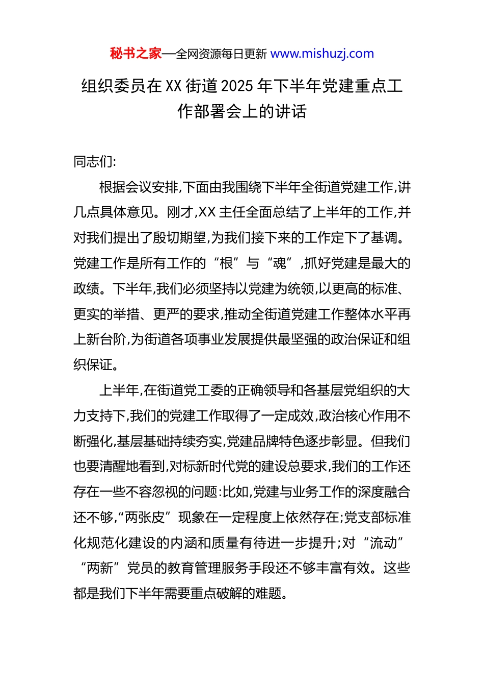 秘书之家—全网资源每日更新 www.mishuzj.com组织委员在 XX 街道 2025 年下半年党建重点工作部署会上的讲话 同志们:根据会议安排,下面由我围绕下半年全街道党建工作,讲几点具体意见。刚才,XX 主任全面总结了上半年的工作,并对我们提出了殷切期望,为我们接下来的工作定下了基调。党建工作是所有工作的“根”与“魂”,抓好党建是最大的政绩。下半年,我们必须坚持以党建为统领,以更高的标准、更实的举措、更严的要求,推动全街道党建工作整体水平再上新台阶,为街道各项事业发展提供最坚强的政治保证和组织保证。上半年,在街道党工委的正确领导和各基层党组织的大力支持下,我们的党建工作取得了一定成效,政治核心作用不断强化,基层基础持续夯实,党建品牌特色逐步彰显。但我们也要清醒地看到,对标新时代党的建设总要求,我们的工作还存在一些不容忽视的问题:比如,党建与业务工作的深度融合还不够,“两张皮”现象在一定程度上依然存在;党支部标准化规范化建设的内涵和质量有待进一步提升;对“流动”“两新”党员的教育管理服务手段还不够丰富有效。这些都是我们下半年需要重点破解的难题。秘书之家—全网资源每日更新 www.mishuzj.com下半年,全街道党建工作要紧紧围绕“一条主线、四大工程、一个保障”的总体思路来展开。第一,紧扣“一条主线”,在强化政治引领上达到新高度。这条主线,就是“铸牢中华民族共同体意识”。这是我们所有工作的纲和魂。各村、各社区党组织必须把这条主线贯穿于基层党建和基层治理的全过程、各方面。一要持续深化理论武装。要把学习贯彻习近平新时代中国特色社会主义思想作为首要政治任务,利用好“三会一课”、主题党日、书记讲党课等载体,组织广大党员干部读原著、学原文、悟原理。要重点围绕习近平总书记关于民族工作、基层治理的重要论述开展专题学习研讨,确保入脑入心、指导实践。二要坚决守好意识形态主阵地。网络空间已经成为意识形态斗争的主战场。各党组织书记是本单位意识形态工作的第一责任人。要加强对微信公众号、居民群、网站等网络平台的管理和内容建设,主动发声、弘扬正能量,及时发现和处置各类苗头性、倾向性问题,绝不给错误思想言论提供传播空间。三要推动主线意识融入日常。要将铸牢中华民族共同体意识融入到社区文化建设、邻里活动、便民服务之中。秘书之家—全网资源每日更新 www.mishuzj.com要深入挖掘和宣传各族群众守望相助、团结奋斗的生动故事,通过群众喜闻乐见的形式,让“三个离不开”“五个认同”的思想深深植根于群众心中。第二,做实“四大工程”,在夯实基层基础上实现新突破。一是实施“战斗堡垒”强基工程。基础不牢,地动山摇。党支部的战斗力决定了我们基层工作的成败。下半年,要深入推进党支部标准化规范化建设,严格对标对表,逐项查漏补缺,确保年底前所有党支部全面达标、提质增效。要特别关注“流动”党员和“两新”组织党员的管理服务工作,通过建立流动党员驿站、开展线上组织生活、选派党建指导员等方式,确保他们“离乡不离党、流动不流失”。二是实施“头雁领航”育强工程。火车跑得快,全靠车头带。下半年的重中之重,是高质量完成社区“两委”换届的前期准备工作。各社区党组织要提前谋划,在党工委的统一领导下,做好人选摸排、考察和储备工作。要坚持把政治标准放在首位,拓宽选人视野,真正把那些想干事、能干事、干成事、不出事的优秀人才选出来、用起来,为未来五年社区发展配强“领头雁”。同时,要加强对现有村、社区书记和“两委”班子成员的培训,提升他们履职尽责的能力。三是实施“治理融合”增效工程。党建引领基层治理,秘书之家—全网资源每日更新 www.mishuzj.com不能是空洞的口号。要深化拓展“社区吹哨、部门报到”与“双报到、双服务、双报告”制度,做实区域化党建联建项目。下半年,每个社区都要至少打造 1-2 个有影响力的党建联建项目,真正把辖区单位、社会组织、物业公司等各方力量拧成一股绳,共同解决群众的急难愁盼问题。要积极构建“一核多元、一网多能”的治理体系,推动党建网格与治理网格“多网合一”,让党员在网格中亮身份、做表率、当先锋。四是实施“品牌文化”提质工程。品牌是旗帜,文化是...