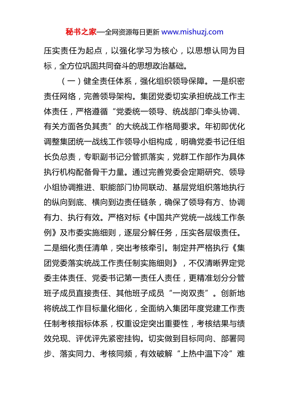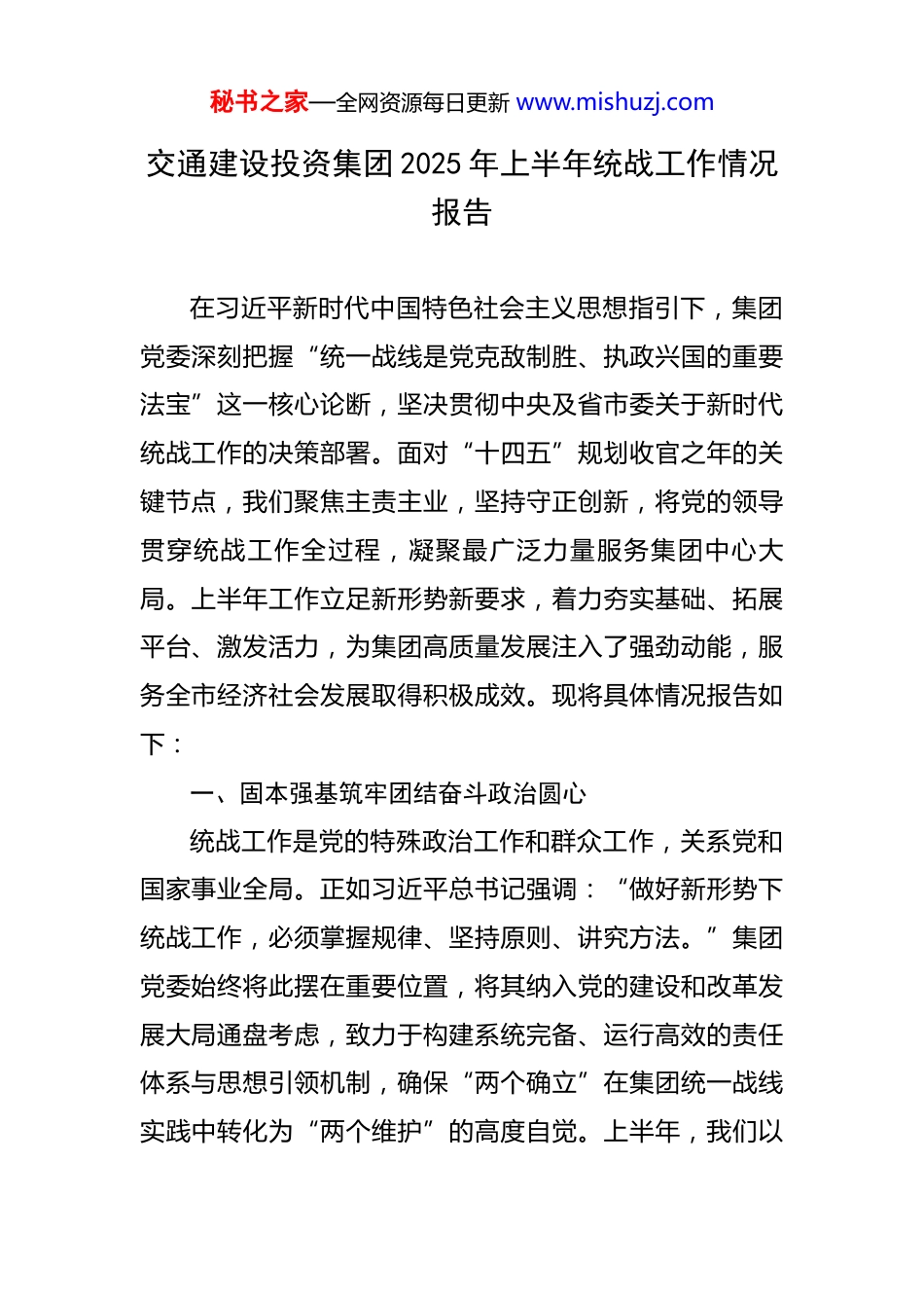 秘书之家—全网资源每日更新 www.mishuzj.com交通建设投资集团 2025 年上半年统战工作情况报告 在习近平新时代中国特色社会主义思想指引下,集团党委深刻把握“统一战线是党克敌制胜、执政兴国的重要法宝”这一核心论断,坚决贯彻中央及省市委关于新时代统战工作的决策部署。面对“十四五”规划收官之年的关键节点,我们聚焦主责主业,坚持守正创新,将党的领导贯穿统战工作全过程,凝聚最广泛力量服务集团中心大局。上半年工作立足新形势新要求,着力夯实基础、拓展平台、激发活力,为集团高质量发展注入了强劲动能,服务全市经济社会发展取得积极成效。现将具体情况报告如下:一、固本强基筑牢团结奋斗政治圆心统战工作是党的特殊政治工作和群众工作,关系党和国家事业全局。正如习近平总书记强调:“做好新形势下统战工作,必须掌握规律、坚持原则、讲究方法。”集团党委始终将此摆在重要位置,将其纳入党的建设和改革发展大局通盘考虑,致力于构建系统完备、运行高效的责任体系与思想引领机制,确保“两个确立”在集团统一战线实践中转化为“两个维护”的高度自觉。上半年,我们以秘书之家—全网资源每日更新 www.mishuzj.com压实责任为起点,以强化学习为核心,以思想认同为目标,全方位巩固共同奋斗的思想政治基础。(一)健全责任体系,强化组织领导保障。一是织密责任网络,完善领导架构。集团党委切实承担统战工作主体责任,严格遵循“党委统一领导、统战部门牵头协调、有关方面各负其责”的大统战工作格局要求。年初即优化调整集团统一战线工作领导小组构成,明确党委书记任组长负总责,专职副书记分管抓落实,党群工作部作为具体执行机构配备骨干力量。通过完善党委会定期研究、领导小组协调推进、职能部门协同联动、基层党组织落地执行的纵向到底、横向到边责任链条,确保了领导有方、协调有力、执行有效。严格对标《中国共产党统一战线工作条例》及市委实施细则,逐层分解任务,压实各层级责任。二是细化责任清单,突出考核牵引。制定并严格执行《集团党委落实统战工作责任制实施细则》,不仅清晰界定党委主体责任、党委书记第一责任人责任,更精准划分分管班子成员直接责任、其他班子成员“一岗双责”。创新地将统战工作目标量化细化,全面纳入集团年度党建工作责任制考核指标体系,权重设定突出重要性,考核结果与绩效兑现、评优评先紧密挂钩。切实做到目标同向、部署同步、落实同力、考核同频,有效破解“上热中温下冷”难秘书之家—全网资源每日更新 www.mishuzj.com题,推动压力传导层层到位、责任担当见诸日常。三是狠抓制度执行,强化监督问效。建立季度专题研究、年度督导巡查、日常台账管理等系列制度,将学习领会上级精神、研判部署重点工作、解决难点堵点问题制度化。班子成员带头落实“六个纳入”“四个带头”要求,将统战工作深度融入分管领域业务部署,定期深入一线联系重点党外人士、少数民族骨干、民主党派成员。年内,领导小组办公室完成对全部 12 家下属单位党组织的统战工作责任制落实情况专项检查,对检查发现的问题建立整改台账、实行销号管理,确保各项制度规范刚性执行、覆盖无遗漏。(二)深化理论武装,筑牢共同思想根基。一是强化核心意识,把握政治方向。坚持把学习贯彻习近平总书记关于做好新时代党的统一战线工作的重要思想作为首要政治任务,纳入党委理论学习中心组、干部教育培训和统一战线成员日常学习内容体系。通过专题讲座、集中轮训、辅导报告等形式,深入阐释其时代背景、核心要义、精神实质和实践要求,引导广大统战成员深刻领悟“两个确立”的决定性意义,不断增强“四个意识”、坚定“四个自信”、做到“两个维护”,始终与党同心同德、同向同行。强调从政治上观察分析统战工作,确保正确政治方向不动摇。二是聚焦主题教育,凝聚思想共识。围绕“凝心秘书之家—全网资源每日更新 www.mishuzj.com铸魂强根基、团结奋进新征程”主题主线,结合庆祝新中国成立 76 周年、遵义会议召开 90 周年等重要节点,精心策划系列主题教育活动。创新采用“集中学习+现场研学+专题研讨”融合模式,组织党外知识分子、民主党派骨...