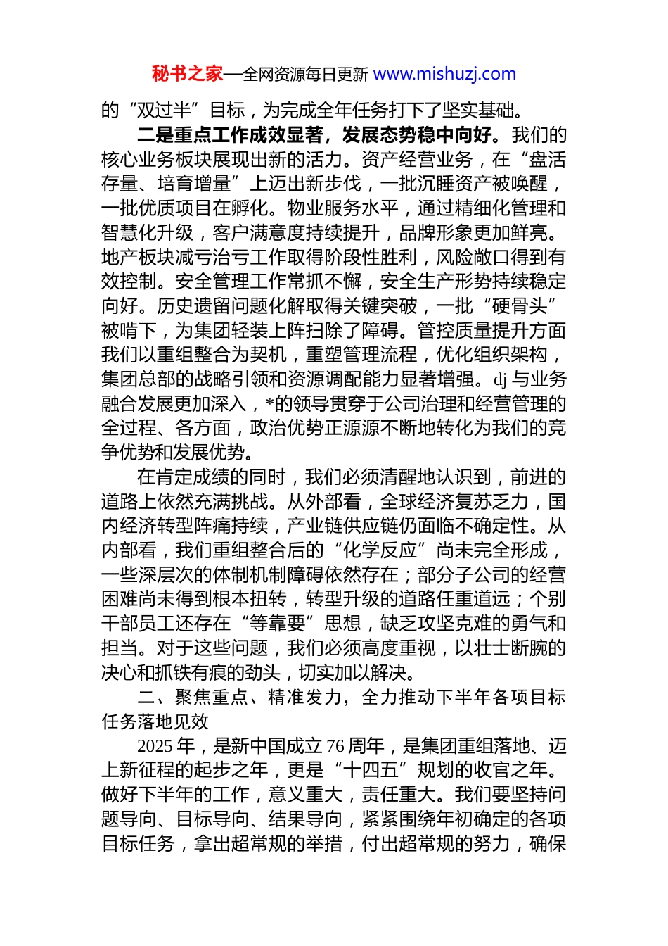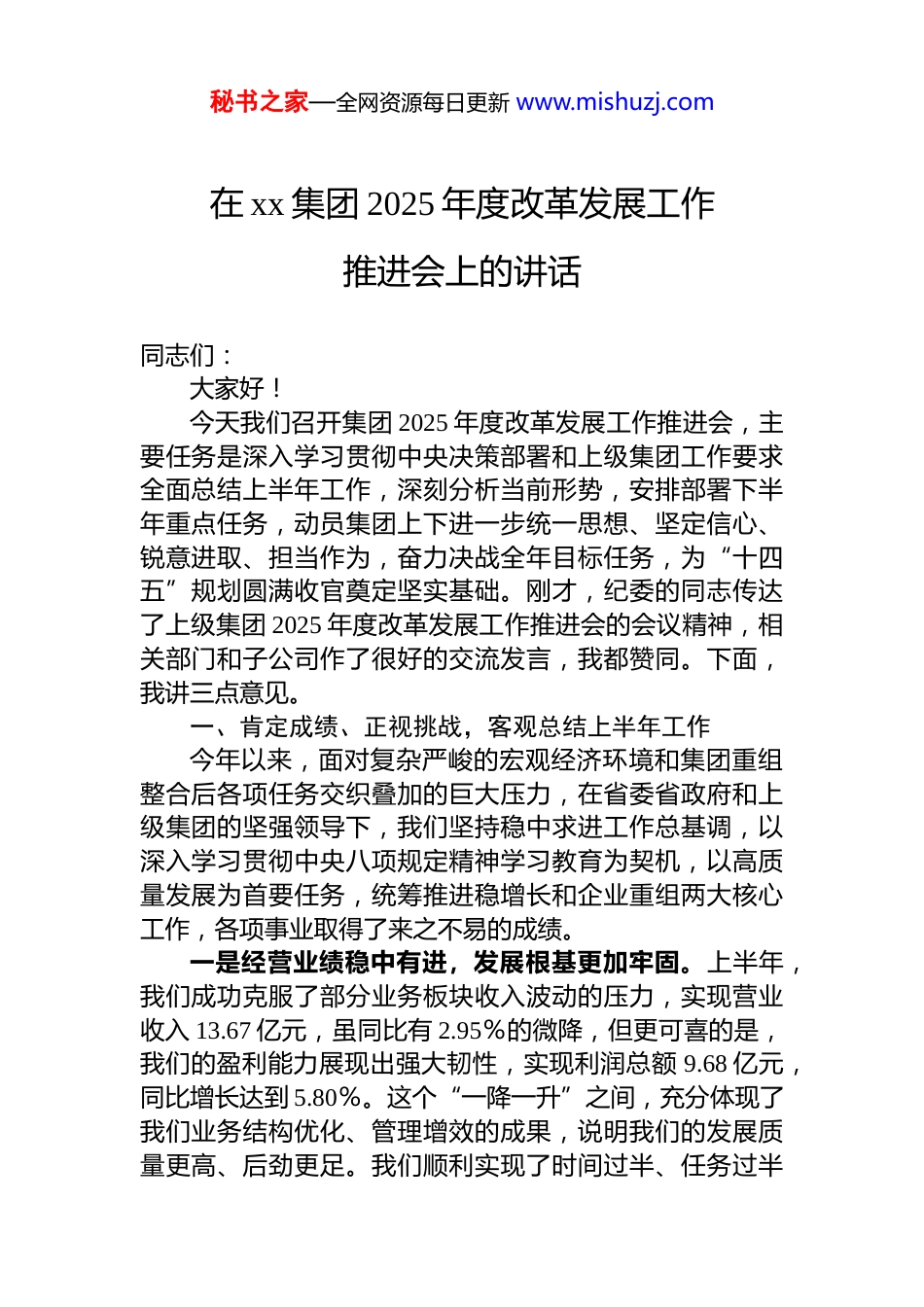 秘书之家—全网资源每日更新 www.mishuzj.com在 xx 集团 2025 年度改革发展工作推进会上的讲话同志们:大家好!今天我们召开集团 2025 年度改革发展工作推进会,主要任务是深入学习贯彻中央决策部署和上级集团工作要求全面总结上半年工作,深刻分析当前形势,安排部署下半年重点任务,动员集团上下进一步统一思想、坚定信心、锐意进取、担当作为,奋力决战全年目标任务,为“十四五”规划圆满收官奠定坚实基础。刚才,纪委的同志传达了上级集团 2025 年度改革发展工作推进会的会议精神,相关部门和子公司作了很好的交流发言,我都赞同。下面,我讲三点意见。一、肯定成绩、正视挑战,客观总结上半年工作今年以来,面对复杂严峻的宏观经济环境和集团重组整合后各项任务交织叠加的巨大压力,在省委省政府和上级集团的坚强领导下,我们坚持稳中求进工作总基调,以深入学习贯彻中央八项规定精神学习教育为契机,以高质量发展为首要任务,统筹推进稳增长和企业重组两大核心工作,各项事业取得了来之不易的成绩。一是经营业绩稳中有进,发展根基更加牢固。上半年,我们成功克服了部分业务板块收入波动的压力,实现营业收入 13.67 亿元,虽同比有 2.95%的微降,但更可喜的是,我们的盈利能力展现出强大韧性,实现利润总额 9.68 亿元,同比增长达到 5.80%。这个“一降一升”之间,充分体现了我们业务结构优化、管理增效的成果,说明我们的发展质量更高、后劲更足。我们顺利实现了时间过半、任务过半秘书之家—全网资源每日更新 www.mishuzj.com的“双过半”目标,为完成全年任务打下了坚实基础。二是重点工作成效显著,发展态势稳中向好。我们的核心业务板块展现出新的活力。资产经营业务,在“盘活存量、培育增量”上迈出新步伐,一批沉睡资产被唤醒,一批优质项目在孵化。物业服务水平,通过精细化管理和智慧化升级,客户满意度持续提升,品牌形象更加鲜亮。地产板块减亏治亏工作取得阶段性胜利,风险敞口得到有效控制。安全管理工作常抓不懈,安全生产形势持续稳定向好。历史遗留问题化解取得关键突破,一批“硬骨头”被啃下,为集团轻装上阵扫除了障碍。管控质量提升方面我们以重组整合为契机,重塑管理流程,优化组织架构,集团总部的战略引领和资源调配能力显著增强。dj 与业务融合发展更加深入,*的领导贯穿于公司治理和经营管理的全过程、各方面,政治优势正源源不断地转化为我们的竞争优势和发展优势。在肯定成绩的同时,我们必须清醒地认识到,前进的道路上依然充满挑战。从外部看,全球经济复苏乏力,国内经济转型阵痛持续,产业链供应链仍面临不确定性。从内部看,我们重组整合后的“化学反应”尚未完全形成,一些深层次的体制机制障碍依然存在;部分子公司的经营困难尚未得到根本扭转,转型升级的道路任重道远;个别干部员工还存在“等靠要”思想,缺乏攻坚克难的勇气和担当。对于这些问题,我们必须高度重视,以壮士断腕的决心和抓铁有痕的劲头,切实加以解决。二、聚焦重点、精准发力,全力推动下半年各项目标任务落地见效2025 年,是新中国成立 76 周年,是集团重组落地、迈上新征程的起步之年,更是“十四五”规划的收官之年。做好下半年的工作,意义重大,责任重大。我们要坚持问题导向、目标导向、结果导向,紧紧围绕年初确定的各项目标任务,拿出超常规的举措,付出超常规的努力,确保秘书之家—全网资源每日更新 www.mishuzj.com各项工作再上新台阶。第一,以深化改革为根本动力,全面激发内生发展活力。改革是破解发展难题的关键一招。集团重组整合为我们提供了前所未有的改革契机。我们必须向改革要活力,向创新要效益。一要坚决打破体制机制壁垒。要以刀刃向内的勇气,加快推进生产要素市场化配置改革和企业内部经营机制创新。核心是健全“三能”机制,即“管理人员能上能下、员工能进能出、薪酬能增能减”。下半年,要重点在优化机构设置、改革薪酬体系上取得实质性突破。薪酬分配要彻底告别“大锅饭”,真正向创造价值的核心骨干倾斜,向关键岗位和一线员工倾斜。要全面推行经营部门“揭榜挂帅”和全员双向选择、竞争上岗,让有为者有位...