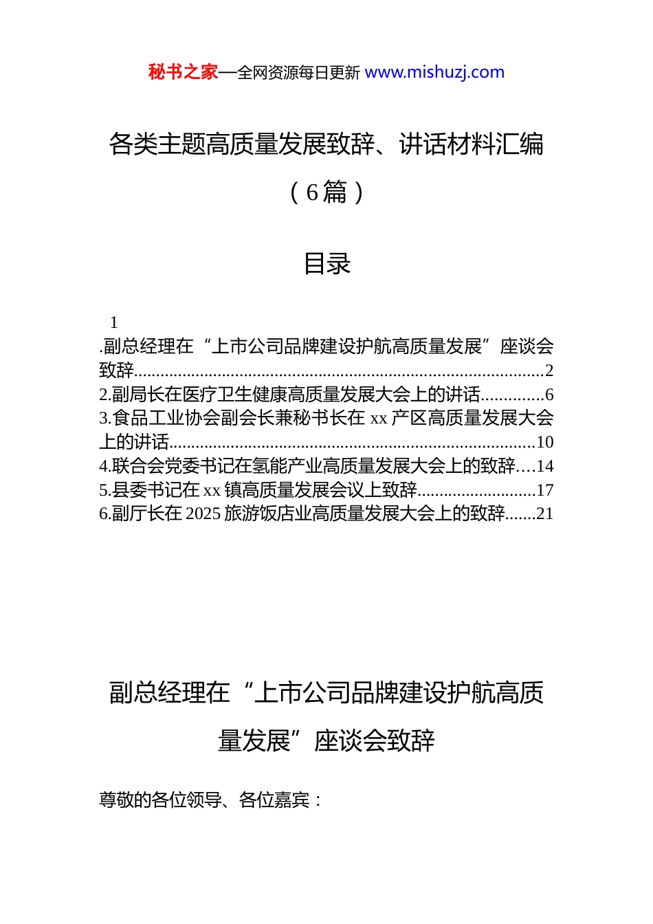 秘书之家—全网资源每日更新 www.mishuzj.com各类主题高质量发展致辞、讲话材料汇编(6 篇)目录1.副总经理在“上市公司品牌建设护航高质量发展”座谈会致辞.............................................................................................22.副局长在医疗卫生健康高质量发展大会上的讲话..............63.食品工业协会副会长兼秘书长在 xx 产区高质量发展大会上的讲话...................................................................................104.联合会党委书记在氢能产业高质量发展大会上的致辞....145.县委书记在 xx 镇高质量发展会议上致辞...........................176.副厅长在 2025 旅游饭店业高质量发展大会上的致辞.......21副总经理在“上市公司品牌建设护航高质量发展”座谈会致辞 尊敬的各位领导、各位嘉宾:秘书之家—全网资源每日更新 www.mishuzj.com大家好!非常高兴参加“上市公司品牌建设护航高质量发展”座谈会,我谨代表中证中小投资者服务中心对座谈会的成功举办表示热烈祝贺!对长期以来关心、支持投资者服务中心工作,关心、支持投资者保护事业的各位领导和嘉宾表示衷心感谢!中证中小投资者服务中心是证监会直接管理的法定投资者保护机构。成立十年来,我们在资本市场各方的支持下,始终站稳资本市场人民性立场,不断探索保护投资者合法权益的新方法新举措,目前已经形成了以持股行权、维权诉讼、纠纷调解、投服投教为四大业务支柱的“投服模式”。持股行权方面,我们是 xxx 三家交易所全部上市公司的一手股东,根据《公司法》行使股东权利,依据《证券法》行使投资者保护机构的法定职责,我们围绕投资者利益“痛点”开展日常行权,也针对特定问题组织专项行权,2024 年,我们首次公开提名独立董事并征集投票权,推动独立董事名实相副;20xx、2024 连续两年开展 xxx 场年度股东会专项行权,促进提升股东会规范程度;开展现金分红、公司章程规范、大股东违规资金占用事项专项行权,引导公司与投资者共享发展成果,做推动上市公司治理与规范运作的“鲶鱼”。维权诉讼方面,坚持“零容忍”“追首恶”,不断丰富民事赔偿司法实践,截至目前已累计提起各类诉讼 xxx 件,包括两单特别代表人诉讼康美药业案与泽达易盛案、首单支持诉讼匹凸匹案、首单股东代位诉讼大智慧案、首例操纵市场恒康医疗案、首单股东直接诉讼海利生物案,x 万多名投资者获赔 xx.xx 亿元,充分发挥“行刑民”立体惩戒机制中的民事赔偿惩戒作用,帮助拓宽投资者依法维权路径。纠纷调解方面,积极践行新时代“枫桥经验”,成立我国唯一跨区域、跨市场服务的全国性证券期货纠纷调解组织——中证资本市场法律服务中心,深化纠纷多元化解机制建设。截至 xx 月底,已调解成功 x.xx 万件纠纷,为投资者挽回损失 xx.xx 亿元,成为秘书之家—全网资源每日更新 www.mishuzj.com资本市场纠纷化解主渠道。投服投教方面,自主打造《股东来了》投资者权益知识竞赛与“了解我的上市公司”两大品牌,助力投资者夯实投资知识,强化自我保护意识与能力,树立“理性投资、价值投资、长期投资”理念。其中,《股东来了》已成功举办 x 届,累计参赛人数达到近xxxx 万;了解我的上市公司活动已带领投资者走进上市公司超 xx 家,相关视频流量超 x.x 亿人次。在开展各项投资者保护工作的过程中,我们深感资本市场是多元共生的生态系统,“投资者是资本市场之本,上市公司是资本市场之基”绝非虚言。上市公司高质量发展是新“国九条”与全面深化资本市场改革的应有之意,是切实保护投资者特别是中小投资者合法权益的客观需要更是上市公司品牌建设的基础根基。品牌建设是以得到所有市场接触点正向反馈为目标的理念表达,而投资者的获得感与决策行为是最真实、最直接的反馈。我们诚挚地希望,上市公司在合规运营并给予投资者更好回报的基础上能更进一步,从以下两方面提升品牌美誉度:首先,注重投资者关系管理工作,持续提升信息披露质量,充分运用新媒体时代的各类工具搭建投资者关系媒体矩阵,持续输出专业价值传播内容,通过专业媒体、社区和...