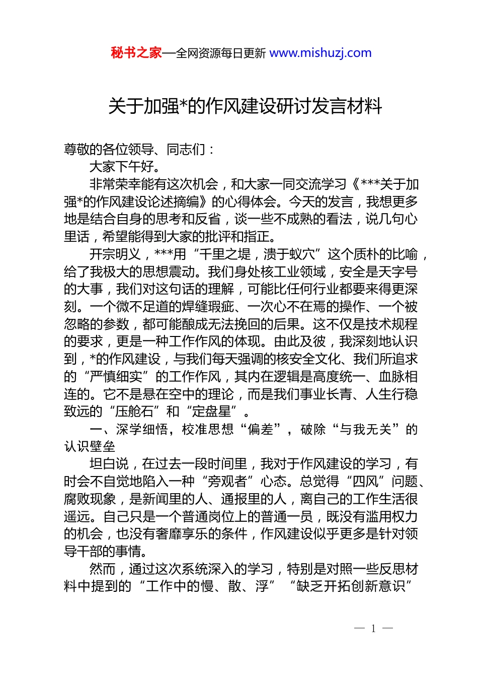 秘书之家—全网资源每日更新 www.mishuzj.com关于加强*的作风建设研讨发言材料尊敬的各位领导、同志们:大家下午好。非常荣幸能有这次机会,和大家一同交流学习《***关于加强*的作风建设论述摘编》的心得体会。今天的发言,我想更多地是结合自身的思考和反省,谈一些不成熟的看法,说几句心里话,希望能得到大家的批评和指正。开宗明义,***用“千里之堤,溃于蚁穴”这个质朴的比喻,给了我极大的思想震动。我们身处核工业领域,安全是天字号的大事,我们对这句话的理解,可能比任何行业都要来得更深刻。一个微不足道的焊缝瑕疵、一次心不在焉的操作、一个被忽略的参数,都可能酿成无法挽回的后果。这不仅是技术规程的要求,更是一种工作作风的体现。由此及彼,我深刻地认识到,*的作风建设,与我们每天强调的核安全文化、我们所追求的“严慎细实”的工作作风,其内在逻辑是高度统一、血脉相连的。它不是悬在空中的理论,而是我们事业长青、人生行稳致远的“压舱石”和“定盘星”。一、深学细悟,校准思想“偏差”,破除“与我无关”的认识壁垒坦白说,在过去一段时间里,我对于作风建设的学习,有时会不自觉地陷入一种“旁观者”心态。总觉得“四风”问题、腐败现象,是新闻里的人、通报里的人,离自己的工作生活很遥远。自己只是一个普通岗位上的普通一员,既没有滥用权力的机会,也没有奢靡享乐的条件,作风建设似乎更多是针对领导干部的事情。然而,通过这次系统深入的学习,特别是对照一些反思材料中提到的“工作中的慢、散、浮”“缺乏开拓创新意识”— 1 —秘书之家—全网资源每日更新 www.mishuzj.com“对群众态度冷淡”等问题,我才猛然警醒,原来不正之风的表现形式是多种多样的,它不仅仅是贪污腐败那样面目狰狞的“大老虎”,更多时候,它潜藏在一些看似微不足道的“小节”之中。比如,在工作中是否存在满足于现状、得过且过的思想?面对部门提出的紧急采购需求,我是不是第一时间主动对接、想方设法解决,还是觉得流程繁琐、心生厌烦,服务态度打了折扣?在推进一些难度较大的工作时,有没有因为畏难情绪而“绕道走”,缺乏“咬定青山不放松”的韧劲和闯劲?在学习上,是否满足于“已读”“已看”,而没有真正做到入脑入心,用新理论指导新实践?这些问题,拷问的正是我们的工作作风,而其根源,恰恰是***指出的*性问题。作风是外在表现,*性是内在根本,“本不正则形必散”。认识到这一点,我才真正把作风建设从一个“宏大叙事”拉回到自己的日常工作和一言一行中,从“与我无关”转变为“人人有责、我必担责”的自觉。二、对镜自查,反思行为“温差”,纠治“习焉不察”的惯性思维***告诫我们,“全面从严治*永远在路上,*的自我革命永远在路上”。这条路,具体到我们每个人身上,就是一条不断自我净化、自我完善、自我革新、自我提高的修行之路。对照八项规定精神和作风建设的要求这面镜子,我感到自身在一些方面仍然存在“温差”,存在一些习以为常却不尽合理的“小毛病”。一是在“严”的程度上存在温差。我们核工业人讲究“严慎细实”,但在工作细节之外,有时对自己的要求就有所放松。比如,面对一些司空见惯的行业“潜规则”或社会上的不良风气,虽然自己能够做到不参与、不附和,但缺少旗帜鲜明抵制和斗争的勇气,有时抱着“事不关己,高高挂起”的心态。这种对错误现象的“宽容”,实际上就是对自我要求的“放松”,— 2 —秘书之家—全网资源每日更新 www.mishuzj.com是“严”得不够彻底的表现。二是在“实”的劲头上存在温差。在工作中,有时会不自觉地陷入事务主义,忙于应付日常流程和任务节点,对于如何优化工作方法、提升服务效能、更好地服务一线需求,主动思考和系统谋划不够。面对一些跨部门的“硬骨头”问题,有时习惯于等待上级指令或者依赖既有经验,主动担当、攻坚克难的“实劲儿”显现不足。这与我们当前面临的复杂市场环境和推动高质量发展的要求,是有差距的。三是在“廉”的防线上存在温差。作为身处 xx 公司的一员,尤其是在采购、项目等关键岗位上的同志,我们时刻面临着各种考验。一顿看似平常的饭局、一份貌似平常的“土特产...