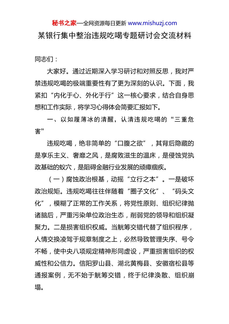秘书之家—全网资源每日更新 www.mishuzj.com某银行集中整治违规吃喝专题研讨会交流材料 同志们:大家好。通过近期深入学习研讨和对照反思,我对严禁违规吃喝的极端重要性有了更为深刻的认识。下面,我紧扣“内化于心、外化于行”这一核心要求,结合自身思想和工作实际,将学习心得体会简要汇报如下。一、以如履薄冰的清醒,认清违规吃喝的“三重危害”违规吃喝,绝非简单的“口腹之欲”,其背后隐藏的是享乐主义、奢靡之风,是腐败滋生的温床,是侵蚀党执政基础的蚁穴,是阻碍金融行业发展的顽瘴痼疾。(一)腐蚀政治根基,动摇“立行之本”。一是破坏政治规矩。违规吃喝往往伴随着“圈子文化”、“码头文化”,模糊了正常的工作关系,将党性原则、组织纪律抛诸脑后,严重污染单位政治生态,削弱党的领导和组织凝聚力。二是损害组织权威。当觥筹交错代替了组织程序,人情交换凌驾于规章制度之上,必然导致管理失序、号令不畅,使中央八项规定精神形同虚设,严重损害组织的权威性和公信力。信阳罗山县、湖北黄梅县、安徽宿松县等通报案例,无不始于觥筹交错,终于纪律涣散、组织崩塌。秘书之家—全网资源每日更新 www.mishuzj.com(二)侵蚀廉洁防线,诱发“金融风险”。一是滋生腐败温床。一顿饭、一杯酒,极易成为利益输送、权力寻租的“敲门砖”。在信贷审批、不良资产处置、大额采购、人事安排等关键领域,违规吃喝往往是“围猎”与“被围猎”的起点。系统内通报的典型案例警示我们,多少腐败分子正是从“舌尖上的腐败”滑向“深渊里的罪恶”,将公权力异化为谋取私利的工具。二是增加经营成本。无论是套取费用报销,还是接受管理服务对象的宴请,最终都转化为我们的运营成本,侵蚀利润,损害的是全体职工的利益。奢靡享乐之风盛行,更会助长攀比浪费,背离服务“*”、艰苦奋斗的初心。(三)损害*形象,破坏“群众基础”。一是抹黑“百姓银行”声誉。*银行因*而生、伴*成长,“*精神”是我们的传家宝。党员干部频繁出入高档场所、接受客户宴请,在群众眼中就是特权思想和作风漂浮的体现,严重背离服务“*”的宗旨,损害“百姓银行”的金字招牌和群众基础。二是消解干事创业氛围。心思花在应酬吃喝上,精力耗在人情往来中,必然导致工作浮于表面、敷衍塞责,助长形式主义、官僚主义作风。长此以往,会严重挫伤实干者的积极性,消解全行上下攻坚克难、稳健发展的内生动力。二、以刀刃向内的勇气,做到“三个坚决”秘书之家—全网资源每日更新 www.mishuzj.com以此次交流研讨会为契机,我在此郑重表态:(一)坚决扛牢政治责任,严格遵规守纪。一是深刻认识违规吃喝问题的政治本质和严重危害,时刻绷紧纪律规矩这根弦。带头深入学习习近平总书记关于党的自我革命的重要思想、关于作风建设的重要论述、考察河南重要讲话精神以及省委“十严禁”等铁规禁令,不断提高政治判断力、政治领悟力、政治执行力。二是坚决摒弃“人情难却”、“小节无害”等错误思想,把抵制违规吃喝作为检验党性原则的“试金石”,作为捍卫“两个确立”、做到“两个维护”的具体行动。三是旗帜鲜明地传递“违规吃喝零容忍”的强烈信号,对苗头性、倾向性问题及时“红脸出汗”,对顶风违纪行为坚决查处,绝不搞下不为例、网开一面,以严的基调、严的措施、严的氛围涵养清风正气。(二)坚决严守纪律底线,高度廉洁自律。一是管住“嘴”。严格执行公务接待、商务招待规定,决不超标准、超范围接待;坚决拒绝管理服务对象、贷款客户、供应商等任何可能影响公正执行公务的宴请;带头倡导简朴健康的饮食习惯,自觉抵制“舌尖上的腐败”。二是管住“手”。决不违规报销任何应由个人承担的吃喝费用;决不利用职权或职务影响向下属单位、管理服务对象转嫁吃喝费用。三是管住“圈”。自觉净化社交圈、生活圈、朋秘书之家—全网资源每日更新 www.mishuzj.com友圈,远离“酒局”、“饭局”陷阱,培育积极健康的生活情趣,保持清清爽爽的同志关系、规规矩矩的上下级关系、干干净净的银企关系。(三)坚决融入重点工作,狠抓业务发展。一是要着力压实管理责任。各业务条线应当通过“拳头产品”和优质服务来营销拓户...