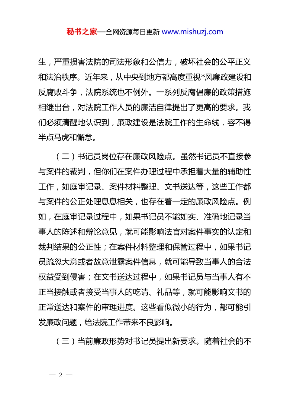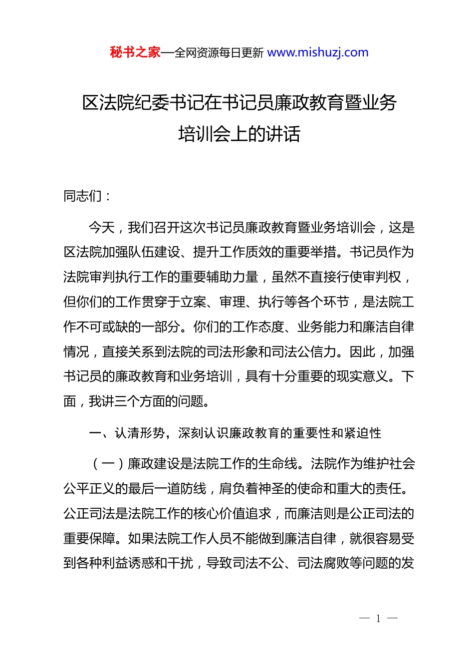 秘书之家—全网资源每日更新 www.mishuzj.com区法院纪委书记在书记员廉政教育暨业务培训会上的讲话同志们:今天,我们召开这次书记员廉政教育暨业务培训会,这是区法院加强队伍建设、提升工作质效的重要举措。书记员作为法院审判执行工作的重要辅助力量,虽然不直接行使审判权,但你们的工作贯穿于立案、审理、执行等各个环节,是法院工作不可或缺的一部分。你们的工作态度、业务能力和廉洁自律情况,直接关系到法院的司法形象和司法公信力。因此,加强书记员的廉政教育和业务培训,具有十分重要的现实意义。下面,我讲三个方面的问题。一、认清形势,深刻认识廉政教育的重要性和紧迫性(一)廉政建设是法院工作的生命线。法院作为维护社会公平正义的最后一道防线,肩负着神圣的使命和重大的责任。公正司法是法院工作的核心价值追求,而廉洁则是公正司法的重要保障。如果法院工作人员不能做到廉洁自律,就很容易受到各种利益诱惑和干扰,导致司法不公、司法腐败等问题的发— 1 —秘书之家—全网资源每日更新 www.mishuzj.com生,严重损害法院的司法形象和公信力,破坏社会的公平正义和法治秩序。近年来,从中央到地方都高度重视*风廉政建设和反腐败斗争,法院系统也不例外。一系列反腐倡廉的政策措施相继出台,对法院工作人员的廉洁自律提出了更高的要求。我们必须清醒地认识到,廉政建设是法院工作的生命线,容不得半点马虎和懈怠。(二)书记员岗位存在廉政风险点。虽然书记员不直接参与案件的裁判,但你们在案件办理过程中承担着大量的辅助性工作,如庭审记录、案件材料整理、文书送达等,这些工作都与案件的公正处理息息相关,也存在着一定的廉政风险点。例如,在庭审记录过程中,如果书记员不能如实、准确地记录当事人的陈述和辩论意见,就可能影响法官对案件事实的认定和裁判结果的公正性;在案件材料整理和保管过程中,如果书记员疏忽大意或者故意泄露案件信息,就可能导致当事人的合法权益受到侵害;在文书送达过程中,如果书记员与当事人有不正当接触或者接受当事人的吃请、礼品等,就可能影响文书的正常送达和案件的审理进度。这些看似微小的行为,都可能引发廉政问题,给法院工作带来不良影响。(三)当前廉政形势对书记员提出新要求。随着社会的不— 2 —秘书之家—全网资源每日更新 www.mishuzj.com断发展和进步,人民群众对司法公正的期望越来越高,对法院工作人员的廉洁自律要求也越来越严格。同时,随着信息技术的发展和互联网的普及,司法工作越来越透明,法院工作人员的一举一动都处于社会公众的监督之下。在这样的形势下,书记员必须时刻保持清醒的头脑,增强廉洁自律意识,严格遵守廉洁自律的各项规定,自觉抵制各种诱惑和腐败行为。要树立正确的世界观、人生观和价值观,坚守法律底线和道德底线,做到清正廉洁、公道正派,以良好的形象和作风赢得人民群众的信任和支持。二、强化学习,不断提升业务能力和综合素质(一)加强法律知识学习。大家知道,书记员的工作与法律密切相关,具备一定的法律知识是做好书记员工作的基础。你们要加强对宪法、刑法、民法、诉讼法等基本法律知识的学习,了解法律的基本原理和原则,掌握法律条文的含义和适用范围。同时,要关注法律法规的更新和变化,及时学习和掌握新的法律规定和司法解释,不断更新自己的法律知识结构。通过学习法律知识,提高自己的法律素养和法律思维能力,为准确记录庭审内容、整理案件材料、协助法官办理案件提供有力的法律支持。— 3 —秘书之家—全网资源每日更新 www.mishuzj.com(二)提升庭审记录技能。庭审记录是书记员的一项重要工作职责,准确、完整、清晰地记录庭审过程是保证案件公正审理的重要环节。要提高庭审记录技能,首先要做好庭前准备工作。在庭审前,要认真阅读案件材料,了解案件的基本情况、争议焦点和当事人的诉求,熟悉相关法律条文和证据规则,为庭审记录做好充分的准备。其次,要掌握正确的记录方法。在庭审过程中,要集中精力,认真倾听当事人的陈述和辩论意见,运用规范的记录符号和简洁的语言,准确、完整地记录庭审内容。对于当事人的重要陈述和关键证据,要重点...