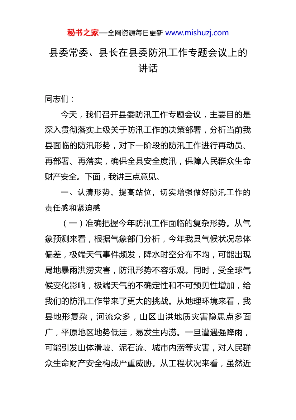 秘书之家—全网资源每日更新 www.mishuzj.com县委常委、县长在县委防汛工作专题会议上的讲话 同志们:今天,我们召开县委防汛工作专题会议,主要目的是深入贯彻落实上级关于防汛工作的决策部署,分析当前我县面临的防汛形势,对下一阶段的防汛工作进行再动员、再部署、再落实,确保全县安全度汛,保障人民群众生命财产安全。下面,我讲三点意见。一、认清形势,提高站位,切实增强做好防汛工作的责任感和紧迫感(一)准确把握今年防汛工作面临的复杂形势。从气象预测来看,根据气象部门分析,今年我县气候状况总体偏差,极端天气事件频发,降水时空分布不均,可能出现局地暴雨洪涝灾害,防汛形势不容乐观。同时,受全球气候变化影响,极端天气的不确定性和不可预见性增加,给我们的防汛工作带来了更大的挑战。从地理环境来看,我县地形复杂,河流众多,山区山洪地质灾害隐患点多面广,平原地区地势低洼,易发生内涝。一旦遭遇强降雨,可能引发山体滑坡、泥石流、城市内涝等灾害,对人民群众生命财产安全构成严重威胁。从工程状况来看,虽然近秘书之家—全网资源每日更新 www.mishuzj.com年来我们加大了水利基础设施建设投入,但部分水利工程仍存在老化失修、防洪标准不高等问题,一些河道行洪能力不足,堤防险工险段较多,难以抵御较大洪水。此外,城市排水系统也存在一些薄弱环节,排水不畅问题时有发生。(二)深刻认识防汛工作的重要意义。防汛工作事关人民群众生命财产安全,事关经济社会发展大局,是一项保民生、促发展、稳大局的重要工作。做好防汛工作,是践行以人民为中心发展思想的具体体现。我们要始终把人民群众生命安全放在首位,在防汛工作中想群众之所想、急群众之所急、解群众之所难,全力保障人民群众生命财产安全,让人民群众感受到党和政府的关怀和温暖。做好防汛工作,是维护社会稳定的重要保障。洪水灾害往往会造成房屋倒塌、道路中断、农田被淹等严重后果,给人民群众生产生活带来极大困难,容易引发社会不稳定因素。只有做好防汛工作,有效应对洪水灾害,才能维护社会和谐稳定,为经济社会发展创造良好环境。做好防汛工作,是推动经济高质量发展的必然要求。我县正处于加快发展的关键时期,各类建设项目众多,一旦遭受洪水灾害,将给项目建设、企业生产等造成巨大损失,影响经济发展进程。加强防汛工作,能够有效降低洪水灾害对经济发展的秘书之家—全网资源每日更新 www.mishuzj.com影响,保障经济持续健康发展。(三)切实增强做好防汛工作的责任感和紧迫感。当前,防汛工作已经进入关键时期,时间紧迫、任务艰巨、责任重大。全县各级各部门和广大党员干部要充分认识到防汛工作的重要性和紧迫性,坚决克服麻痹思想和侥幸心理,牢固树立“防大汛、抢大险、救大灾”的思想,以高度的政治责任感和使命感,全身心投入到防汛工作中去。要严格按照县委、县政府的部署要求,立足防大汛、抗大洪、抢大险、救大灾,扎实做好各项防范准备工作,确保防汛工作万无一失。二、突出重点,强化措施,扎实做好防汛各项工作(一)加强监测预警,提高预报精准度。监测预警是防汛工作的第一道防线。气象、水利、自然资源等部门要密切监视天气变化和雨情、水情、工情、险情、灾情发展,加强联合会商和分析研判,提高预报精准度和时效性。要充分利用现代信息技术手段,建立健全监测预警体系,扩大监测覆盖范围,提高监测密度和频率。一旦发现险情,要及时准确发布预警信息,确保预警信息第一时间传递到村、到户、到人。同时,要充分利用广播、电视、手机短信、微信等多种渠道,广泛宣传防汛知识和预警信息,提高群众的自我防范意识和自救能力。秘书之家—全网资源每日更新 www.mishuzj.com(二)强化隐患排查整治,消除安全风险。隐患排查整治是防汛工作的关键环节。各乡镇、各部门要按照“横到边、纵到底、不留死角”的原则,对全县范围内的水库、堤防、闸坝、山洪地质灾害隐患点、城市低洼地带、在建工程等重点部位进行全面深入排查。对排查出的隐患,要建立台账,明确整改责任人、整改措施和整改期限,实行销号管理,确保隐患整改到位。对于一时难以整改到位的隐患,要制...