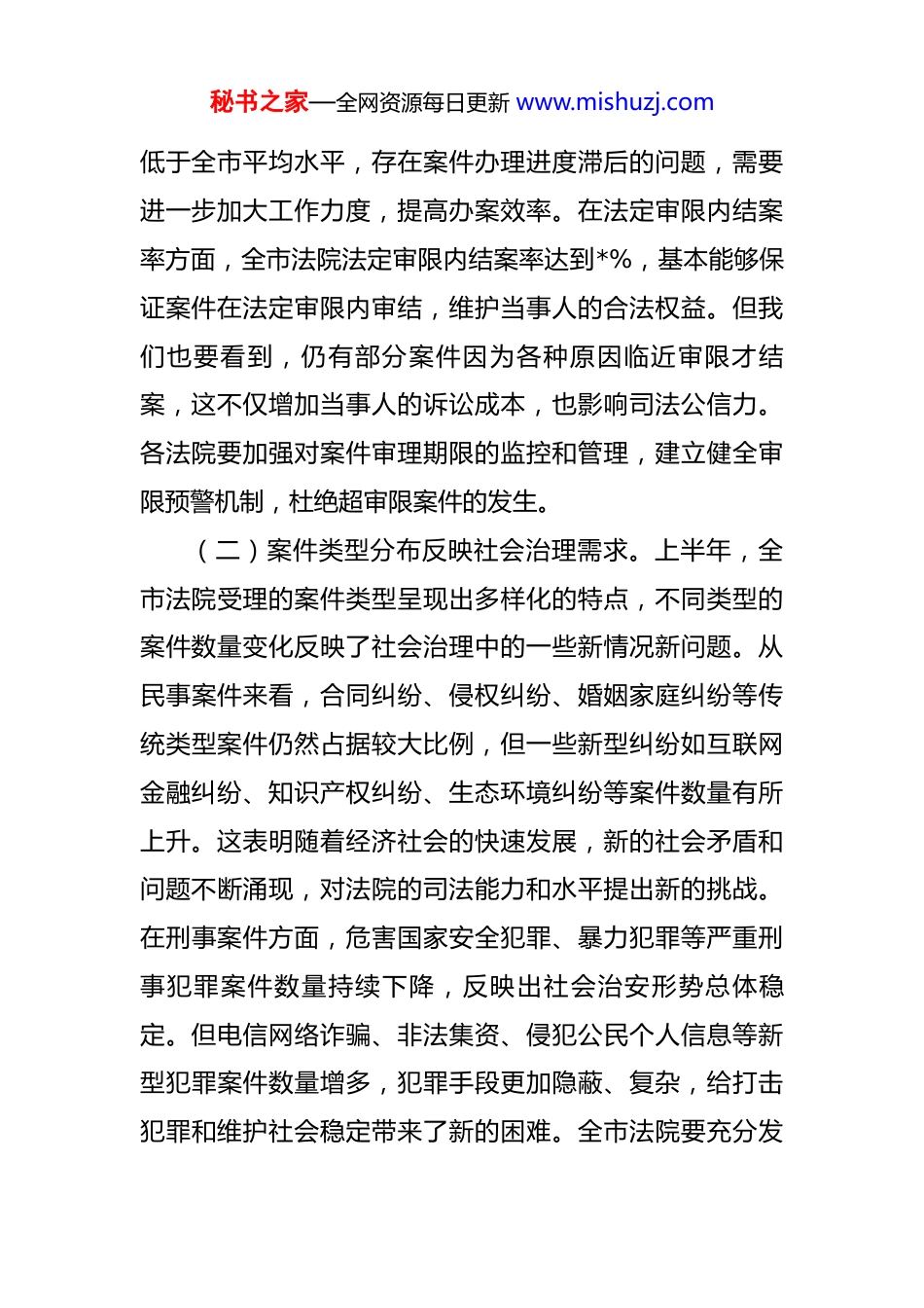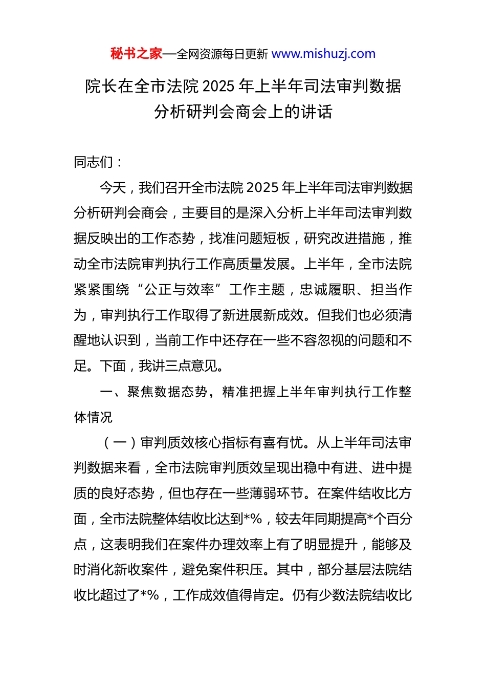 秘书之家—全网资源每日更新 www.mishuzj.com院长在全市法院 2025 年上半年司法审判数据分析研判会商会上的讲话 同志们:今天,我们召开全市法院 2025 年上半年司法审判数据分析研判会商会,主要目的是深入分析上半年司法审判数据反映出的工作态势,找准问题短板,研究改进措施,推动全市法院审判执行工作高质量发展。上半年,全市法院紧紧围绕“公正与效率”工作主题,忠诚履职、担当作为,审判执行工作取得了新进展新成效。但我们也必须清醒地认识到,当前工作中还存在一些不容忽视的问题和不足。下面,我讲三点意见。一、聚焦数据态势,精准把握上半年审判执行工作整体情况(一)审判质效核心指标有喜有忧。从上半年司法审判数据来看,全市法院审判质效呈现出稳中有进、进中提质的良好态势,但也存在一些薄弱环节。在案件结收比方面,全市法院整体结收比达到*%,较去年同期提高*个百分点,这表明我们在案件办理效率上有了明显提升,能够及时消化新收案件,避免案件积压。其中,部分基层法院结收比超过了*%,工作成效值得肯定。仍有少数法院结收比秘书之家—全网资源每日更新 www.mishuzj.com低于全市平均水平,存在案件办理进度滞后的问题,需要进一步加大工作力度,提高办案效率。在法定审限内结案率方面,全市法院法定审限内结案率达到*%,基本能够保证案件在法定审限内审结,维护当事人的合法权益。但我们也要看到,仍有部分案件因为各种原因临近审限才结案,这不仅增加当事人的诉讼成本,也影响司法公信力。各法院要加强对案件审理期限的监控和管理,建立健全审限预警机制,杜绝超审限案件的发生。(二)案件类型分布反映社会治理需求。上半年,全市法院受理的案件类型呈现出多样化的特点,不同类型的案件数量变化反映了社会治理中的一些新情况新问题。从民事案件来看,合同纠纷、侵权纠纷、婚姻家庭纠纷等传统类型案件仍然占据较大比例,但一些新型纠纷如互联网金融纠纷、知识产权纠纷、生态环境纠纷等案件数量有所上升。这表明随着经济社会的快速发展,新的社会矛盾和问题不断涌现,对法院的司法能力和水平提出新的挑战。在刑事案件方面,危害国家安全犯罪、暴力犯罪等严重刑事犯罪案件数量持续下降,反映出社会治安形势总体稳定。但电信网络诈骗、非法集资、侵犯公民个人信息等新型犯罪案件数量增多,犯罪手段更加隐蔽、复杂,给打击犯罪和维护社会稳定带来了新的困难。全市法院要充分发秘书之家—全网资源每日更新 www.mishuzj.com挥刑事审判职能作用,依法严惩各类刑事犯罪,特别是要加大对新型犯罪的打击力度,维护社会安全稳定。(三)区域差异体现司法资源配置需求。从各法院的审判数据来看,不同区域法院之间的案件数量、审判质效等方面存在一定差异。城区法院由于人口密集、经济活跃,案件数量相对较多,法官人均办案量较大,司法资源相对紧张。而部分偏远地区法院案件数量相对较少,司法资源存在一定的闲置现象。这种区域差异反映了司法资源配置的不均衡性,需要我们进一步优化司法资源配置,提高司法资源利用效率。不同区域法院在审判理念、审判方式、审判管理等方面也存在一些差异,导致审判质效参差不齐。各法院要加强交流学习,相互借鉴先进经验和做法,共同提高审判质效。市中院要加强对基层法院的指导和监督,建立健全审判质效评估体系,促进全市法院审判工作的均衡发展。二、直面问题短板,深刻剖析影响审判质效的根源(一)司法理念有待进一步更新。部分法官对新时代司法理念的理解和把握还不够准确,存在就案办案、机械司法的现象,没有充分考虑案件背后的社会效果和政治效果。在处理一些涉及民生、社会热点问题的案件时,不能很好地平衡法律适用与社会稳定的关系,导致案件处理结秘书之家—全网资源每日更新 www.mishuzj.com果难以得到社会公众的认可。在处理一些劳动争议案件时,部分法官过于注重法律条文的适用,忽视了劳动者的合法权益保护和企业的发展需求,引发了社会矛盾。一些法官对司法为民理念的认识还不够深刻,在诉讼服务、司法公开等方面还存在一些不足,没有为当事人提供更加便捷、高效、优质的司法服务。部分法院的诉讼服务中...