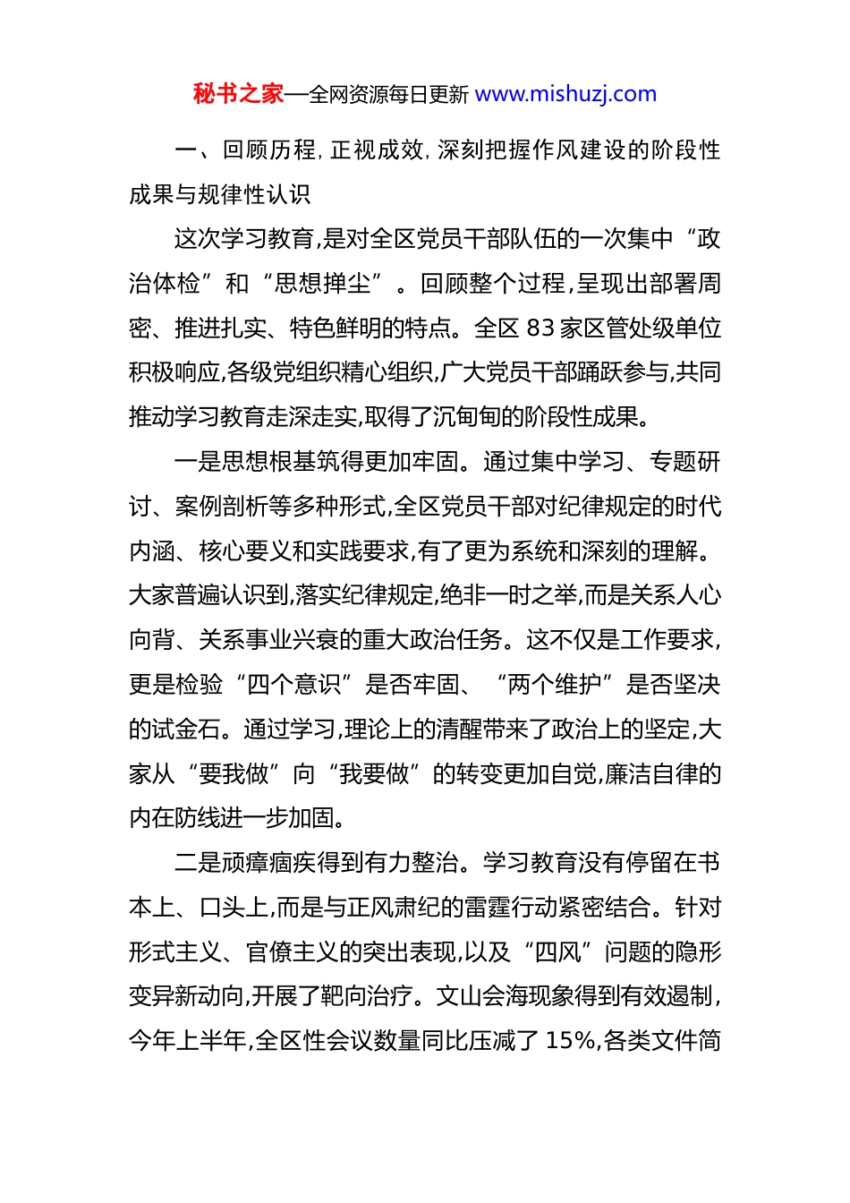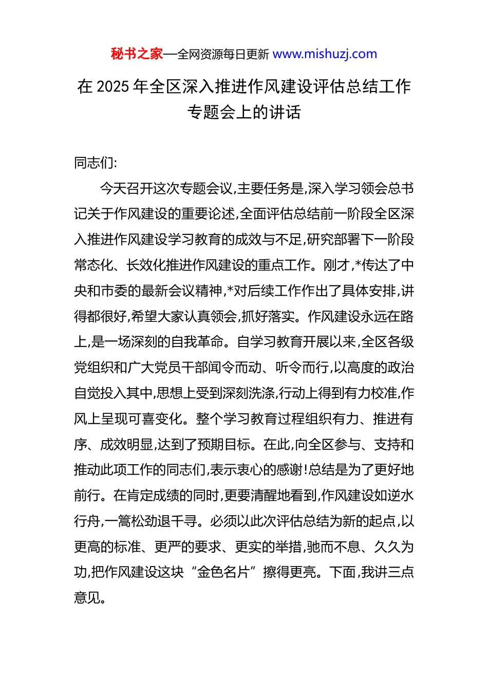 秘书之家—全网资源每日更新 www.mishuzj.com在 2025 年全区深入推进作风建设评估总结工作专题会上的讲话 同志们:今天召开这次专题会议,主要任务是,深入学习领会总书记关于作风建设的重要论述,全面评估总结前一阶段全区深入推进作风建设学习教育的成效与不足,研究部署下一阶段常态化、长效化推进作风建设的重点工作。刚才,*传达了中央和市委的最新会议精神,*对后续工作作出了具体安排,讲得都很好,希望大家认真领会,抓好落实。作风建设永远在路上,是一场深刻的自我革命。自学习教育开展以来,全区各级党组织和广大党员干部闻令而动、听令而行,以高度的政治自觉投入其中,思想上受到深刻洗涤,行动上得到有力校准,作风上呈现可喜变化。整个学习教育过程组织有力、推进有序、成效明显,达到了预期目标。在此,向全区参与、支持和推动此项工作的同志们,表示衷心的感谢!总结是为了更好地前行。在肯定成绩的同时,更要清醒地看到,作风建设如逆水行舟,一篙松劲退千寻。必须以此次评估总结为新的起点,以更高的标准、更严的要求、更实的举措,驰而不息、久久为功,把作风建设这块“金色名片”擦得更亮。下面,我讲三点意见。秘书之家—全网资源每日更新 www.mishuzj.com一、回顾历程,正视成效,深刻把握作风建设的阶段性成果与规律性认识这次学习教育,是对全区党员干部队伍的一次集中“政治体检”和“思想掸尘”。回顾整个过程,呈现出部署周密、推进扎实、特色鲜明的特点。全区 83 家区管处级单位积极响应,各级党组织精心组织,广大党员干部踊跃参与,共同推动学习教育走深走实,取得了沉甸甸的阶段性成果。一是思想根基筑得更加牢固。通过集中学习、专题研讨、案例剖析等多种形式,全区党员干部对纪律规定的时代内涵、核心要义和实践要求,有了更为系统和深刻的理解。大家普遍认识到,落实纪律规定,绝非一时之举,而是关系人心向背、关系事业兴衰的重大政治任务。这不仅是工作要求,更是检验“四个意识”是否牢固、“两个维护”是否坚决的试金石。通过学习,理论上的清醒带来了政治上的坚定,大家从“要我做”向“我要做”的转变更加自觉,廉洁自律的内在防线进一步加固。二是顽瘴痼疾得到有力整治。学习教育没有停留在书本上、口头上,而是与正风肃纪的雷霆行动紧密结合。针对形式主义、官僚主义的突出表现,以及“四风”问题的隐形变异新动向,开展了靶向治疗。文山会海现象得到有效遏制,今年上半年,全区性会议数量同比压减了 15%,各类文件简秘书之家—全网资源每日更新 www.mishuzj.com报数量压减了近 20%。调研工作更加深入基层、贴近实际,解决了一批群众反映强烈的急难愁盼问题,比如*街道的老旧小区加装电梯项目、*镇的农村人居环境整治工程等,都是在改进作风中推动的。一些潜滋暗长的“节日病”“人情风”得到有力刹遏,风清气正的政治生态持续巩固。三是制度笼子织得更加严密。坚持标本兼治,把“当下改”与“长久立”结合起来。各单位以此次学习教育为契机,对现有规章制度进行了一次全面“回头看”,系统梳理、查漏补缺。区级层面修订完善了公务接待、公务用车、会议活动管理等一系列制度规范,让制度“长牙”、纪律“带电”。各单位也结合自身实际,制定了更具操作性的实施细则。例如,区卫健系统针对医药购销领域的不正之风,完善了内部监管流程;区建管系统围绕工程招投标环节,强化了廉政风险防控机制。制度体系的不断完善,为作风建设常态长效提供了坚实的保障。四是干事创业的精气神得到有效提振。作风建设的最终目的,是凝聚起推动发展的强大正能量。通过学习教育,广大干部摆脱了不必要的应酬和事务性工作的羁绊,将更多时间和精力投入到谋发展、抓落实、优服务中。党员干部的先锋模范作用更加凸显,在经济发展主战场、社会治理第一线、服务群众最前沿,都能看到他们担当作为的身影。今年秘书之家—全网资源每日更新 www.mishuzj.com以来,全区几个重大的*产业项目、*民生工程能够顺利推进,与干部队伍展现出的过硬作风是密不可分的。实践证明,优良作风就是战斗力,就是生产力,就是凝聚力。在肯定成绩的同时,也必须清醒地认识到,这些成果是阶段性的,基础还不牢固。作风问题的顽固性和反复性不容低估,稍有松...