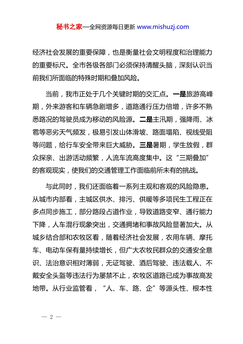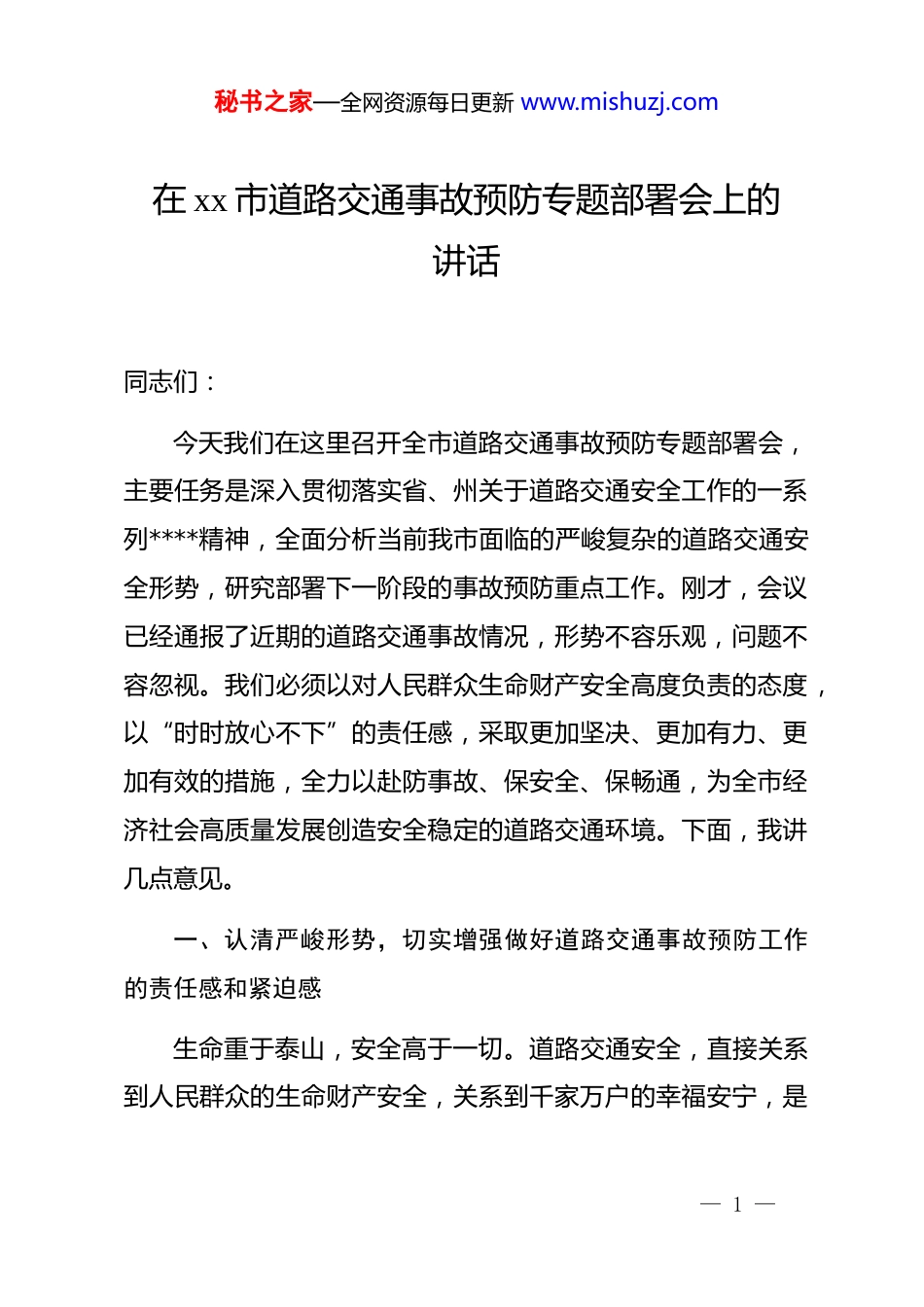 秘书之家—全网资源每日更新 www.mishuzj.com在 xx 市道路交通事故预防专题部署会上的讲话同志们:今天我们在这里召开全市道路交通事故预防专题部署会,主要任务是深入贯彻落实省、州关于道路交通安全工作的一系列****精神,全面分析当前我市面临的严峻复杂的道路交通安全形势,研究部署下一阶段的事故预防重点工作。刚才,会议已经通报了近期的道路交通事故情况,形势不容乐观,问题不容忽视。我们必须以对人民群众生命财产安全高度负责的态度,以“时时放心不下”的责任感,采取更加坚决、更加有力、更加有效的措施,全力以赴防事故、保安全、保畅通,为全市经济社会高质量发展创造安全稳定的道路交通环境。下面,我讲几点意见。一、认清严峻形势,切实增强做好道路交通事故预防工作的责任感和紧迫感生命重于泰山,安全高于一切。道路交通安全,直接关系到人民群众的生命财产安全,关系到千家万户的幸福安宁,是— 1 —秘书之家—全网资源每日更新 www.mishuzj.com经济社会发展的重要保障,也是衡量社会文明程度和治理能力的重要标尺。全市各级各部门必须保持清醒头脑,深刻认识当前我们所面临的特殊时期和叠加风险。当前,我市正处于几个关键时期的交汇点。一是旅游高峰期,外来游客和车辆急剧增多,道路通行压力倍增,许多不熟悉路况的驾驶员成为移动的风险源。二是主汛期,强降雨、冰雹等恶劣天气频发,极易引发山体滑坡、路面塌陷、视线受阻等问题,给行车安全带来巨大威胁。三是暑期,学生放假,群众探亲、出游活动频繁,人流车流高度集中。这“三期叠加”的客观现实,使我们的交通管理工作面临前所未有的挑战。与此同时,我们还面临着一系列主观和客观的风险隐患。从城市内部看,主城区供水、排污、供暖等多项民生工程正在多点同步施工,部分路段占道作业,导致道路变窄、通行能力下降,人车混行现象突出,交通拥堵和事故风险显著加大。从城乡结合部和农牧区看,随着经济社会发展,农用车辆、摩托车、电动车保有量持续增长,但广大农牧民群众的交通安全意识、法治意识相对薄弱,无证驾驶、酒后驾驶、违法载人、不戴安全头盔等违法行为屡禁不止,农牧区道路已成为事故高发地带。从行业监管看,“人、车、路、企”等源头性、根本性— 2 —秘书之家—全网资源每日更新 www.mishuzj.com问题依然突出,部分运输企业安全生产主体责任悬空,对驾驶员的日常教育管理不到位,对车辆的安全技术状况检查不彻底,重点车辆和驾驶人“带病上路”的现象时有发生。这些风险相互交织,这些隐患彼此叠加,构成了当前我市道路交通安全工作的复杂局面和严峻挑战。我们必须坚决摒弃麻痹思想和侥幸心理,牢固树立“人民至上、生命至上”的理念,把防范化解道路交通重大安全风险作为当前压倒一切的重要任务来抓,以最高的标准、最严的要求、最实的举措,坚决把道路交通安全风险降到最低,全力确保汛期、暑期期间全市道路交通安全形势持续稳定。二、深化隐患排查治理,坚决筑牢源头管控的第一道防线事故的发生,往往源于隐患的积累。预防事故,最根本、最有效的办法就是从源头上消除隐患。全市各成员单位要将隐患排查治理作为一项基础性、长期性的工作来抓,做到全覆盖、零容忍、严执法、重实效。一是要全面开展道路交通设施隐患排查。要组织力量,对全市范围内的国省干道、县乡公路、城市道路进行一次拉网式、地毯式的安全隐患大排查。要重点聚焦桥梁隧道、急弯陡坡、— 3 —秘书之家—全网资源每日更新 www.mishuzj.com临水临崖、长下坡以及事故多发路段,认真检查交通标志、标线、护栏、照明、排水等设施是否齐全有效。对排查出的风险隐患,必须建立详尽的任务清单和责任清单,明确整改单位、责任人、整改标准和完成时限,实行台账管理、挂账销号,确保每一处隐患都能得到及时、彻底的整改。对短期内难以整改到位的,必须立即采取增设警示标志、施划减速标线、安装爆闪警示灯等临时性安防措施,并向社会公告,提示过往车辆和行人注意安全。二是要全面压实企业安全生产主体责任。安全是企业发展的生命线。各行业主管部门要切实履行监管职责,督促“两客一危一货”等重点运输企业严格...