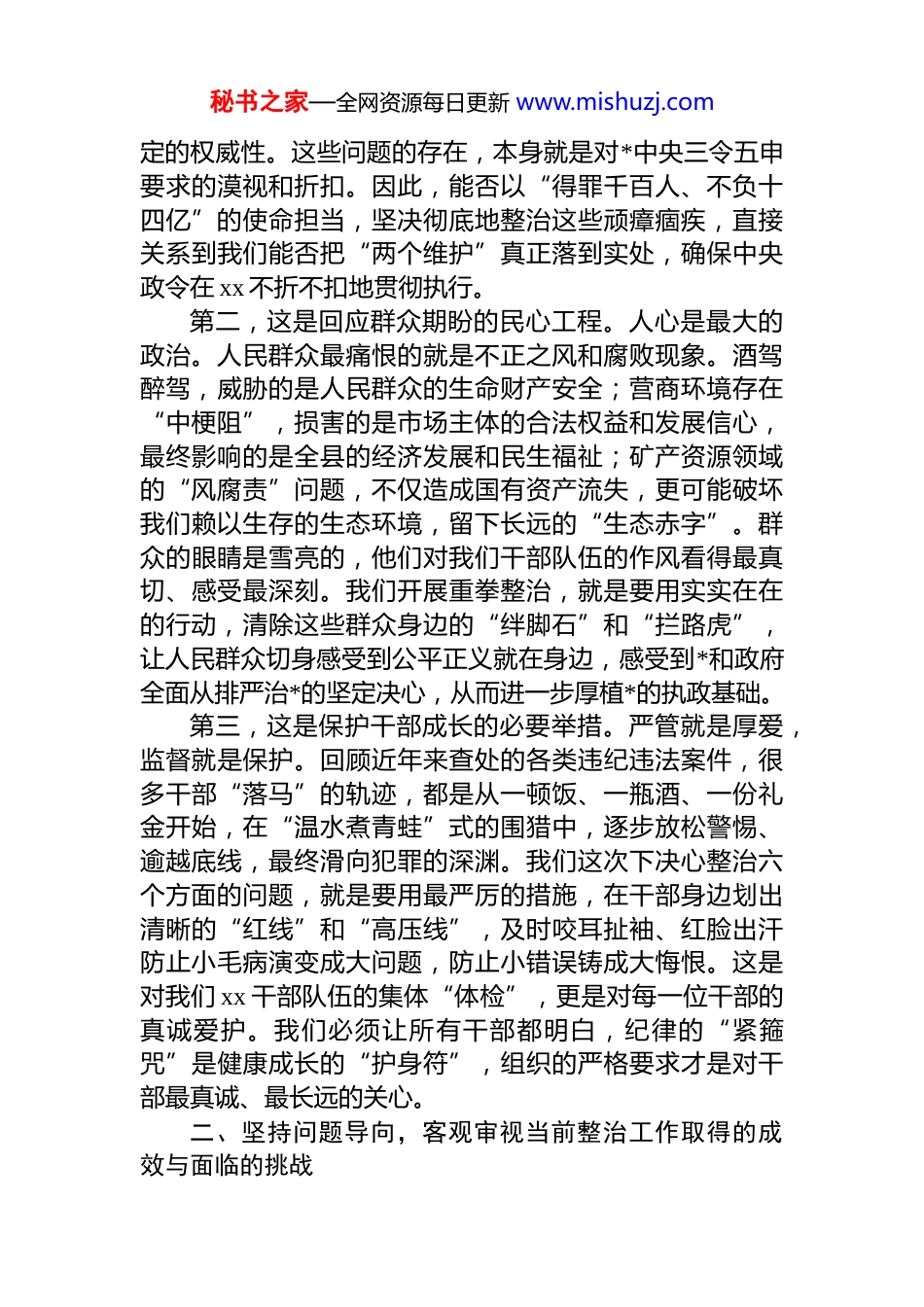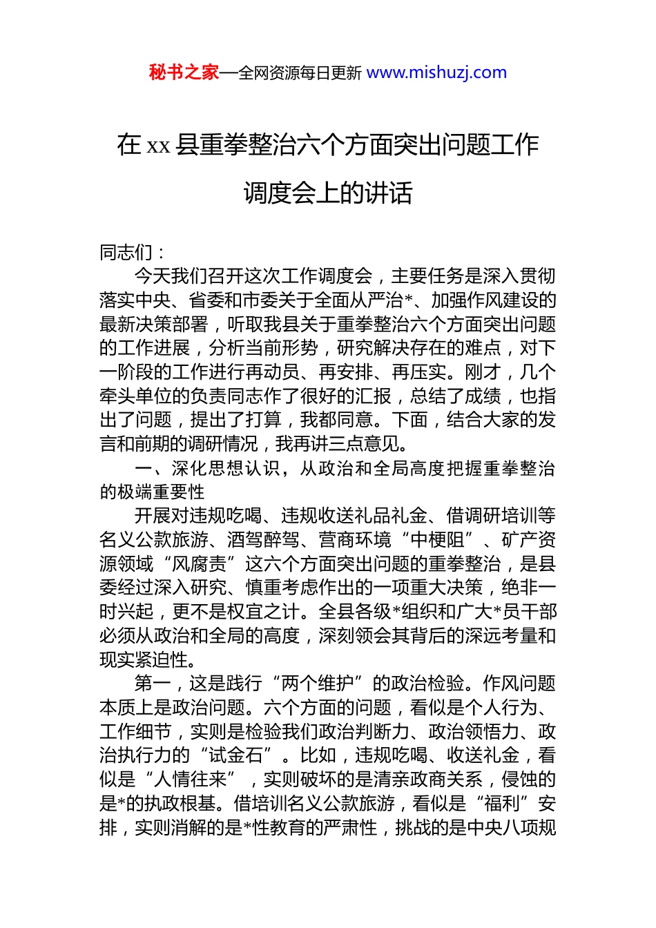 秘书之家—全网资源每日更新 www.mishuzj.com在 xx 县重拳整治六个方面突出问题工作调度会上的讲话同志们:今天我们召开这次工作调度会,主要任务是深入贯彻落实中央、省委和市委关于全面从严治*、加强作风建设的最新决策部署,听取我县关于重拳整治六个方面突出问题的工作进展,分析当前形势,研究解决存在的难点,对下一阶段的工作进行再动员、再安排、再压实。刚才,几个牵头单位的负责同志作了很好的汇报,总结了成绩,也指出了问题,提出了打算,我都同意。下面,结合大家的发言和前期的调研情况,我再讲三点意见。一、深化思想认识,从政治和全局高度把握重拳整治的极端重要性开展对违规吃喝、违规收送礼品礼金、借调研培训等名义公款旅游、酒驾醉驾、营商环境“中梗阻”、矿产资源领域“风腐责”这六个方面突出问题的重拳整治,是县委经过深入研究、慎重考虑作出的一项重大决策,绝非一时兴起,更不是权宜之计。全县各级*组织和广大*员干部必须从政治和全局的高度,深刻领会其背后的深远考量和现实紧迫性。第一,这是践行“两个维护”的政治检验。作风问题本质上是政治问题。六个方面的问题,看似是个人行为、工作细节,实则是检验我们政治判断力、政治领悟力、政治执行力的“试金石”。比如,违规吃喝、收送礼金,看似是“人情往来”,实则破坏的是清亲政商关系,侵蚀的是*的执政根基。借培训名义公款旅游,看似是“福利”安排,实则消解的是*性教育的严肃性,挑战的是中央八项规秘书之家—全网资源每日更新 www.mishuzj.com定的权威性。这些问题的存在,本身就是对*中央三令五申要求的漠视和折扣。因此,能否以“得罪千百人、不负十四亿”的使命担当,坚决彻底地整治这些顽瘴痼疾,直接关系到我们能否把“两个维护”真正落到实处,确保中央政令在 xx 不折不扣地贯彻执行。第二,这是回应群众期盼的民心工程。人心是最大的政治。人民群众最痛恨的就是不正之风和腐败现象。酒驾醉驾,威胁的是人民群众的生命财产安全;营商环境存在“中梗阻”,损害的是市场主体的合法权益和发展信心,最终影响的是全县的经济发展和民生福祉;矿产资源领域的“风腐责”问题,不仅造成国有资产流失,更可能破坏我们赖以生存的生态环境,留下长远的“生态赤字”。群众的眼睛是雪亮的,他们对我们干部队伍的作风看得最真切、感受最深刻。我们开展重拳整治,就是要用实实在在的行动,清除这些群众身边的“绊脚石”和“拦路虎”,让人民群众切身感受到公平正义就在身边,感受到*和政府全面从排严治*的坚定决心,从而进一步厚植*的执政基础。第三,这是保护干部成长的必要举措。严管就是厚爱,监督就是保护。回顾近年来查处的各类违纪违法案件,很多干部“落马”的轨迹,都是从一顿饭、一瓶酒、一份礼金开始,在“温水煮青蛙”式的围猎中,逐步放松警惕、逾越底线,最终滑向犯罪的深渊。我们这次下决心整治六个方面的问题,就是要用最严厉的措施,在干部身边划出清晰的“红线”和“高压线”,及时咬耳扯袖、红脸出汗防止小毛病演变成大问题,防止小错误铸成大悔恨。这是对我们 xx 干部队伍的集体“体检”,更是对每一位干部的真诚爱护。我们必须让所有干部都明白,纪律的“紧箍咒”是健康成长的“护身符”,组织的严格要求才是对干部最真诚、最长远的关心。二、坚持问题导向,客观审视当前整治工作取得的成效与面临的挑战秘书之家—全网资源每日更新 www.mishuzj.com自专项整治工作启动以来,全县各级各部门迅速行动,按照县委的统一部署,做了大量工作,取得了一定的阶段性成效。但我们必须清醒地认识到,作风问题的顽固性和反复性超乎想象,一些深层次问题尚未根本解决,整治工作依然任重道远。在刹住“四风”惯性,净化交往圈方面,我们保持了高压态势。针对违规吃喝、违规收送礼品礼金、借培训名义公款旅游这三类问题,我们常态化开展警示教育,紧盯节假日等重要节点强化监督检查。但我们必须看到,这些问题正呈现出新的变异形态。有的“不吃公款吃老板”,由明转暗,转移到私密会所、企业食堂、边远农家乐;有的通过快递、电子礼品卡、金融产品等隐蔽方式收送礼品礼金,手段更加翻新...