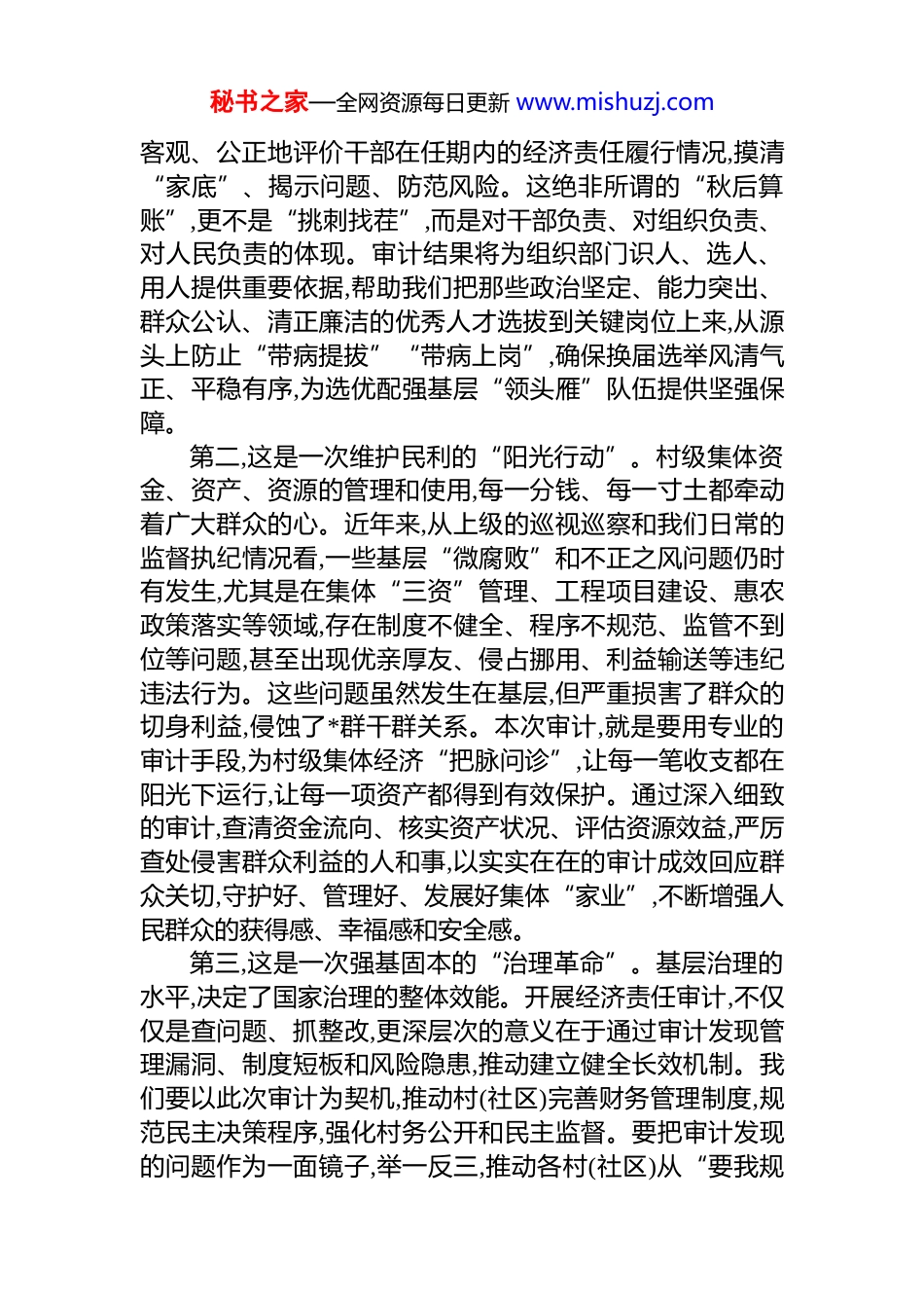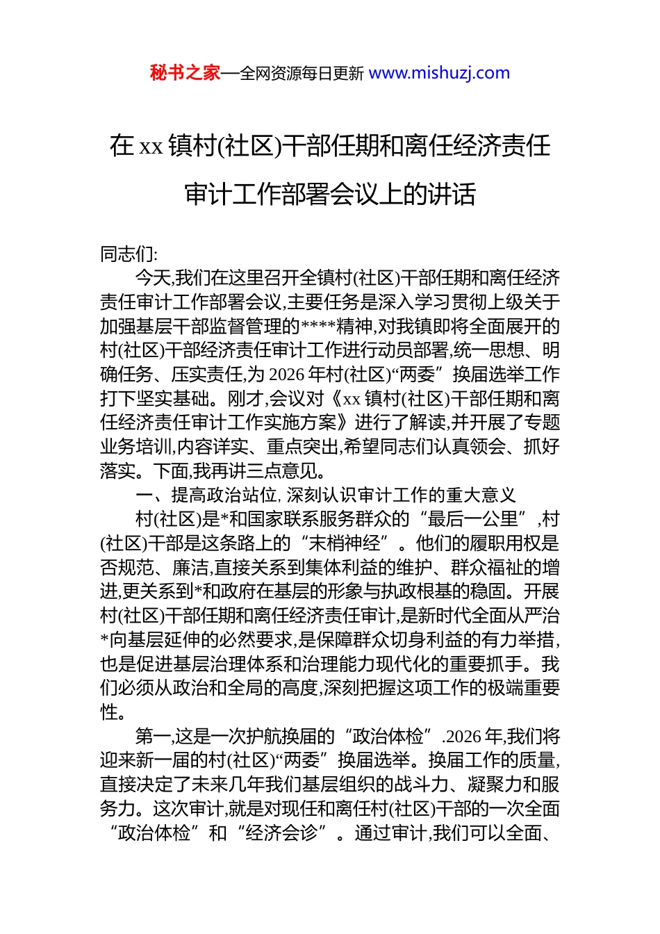 秘书之家—全网资源每日更新 www.mishuzj.com在 xx 镇村(社区)干部任期和离任经济责任审计工作部署会议上的讲话同志们:今天,我们在这里召开全镇村(社区)干部任期和离任经济责任审计工作部署会议,主要任务是深入学习贯彻上级关于加强基层干部监督管理的****精神,对我镇即将全面展开的村(社区)干部经济责任审计工作进行动员部署,统一思想、明确任务、压实责任,为 2026 年村(社区)“两委”换届选举工作打下坚实基础。刚才,会议对《xx 镇村(社区)干部任期和离任经济责任审计工作实施方案》进行了解读,并开展了专题业务培训,内容详实、重点突出,希望同志们认真领会、抓好落实。下面,我再讲三点意见。一、提高政治站位,深刻认识审计工作的重大意义村(社区)是*和国家联系服务群众的“最后一公里”,村(社区)干部是这条路上的“末梢神经”。他们的履职用权是否规范、廉洁,直接关系到集体利益的维护、群众福祉的增进,更关系到*和政府在基层的形象与执政根基的稳固。开展村(社区)干部任期和离任经济责任审计,是新时代全面从严治*向基层延伸的必然要求,是保障群众切身利益的有力举措,也是促进基层治理体系和治理能力现代化的重要抓手。我们必须从政治和全局的高度,深刻把握这项工作的极端重要性。第一,这是一次护航换届的“政治体检”.2026 年,我们将迎来新一届的村(社区)“两委”换届选举。换届工作的质量,直接决定了未来几年我们基层组织的战斗力、凝聚力和服务力。这次审计,就是对现任和离任村(社区)干部的一次全面“政治体检”和“经济会诊”。通过审计,我们可以全面、秘书之家—全网资源每日更新 www.mishuzj.com客观、公正地评价干部在任期内的经济责任履行情况,摸清“家底”、揭示问题、防范风险。这绝非所谓的“秋后算账”,更不是“挑刺找茬”,而是对干部负责、对组织负责、对人民负责的体现。审计结果将为组织部门识人、选人、用人提供重要依据,帮助我们把那些政治坚定、能力突出、群众公认、清正廉洁的优秀人才选拔到关键岗位上来,从源头上防止“带病提拔”“带病上岗”,确保换届选举风清气正、平稳有序,为选优配强基层“领头雁”队伍提供坚强保障。第二,这是一次维护民利的“阳光行动”。村级集体资金、资产、资源的管理和使用,每一分钱、每一寸土都牵动着广大群众的心。近年来,从上级的巡视巡察和我们日常的监督执纪情况看,一些基层“微腐败”和不正之风问题仍时有发生,尤其是在集体“三资”管理、工程项目建设、惠农政策落实等领域,存在制度不健全、程序不规范、监管不到位等问题,甚至出现优亲厚友、侵占挪用、利益输送等违纪违法行为。这些问题虽然发生在基层,但严重损害了群众的切身利益,侵蚀了*群干群关系。本次审计,就是要用专业的审计手段,为村级集体经济“把脉问诊”,让每一笔收支都在阳光下运行,让每一项资产都得到有效保护。通过深入细致的审计,查清资金流向、核实资产状况、评估资源效益,严厉查处侵害群众利益的人和事,以实实在在的审计成效回应群众关切,守护好、管理好、发展好集体“家业”,不断增强人民群众的获得感、幸福感和安全感。第三,这是一次强基固本的“治理革命”。基层治理的水平,决定了国家治理的整体效能。开展经济责任审计,不仅仅是查问题、抓整改,更深层次的意义在于通过审计发现管理漏洞、制度短板和风险隐患,推动建立健全长效机制。我们要以此次审计为契机,推动村(社区)完善财务管理制度,规范民主决策程序,强化村务公开和民主监督。要把审计发现的问题作为一面镜子,举一反三,推动各村(社区)从“要我规秘书之家—全网资源每日更新 www.mishuzj.com范”向“我要规范”转变,从源头上扎紧制度的笼子,提升村级组织自我管理、自我服务、自我监督的能力。这既是对过去工作的检验和总结,更是对未来发展的规范和引领。通过审计的“解剖麻雀”,推动实现“审计一点、规范一片”的治理效果,从而全面提升我镇基层治理的法治化、制度化、规范化水平,为推动 xx 镇高质量发展筑牢坚实的基层基础。二、聚焦关键环节,精准把握审计工作的核心要求本次审计时间紧、任务重、涉及面广、政策性强,必须坚持问题导向,突出审计重点,规范审计行为,确保审计工作精准有力...