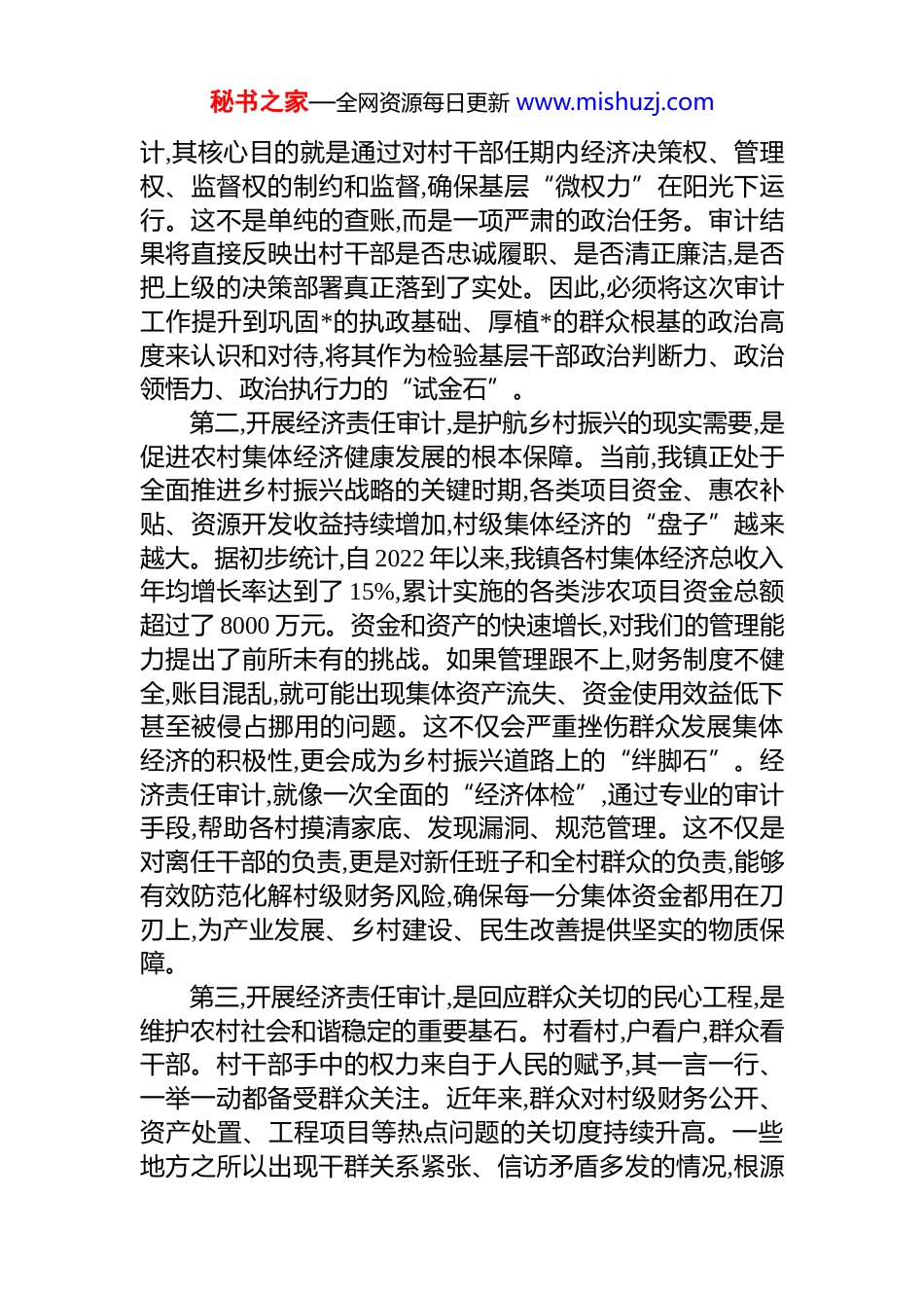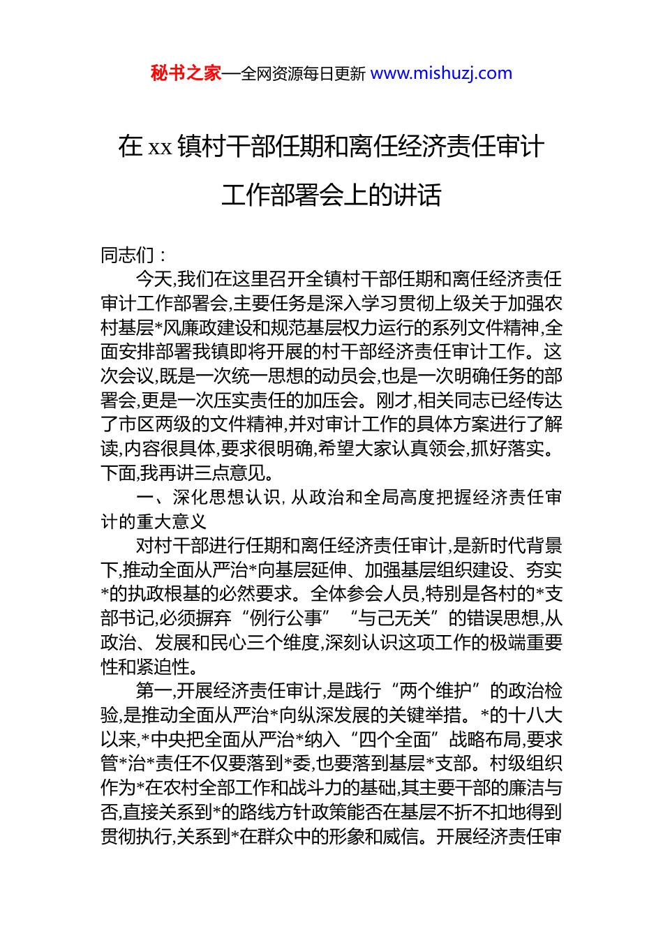 秘书之家—全网资源每日更新 www.mishuzj.com在 xx 镇村干部任期和离任经济责任审计工作部署会上的讲话同志们:今天,我们在这里召开全镇村干部任期和离任经济责任审计工作部署会,主要任务是深入学习贯彻上级关于加强农村基层*风廉政建设和规范基层权力运行的系列文件精神,全面安排部署我镇即将开展的村干部经济责任审计工作。这次会议,既是一次统一思想的动员会,也是一次明确任务的部署会,更是一次压实责任的加压会。刚才,相关同志已经传达了市区两级的文件精神,并对审计工作的具体方案进行了解读,内容很具体,要求很明确,希望大家认真领会,抓好落实。下面,我再讲三点意见。一、深化思想认识,从政治和全局高度把握经济责任审计的重大意义对村干部进行任期和离任经济责任审计,是新时代背景下,推动全面从严治*向基层延伸、加强基层组织建设、夯实*的执政根基的必然要求。全体参会人员,特别是各村的*支部书记,必须摒弃“例行公事”“与己无关”的错误思想,从政治、发展和民心三个维度,深刻认识这项工作的极端重要性和紧迫性。第一,开展经济责任审计,是践行“两个维护”的政治检验,是推动全面从严治*向纵深发展的关键举措。*的十八大以来,*中央把全面从严治*纳入“四个全面”战略布局,要求管*治*责任不仅要落到*委,也要落到基层*支部。村级组织作为*在农村全部工作和战斗力的基础,其主要干部的廉洁与否,直接关系到*的路线方针政策能否在基层不折不扣地得到贯彻执行,关系到*在群众中的形象和威信。开展经济责任审秘书之家—全网资源每日更新 www.mishuzj.com计,其核心目的就是通过对村干部任期内经济决策权、管理权、监督权的制约和监督,确保基层“微权力”在阳光下运行。这不是单纯的查账,而是一项严肃的政治任务。审计结果将直接反映出村干部是否忠诚履职、是否清正廉洁,是否把上级的决策部署真正落到了实处。因此,必须将这次审计工作提升到巩固*的执政基础、厚植*的群众根基的政治高度来认识和对待,将其作为检验基层干部政治判断力、政治领悟力、政治执行力的“试金石”。第二,开展经济责任审计,是护航乡村振兴的现实需要,是促进农村集体经济健康发展的根本保障。当前,我镇正处于全面推进乡村振兴战略的关键时期,各类项目资金、惠农补贴、资源开发收益持续增加,村级集体经济的“盘子”越来越大。据初步统计,自 2022 年以来,我镇各村集体经济总收入年均增长率达到了 15%,累计实施的各类涉农项目资金总额超过了 8000 万元。资金和资产的快速增长,对我们的管理能力提出了前所未有的挑战。如果管理跟不上,财务制度不健全,账目混乱,就可能出现集体资产流失、资金使用效益低下甚至被侵占挪用的问题。这不仅会严重挫伤群众发展集体经济的积极性,更会成为乡村振兴道路上的“绊脚石”。经济责任审计,就像一次全面的“经济体检”,通过专业的审计手段,帮助各村摸清家底、发现漏洞、规范管理。这不仅是对离任干部的负责,更是对新任班子和全村群众的负责,能够有效防范化解村级财务风险,确保每一分集体资金都用在刀刃上,为产业发展、乡村建设、民生改善提供坚实的物质保障。第三,开展经济责任审计,是回应群众关切的民心工程,是维护农村社会和谐稳定的重要基石。村看村,户看户,群众看干部。村干部手中的权力来自于人民的赋予,其一言一行、一举一动都备受群众关注。近年来,群众对村级财务公开、资产处置、工程项目等热点问题的关切度持续升高。一些地方之所以出现干群关系紧张、信访矛盾多发的情况,根源秘书之家—全网资源每日更新 www.mishuzj.com往往就在于村级事务不公开、财务不透明,群众心中有本“糊涂账”。开展经济责任审计,并将审计结果依法依规向全体村民公开,就是要给群众一个“明白账”、一本“放心簿”。这既是保障村民知情权、参与权、监督权的有效形式,也是化解基层矛盾、消除群众疑虑的治本之策。通过审计,让干部在群众的监督下干事,让权力在制度的笼子里运行,清白干事的干部可以卸下包袱、挺直腰杆,心存侥幸的干部能够受到警醒、悬崖勒马。这对于密切*群干群关系,营造风清气正的基层政治生态,维护全镇社会大局的和谐稳定,具有不可替代的重要作用。二、聚焦关键环节,以求真务...