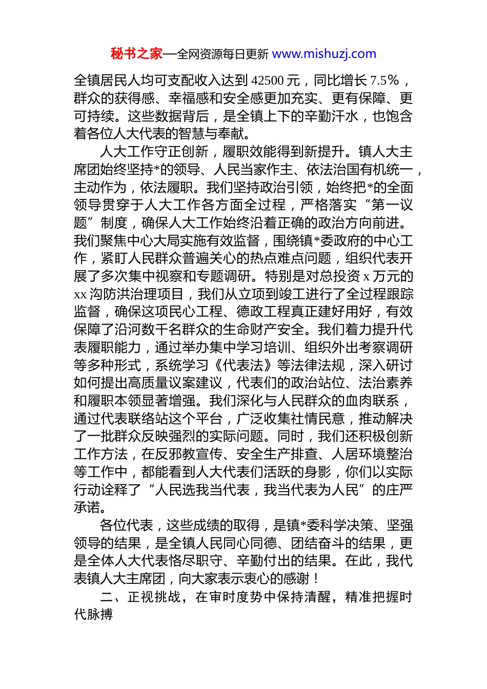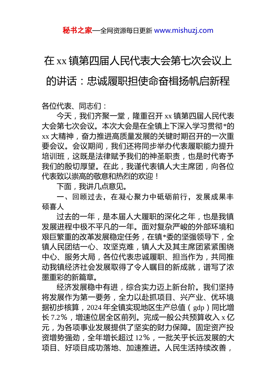 秘书之家—全网资源每日更新 www.mishuzj.com在 xx 镇第四届人民代表大会第七次会议上的讲话:忠诚履职担使命奋楫扬帆启新程各位代表、同志们:今天,我们齐聚一堂,隆重召开 xx 镇第四届人民代表大会第七次会议。本次大会是在全镇上下深入学习贯彻*的xx 大精神,奋力推进高质量发展的关键时期召开的一次重要会议。会议期间,我们还将同步举办代表履职能力提升培训班,这既是法律赋予我们的神圣职责,也是时代寄予我们的殷切厚望。在此,我谨代表镇人大主席团,向各位代表致以崇高的敬意和热烈的欢迎!下面,我讲几点意见。一、回顾过去,在凝心聚力中砥砺前行,发展成果丰硕喜人过去的一年,是本届人大履职的深化之年,也是我镇发展进程中极不平凡的一年。面对复杂严峻的外部环境和艰巨繁重的改革发展稳定任务,在镇*委的坚强领导下,全镇人民团结一心、攻坚克难,镇人大及其主席团紧紧围绕中心、服务大局,各位代表忠诚履职、担当作为,共同推动我镇经济社会发展取得了令人瞩目的新成就,谱写了浓墨重彩的新篇章。经济发展稳中有进,综合实力迈上新台阶。我们坚持将发展作为第一要务,全力以赴抓项目、兴产业、优环境据初步核算,2024 年全镇实现地区生产总值(gdp)同比增长 7.2%,增速位居全区前列。完成一般公共预算收入 x 亿元,为各项事业发展提供了坚实的财力保障。固定资产投资增势强劲,全年增长超过 12%,一批关乎长远发展的大项目、好项目成功落地、加速推进。人民生活持续改善,秘书之家—全网资源每日更新 www.mishuzj.com全镇居民人均可支配收入达到 42500 元,同比增长 7.5%,群众的获得感、幸福感和安全感更加充实、更有保障、更可持续。这些数据背后,是全镇上下的辛勤汗水,也饱含着各位人大代表的智慧与奉献。人大工作守正创新,履职效能得到新提升。镇人大主席团始终坚持*的领导、人民当家作主、依法治国有机统一,主动作为,依法履职。我们坚持政治引领,始终把*的全面领导贯穿于人大工作各方面全过程,严格落实“第一议题”制度,确保人大工作始终沿着正确的政治方向前进。我们聚焦中心大局实施有效监督,围绕镇*委政府的中心工作,紧盯人民群众普遍关心的热点难点问题,组织代表开展了多次集中视察和专题调研。特别是对总投资 x 万元的xx 沟防洪治理项目,我们从立项到竣工进行了全过程跟踪监督,确保这项民心工程、德政工程真正建好用好,有效保障了沿河数千名群众的生命财产安全。我们着力提升代表履职能力,通过举办集中学习培训、组织外出考察调研等多种形式,系统学习《代表法》等法律法规,深入研讨如何提出高质量议案建议,代表们的政治站位、法治素养和履职本领显著增强。我们深化与人民群众的血肉联系,通过代表联络站这个平台,广泛收集社情民意,推动解决了一批群众反映强烈的实际问题。同时,我们还积极创新工作方法,在反邪教宣传、安全生产排查、人居环境整治等工作中,都能看到人大代表们活跃的身影,你们以实际行动诠释了“人民选我当代表,我当代表为人民”的庄严承诺。各位代表,这些成绩的取得,是镇*委科学决策、坚强领导的结果,是全镇人民同心同德、团结奋斗的结果,更是全体人大代表恪尽职守、辛勤付出的结果。在此,我代表镇人大主席团,向大家表示衷心的感谢!二、正视挑战,在审时度势中保持清醒,精准把握时代脉搏秘书之家—全网资源每日更新 www.mishuzj.com在肯定成绩的同时,我们也要清醒地认识到,前进的道路上并非一片坦途。对标高质量发展要求,对照人民群众的新期待,我镇发展仍面临不少矛盾和挑战,人大工作也存在一些需要加强和改进的地方。从发展层面看,高质量发展的根基尚不坚实。一是产业结构优化升级的步伐还不够快。我镇部分传统产业仍以初级加工为主,产品附加值不高,市场竞争力偏弱,在日趋严格的环保和安全标准下,转型升级的压力巨大。二是新旧动能转换的任务依然艰巨。能够支撑未来可持续增长的战略性新兴产业尚未形成规模,高质量项目储备不足,招商引资的“引力场”效应有待增强,一些好项目常因土地、环评等要素制约而难以落地。三是城乡融合发展的深度有待拓展。农业产业化水...