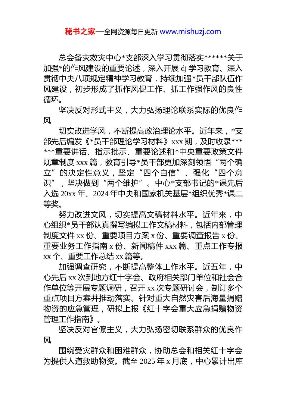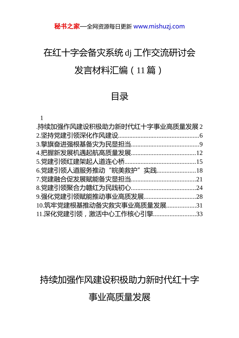 秘书之家—全网资源每日更新 www.mishuzj.com在红十字会备灾系统 dj 工作交流研讨会发言材料汇编(11 篇)目录1.持续加强作风建设积极助力新时代红十字事业高质量发展 22.坚持党建引领深化作风建设..................................................63.擎旗奋进强根基备灾为民显担当..........................................94.把握新发展机遇起航高质量发展........................................125.党建引领红建架起人道连心桥............................................156.党建引领人道服务推动“皖美救护”实践........................187.党建融合促发展赋能备灾显担当........................................218.党建引领聚合力赣红为民践初心........................................249.强化党建引领赋能推动事业高质发展................................2810.筑牢党建根基推动备灾救灾事业高质量发展..................3111.深化党建引领,激活中心工作核心引擎..........................33持续加强作风建设积极助力新时代红十字事业高质量发展秘书之家—全网资源每日更新 www.mishuzj.com总会备灾救灾中心*支部深入学习贯彻落实******关于加强*的作风建设的重要论述,深入开展 dj 学习教育、深入贯彻中央八项规定精神学习教育,持续加强*员干部队伍作风建设,初步形成了抓作风促工作、抓工作强作风的良性循环。坚决反对形式主义,大力弘扬理论联系实际的优良作风切实改进学风,不断提高政治理论水平。近年来,*支部先后编发《*员干部理论学习材料》xxx 期,及时收录******重要讲话、指示批示、重要论述和*中央重要政策文件规章制度 xxx 篇,教育引导*员干部更加深刻领悟“两个确立”的决定性意义,坚定“四个自信”、强化“四个意识”,坚决做到“两个维护”。中心*支部书记的*课先后入选 20xx 年、2024 年中央和国家机关基层*组织优秀*课二等奖。努力改进文风,切实提高文稿材料水平。近年来,中心组织*员干部认真撰写编拟工作文稿材料,包括内部管理制度文件 xx 份、重要项目方案 x 份、重要调查报告 x 份、重要业务工作指南 x 份、新闻稿件 xxx 篇、重点工作专报xx 个、重要工作总结 xx 篇等。加强调查研究,不断提高整体工作水平。近五年,中心先后 xx 次到地方红十字会、政府相关部门单位和社会合作单位等开展专题调研,召开 xx 次专题研讨会,制订多个重点项目方案并推动落实。针对重大自然灾害后海量捐赠物资的应急管理,研拟上报《红十字会重大应急捐赠物资管理工作指南》。坚决反对官僚主义,大力弘扬密切联系群众的优良作风围绕受灾群众和困难群众,协助总会和相关红十字会为提供人道救助物资。截至 2025 年 x 月底,中心累计出库秘书之家—全网资源每日更新 www.mishuzj.com各类救灾救助物资 xx 万多件(套),支持各地红十字会开展应急救援和灾后救助工作,协助总会向 x 个国家红会提供国际人道主义援助。围绕广大社会捐赠人,提供奉献爱心参与红十字事业的便捷渠道。xx.xx 万人次注册使用博爱通系统,捐赠款物总计 xx 万余笔、总价值超过 x.xx 亿元。博爱通热线电话累计接听捐赠人来电超过 xxxx 个,及时帮助解决各类问题超过 xxxx 个。20xx 年,中心*支部申报的“以博爱通捐赠系统为平台积极服务广大社会捐赠人”荣获中央和国家机关基层*组织创新案例三等奖。围绕定点帮扶村困难群众,创新提供相应的人道救助和教育帮扶等服务。近年来,中心为定点帮扶的 xx 县 x 个村累计协调捐赠物资总价值超过 xx 万元、受益群众累计 x.x万人次;组织医疗专家开展健**诊,参加义诊群众超过 xxx人次;组织大学生志愿者开展关爱留守儿童系列活动。2024 年,中心*支部申报的“关爱定点帮扶村留守儿童”项目荣获中央和国家机关基层*组织创新案例三等奖。围绕广大人民群众,积极普及防灾减灾知识和自救互救技能。联合各红十字志愿服务队举办主题活动 x 场、开展防灾减灾知识进校园、进社区、进企业活动 xxx 余场,参与活动的群众超过 x 万人次;中心利用微信公众号发布专题文章 xxx ...