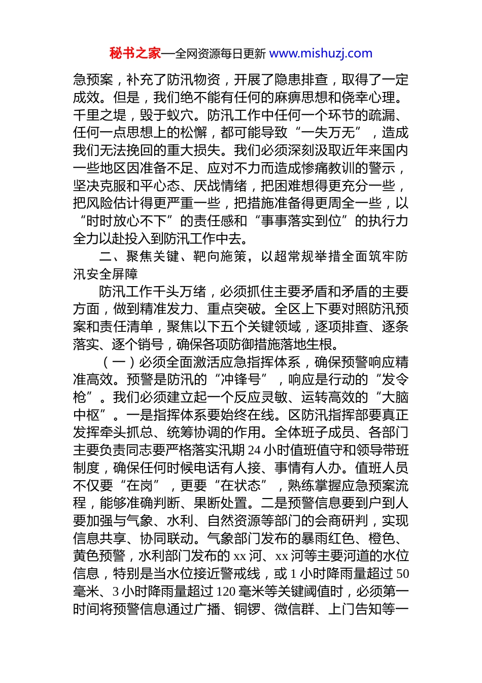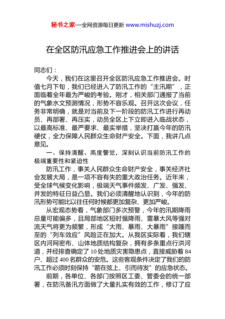 秘书之家—全网资源每日更新 www.mishuzj.com在全区防汛应急工作推进会上的讲话同志们:今天,我们在这里召开全区防汛应急工作推进会。时值七月下旬,我们已经进入了防汛工作的“主汛期”,正面临着全年最为严峻的考验。刚才,相关部门通报了当前的气象水文预测情况,形势不容乐观。召开这次会议,任务非常明确,就是对当前及下一阶段的防汛工作进行再动员、再部署、再压实,动员全区上下立即进入临战状态,以最高标准、最严要求、最实举措,坚决打赢今年的防汛硬仗,全力保障人民群众生命财产安全。下面,我讲几点意见。一、保持清醒、高度警觉,深刻认识当前防汛工作的极端重要性和紧迫性防汛工作,事关人民群众生命财产安全,事关经济社会发展大局,是一项不容有失的重大政治任务。近年来,受全球气候变化影响,极端天气事件频发、广发、强发、并发的特征日益凸显。我们必须清醒地认识到,今年的防汛形势可能比以往任何时候都更加复杂、更加严峻。从宏观态势看,气象部门多次预警,今年的汛期降雨总量可能偏多,且局部地区短时强降雨、雷暴大风等强对流天气将更为频繁,形成“大雨、暴雨、大暴雨”接踵而至的“列车效应”风险正在加大。从我区实际看,我们辖区内河网密布、山体地质结构复杂,拥有多条重点行洪河道,并经排查确定了 10 处地质灾害隐患点,直接威胁着 84户、超过 400 名群众的安危。这些客观条件决定了我们的防汛工作必须时刻保持“箭在弦上、引而待发”的应急状态。前期,各单位、各部门按照区工委、管委会的统一部署,在防汛备汛方面做了大量扎实有效的工作,修订了应秘书之家—全网资源每日更新 www.mishuzj.com急预案,补充了防汛物资,开展了隐患排查,取得了一定成效。但是,我们绝不能有任何的麻痹思想和侥幸心理。千里之堤,毁于蚁穴。防汛工作中任何一个环节的疏漏、任何一点思想上的松懈,都可能导致“一失万无”,造成我们无法挽回的重大损失。我们必须深刻汲取近年来国内一些地区因准备不足、应对不力而造成惨痛教训的警示,坚决克服和平心态、厌战情绪,把困难想得更充分一些,把风险估计得更严重一些,把措施准备得更周全一些,以“时时放心不下”的责任感和“事事落实到位”的执行力全力以赴投入到防汛工作中去。二、聚焦关键、靶向施策,以超常规举措全面筑牢防汛安全屏障防汛工作千头万绪,必须抓住主要矛盾和矛盾的主要方面,做到精准发力、重点突破。全区上下要对照防汛预案和责任清单,聚焦以下五个关键领域,逐项排查、逐条落实、逐个销号,确保各项防御措施落地生根。(一)必须全面激活应急指挥体系,确保预警响应精准高效。预警是防汛的“冲锋号”,响应是行动的“发令枪”。我们必须建立起一个反应灵敏、运转高效的“大脑中枢”。一是指挥体系要始终在线。区防汛指挥部要真正发挥牵头抓总、统筹协调的作用。全体班子成员、各部门主要负责同志要严格落实汛期 24 小时值班值守和领导带班制度,确保任何时候电话有人接、事情有人办。值班人员不仅要“在岗”,更要“在状态”,熟练掌握应急预案流程,能够准确判断、果断处置。二是预警信息要到户到人要加强与气象、水利、自然资源等部门的会商研判,实现信息共享、协同联动。气象部门发布的暴雨红色、橙色、黄色预警,水利部门发布的 xx 河、xx 河等主要河道的水位信息,特别是当水位接近警戒线,或 1 小时降雨量超过 50毫米、3 小时降雨量超过 120 毫米等关键阈值时,必须第一时间将预警信息通过广播、铜锣、微信群、上门告知等一秘书之家—全网资源每日更新 www.mishuzj.com切有效手段,迅速传递到每一位受威胁的群众手中,确保不漏一户、不落一人。三是应急响应要闻令即动。要严格按照应急预案规定的启动条件,一旦接到汛情预警,或工程险情达到启动标准,必须第一时间启动相应级别的应急响应。无论是ⅳ级、ⅲ级还是更高级别的响应,该由哪位指挥长决策、该调动哪些力量、该采取哪些措施,都必须清晰明确、毫不迟疑。坚决杜绝响应不及时、行动迟缓的现象。(二)必须全面深化隐患排查整治,确保风险管控万无一失。隐患险于明火,防范胜于救灾。排查整治工作必须做到...