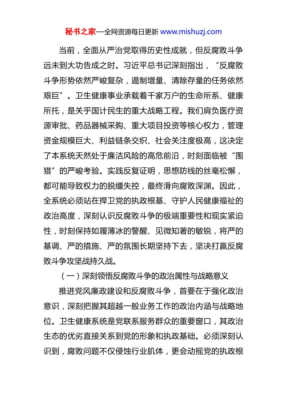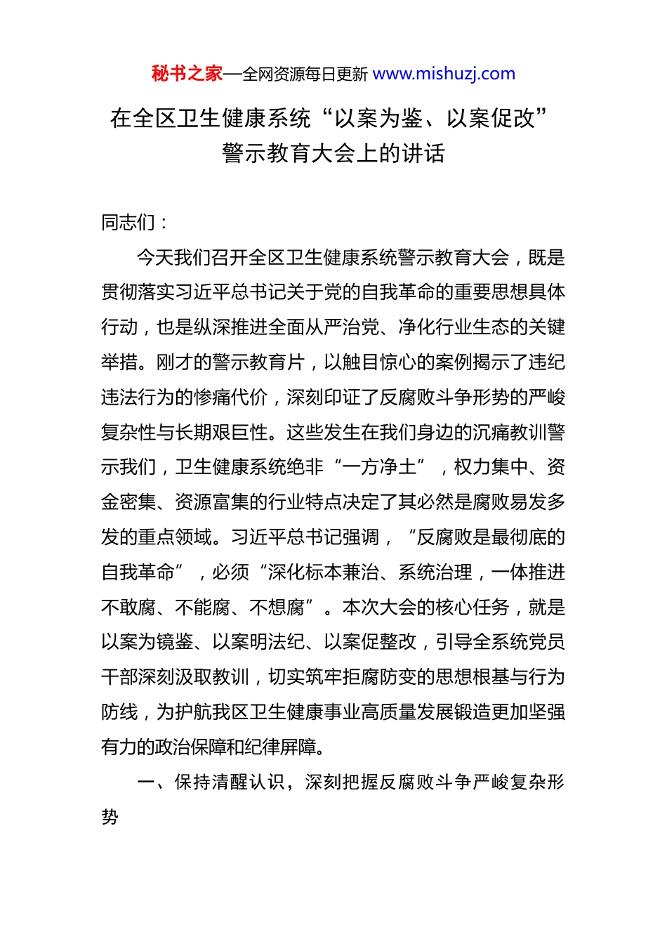 秘书之家—全网资源每日更新 www.mishuzj.com在全区卫生健康系统“以案为鉴、以案促改”警示教育大会上的讲话 同志们:今天我们召开全区卫生健康系统警示教育大会,既是贯彻落实习近平总书记关于党的自我革命的重要思想具体行动,也是纵深推进全面从严治党、净化行业生态的关键举措。刚才的警示教育片,以触目惊心的案例揭示了违纪违法行为的惨痛代价,深刻印证了反腐败斗争形势的严峻复杂性与长期艰巨性。这些发生在我们身边的沉痛教训警示我们,卫生健康系统绝非“一方净土”,权力集中、资金密集、资源富集的行业特点决定了其必然是腐败易发多发的重点领域。习近平总书记强调,“反腐败是最彻底的自我革命”,必须“深化标本兼治、系统治理,一体推进不敢腐、不能腐、不想腐”。本次大会的核心任务,就是以案为镜鉴、以案明法纪、以案促整改,引导全系统党员干部深刻汲取教训,切实筑牢拒腐防变的思想根基与行为防线,为护航我区卫生健康事业高质量发展锻造更加坚强有力的政治保障和纪律屏障。一、保持清醒认识,深刻把握反腐败斗争严峻复杂形势秘书之家—全网资源每日更新 www.mishuzj.com当前,全面从严治党取得历史性成就,但反腐败斗争远未到大功告成之时。习近平总书记深刻指出,“反腐败斗争形势依然严峻复杂,遏制增量、清除存量的任务依然艰巨”。卫生健康事业承载着千家万户的生命所系、健康所托,是关乎国计民生的重大战略工程。我们肩负医疗资源审批、药品器械采购、重大项目投资等核心权力,管理资金规模巨大、利益链条交织、社会关注度极高,这决定了本系统天然处于廉洁风险的高危前沿,时刻面临被“围猎”的严峻考验。实践反复证明,思想防线的丝毫松懈,都可能导致权力的脱缰失控,最终滑向腐败深渊。因此,全系统必须站在捍卫党的执政根基、守护人民健康福祉的政治高度,深刻认识反腐败斗争的极端重要性和现实紧迫性,时刻保持如履薄冰的警醒、见微知著的敏锐,将严的基调、严的措施、严的氛围长期坚持下去,坚决打赢反腐败斗争攻坚战持久战。(一)深刻领悟反腐败斗争的政治属性与战略意义推进党风廉政建设和反腐败斗争,首要在于强化政治意识,深刻把握其超越一般业务工作的政治内涵与战略地位。卫生健康系统是党联系服务群众的重要窗口,其政治生态的优劣直接关系到党的形象和执政基础。必须深刻认识到,腐败问题不仅侵蚀行业肌体,更会动摇党的执政根秘书之家—全网资源每日更新 www.mishuzj.com基、割裂党同人民群众的血肉联系。因此,必须将反腐败斗争置于维护党的长期执政能力、先进性和纯洁性的战略全局性谋划推进。要将政治建设摆在首位,教育引导广大党员干部深刻领悟“两个确立”的决定性意义,增强“四个意识”、坚定“四个自信”、做到“两个维护”,始终在政治立场、政治方向、政治原则、政治道路上同党中央保持高度一致。要严明政治纪律和政治规矩,坚决防止“七个有之”,彻底肃清搞政治团伙、拉帮结派等行为对系统政治生态的污染,确保党中央关于卫生健康工作的各项决策部署不折不扣落地生根。必须将政治标准和政治要求贯穿于系统内干部选拔任用、日常管理监督、考核评价激励的全过程,锻造一支政治上绝对可靠、对党绝对忠诚的卫生健康铁军。(二)精准研判卫生健康领域腐败风险的独特性与复杂性卫生健康领域的腐败问题呈现出区别于其他领域的鲜明特征和复杂样态,要求我们必须精准识别、科学应对。其独特性首先体现在权力寻租空间的多元性上:药品耗材带量采购、大型医疗设备配置许可、基建工程项目招标、医保基金支付审核、科研经费管理使用、人事招聘与职称评聘等关键环节,均存在制度缝隙和操作弹性,为利益输秘书之家—全网资源每日更新 www.mishuzj.com送提供了可能。其次,腐败手段的隐蔽性与专业性日益增强,如利用信息不对称进行“定制式”招标、通过“科研合作”“学术赞助”等名义掩盖利益输送、借助第三方服务机构进行“洗钱”式套取资金等,使得发现和查处难度加大。再次,腐败主体呈现“关键少数”与“微权力”并存的特点,既涉及掌握重大决策权的领导干部,也涉及具体经办重要业务的普通岗位人员,“小官巨贪”和系统性腐...