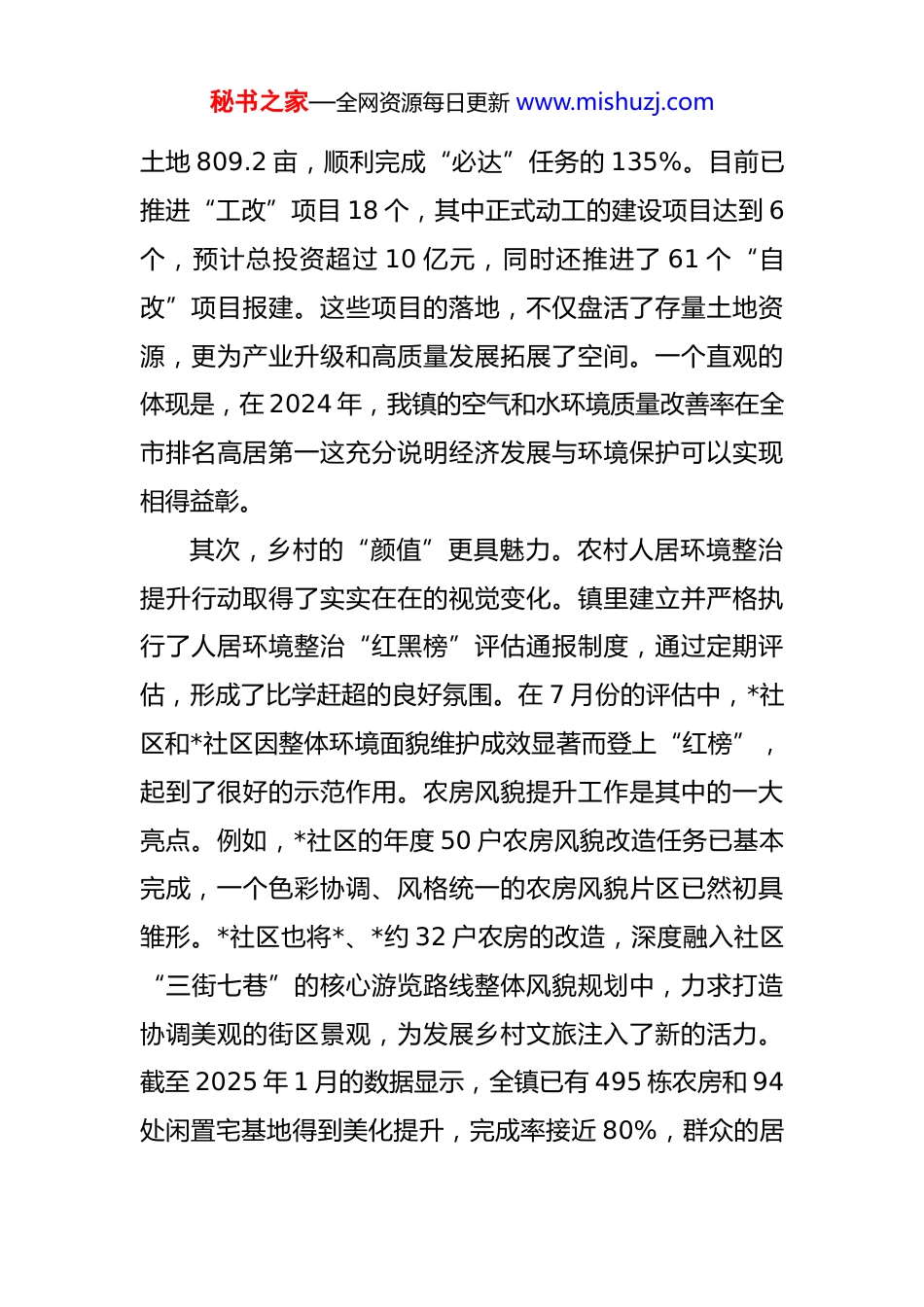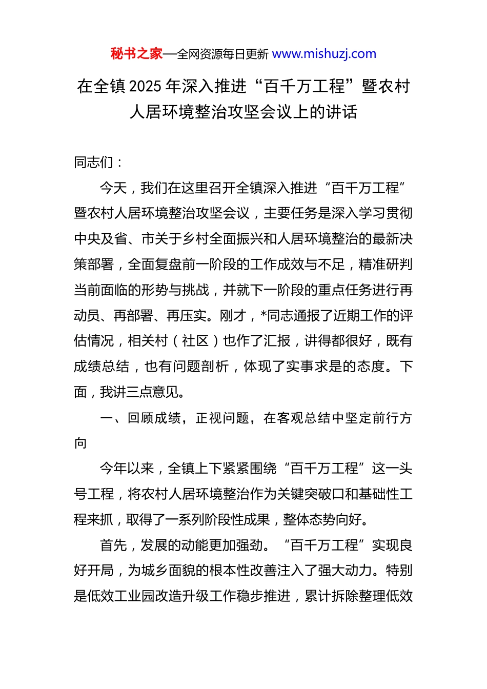 秘书之家—全网资源每日更新 www.mishuzj.com在全镇 2025 年深入推进“百千万工程”暨农村人居环境整治攻坚会议上的讲话 同志们:今天,我们在这里召开全镇深入推进“百千万工程”暨农村人居环境整治攻坚会议,主要任务是深入学习贯彻中央及省、市关于乡村全面振兴和人居环境整治的最新决策部署,全面复盘前一阶段的工作成效与不足,精准研判当前面临的形势与挑战,并就下一阶段的重点任务进行再动员、再部署、再压实。刚才,*同志通报了近期工作的评估情况,相关村(社区)也作了汇报,讲得都很好,既有成绩总结,也有问题剖析,体现了实事求是的态度。下面,我讲三点意见。一、回顾成绩,正视问题,在客观总结中坚定前行方向今年以来,全镇上下紧紧围绕“百千万工程”这一头号工程,将农村人居环境整治作为关键突破口和基础性工程来抓,取得了一系列阶段性成果,整体态势向好。首先,发展的动能更加强劲。“百千万工程”实现良好开局,为城乡面貌的根本性改善注入了强大动力。特别是低效工业园改造升级工作稳步推进,累计拆除整理低效秘书之家—全网资源每日更新 www.mishuzj.com土地 809.2 亩,顺利完成“必达”任务的 135%。目前已推进“工改”项目 18 个,其中正式动工的建设项目达到 6个,预计总投资超过 10 亿元,同时还推进了 61 个“自改”项目报建。这些项目的落地,不仅盘活了存量土地资源,更为产业升级和高质量发展拓展了空间。一个直观的体现是,在 2024 年,我镇的空气和水环境质量改善率在全市排名高居第一这充分说明经济发展与环境保护可以实现相得益彰。其次,乡村的“颜值”更具魅力。农村人居环境整治提升行动取得了实实在在的视觉变化。镇里建立并严格执行了人居环境整治“红黑榜”评估通报制度,通过定期评估,形成了比学赶超的良好氛围。在 7 月份的评估中,*社区和*社区因整体环境面貌维护成效显著而登上“红榜”,起到了很好的示范作用。农房风貌提升工作是其中的一大亮点。例如,*社区的年度 50 户农房风貌改造任务已基本完成,一个色彩协调、风格统一的农房风貌片区已然初具雏形。*社区也将*、*约 32 户农房的改造,深度融入社区“三街七巷”的核心游览路线整体风貌规划中,力求打造协调美观的街区景观,为发展乡村文旅注入了新的活力。截至 2025 年 1 月的数据显示,全镇已有 495 栋农房和 94处闲置宅基地得到美化提升,完成率接近 80%,群众的居秘书之家—全网资源每日更新 www.mishuzj.com住体验和乡村的整体形象都得到了显著提升。再次,治理的效能更显扎实。面对今年严峻的登革热、基孔肯雅热等蚊媒传染病防控形势,镇里迅速反应,将人居环境整治与疫情防控工作紧密结合,展现了强大的应急动员和协同作战能力。通过深化“村庄清洁日”活动,依托“镇统筹、村落实、驻村组参与”的机制,对房前屋后的卫生死角、积水容器进行地毯式清理,真正做到了“翻盆倒罐清积水”,从源头上铲除蚊虫滋生环境。同时,强化了对农村公厕、污水管道等重点区域的药物消杀,并创新性地邀请专业合作社,运用无人机对公共区域实施高效精准的药剂喷施,覆盖面积超 100 亩,有效控制了成蚊密度。自今年 1 月以来,所有村(社区)均被纳入布雷图指数动态监测范围,已累计开展 19 次监测,覆盖970 户居民为科学防控提供了精确的数据支撑。这种平战结合的治理模式,不仅筑牢了人民群众的健康防线,也全面检验和提升了基层治理的精细化水平。在肯定成绩的同时,更要清醒地看到存在的短板与不足。从刚才的通报中可以看出,我们的工作还存在明显的不平衡性。*社区和*社区因环境问题点位整改进度滞后被列入“黑榜”,这敲响了警钟。这背后反映出一些深层次问题:一是思想认识存在温差。部分干部对农村人居环境秘书之家—全网资源每日更新 www.mishuzj.com整治的长期性、艰巨性认识不足,存在“一阵风”思想,工作时紧时松,缺乏钉钉子精神。二是工作标准存在落差。有的地方满足于“扫干净、摆整齐”的初级阶段,对标上级要求和先进地区经验,在风貌管控、内涵提升、文化植入等方面思考不深、行动不快。三是责任落实存在偏差。“上面九级...