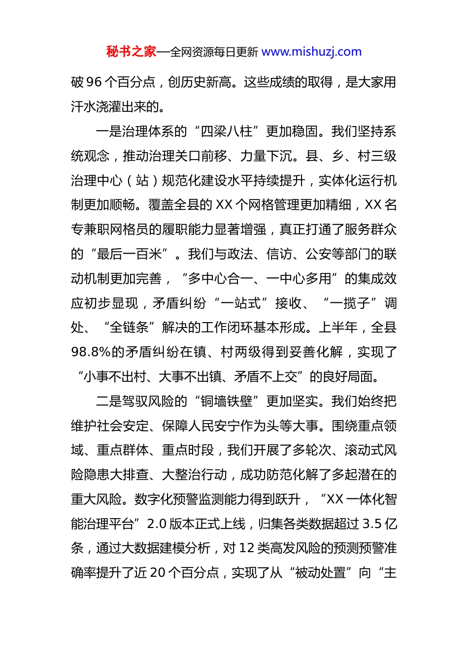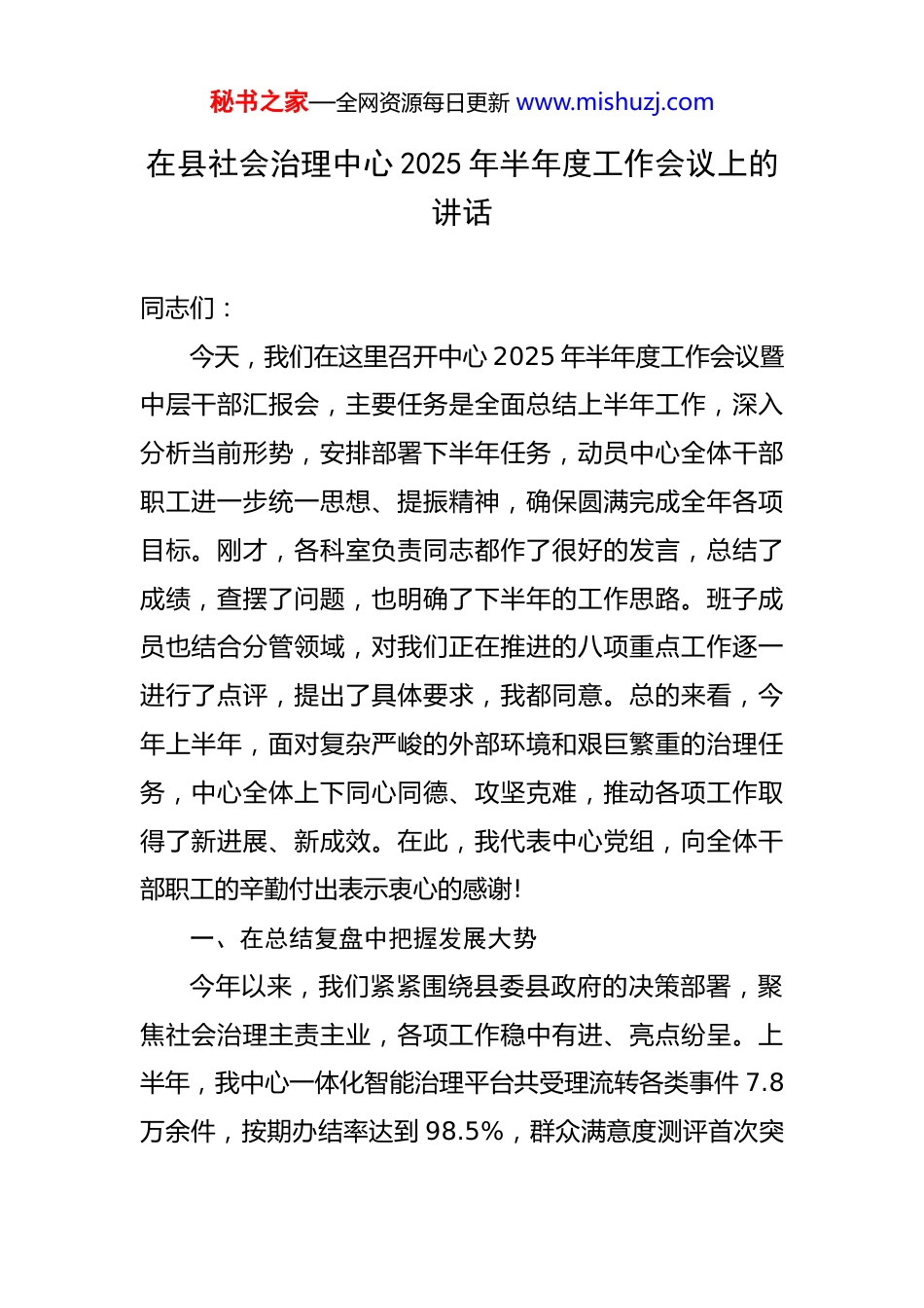 秘书之家—全网资源每日更新 www.mishuzj.com在县社会治理中心 2025 年半年度工作会议上的讲话 同志们:今天,我们在这里召开中心 2025 年半年度工作会议暨中层干部汇报会,主要任务是全面总结上半年工作,深入分析当前形势,安排部署下半年任务,动员中心全体干部职工进一步统一思想、提振精神,确保圆满完成全年各项目标。刚才,各科室负责同志都作了很好的发言,总结了成绩,查摆了问题,也明确了下半年的工作思路。班子成员也结合分管领域,对我们正在推进的八项重点工作逐一进行了点评,提出了具体要求,我都同意。总的来看,今年上半年,面对复杂严峻的外部环境和艰巨繁重的治理任务,中心全体上下同心同德、攻坚克难,推动各项工作取得了新进展、新成效。在此,我代表中心党组,向全体干部职工的辛勤付出表示衷心的感谢!一、在总结复盘中把握发展大势今年以来,我们紧紧围绕县委县政府的决策部署,聚焦社会治理主责主业,各项工作稳中有进、亮点纷呈。上半年,我中心一体化智能治理平台共受理流转各类事件 7.8万余件,按期办结率达到 98.5%,群众满意度测评首次突秘书之家—全网资源每日更新 www.mishuzj.com破 96 个百分点,创历史新高。这些成绩的取得,是大家用汗水浇灌出来的。一是治理体系的“四梁八柱”更加稳固。我们坚持系统观念,推动治理关口前移、力量下沉。县、乡、村三级治理中心(站)规范化建设水平持续提升,实体化运行机制更加顺畅。覆盖全县的 XX 个网格管理更加精细,XX 名专兼职网格员的履职能力显著增强,真正打通了服务群众的“最后一百米”。我们与政法、信访、公安等部门的联动机制更加完善,“多中心合一、一中心多用”的集成效应初步显现,矛盾纠纷“一站式”接收、“一揽子”调处、“全链条”解决的工作闭环基本形成。上半年,全县98.8%的矛盾纠纷在镇、村两级得到妥善化解,实现了“小事不出村、大事不出镇、矛盾不上交”的良好局面。二是驾驭风险的“铜墙铁壁”更加坚实。我们始终把维护社会安定、保障人民安宁作为头等大事。围绕重点领域、重点群体、重点时段,我们开展了多轮次、滚动式风险隐患大排查、大整治行动,成功防范化解了多起潜在的重大风险。数字化预警监测能力得到跃升,“XX 一体化智能治理平台”2.0 版本正式上线,归集各类数据超过 3.5 亿条,通过大数据建模分析,对 12 类高发风险的预测预警准确率提升了近 20 个百分点,实现了从“被动处置”向“主秘书之家—全网资源每日更新 www.mishuzj.com动发现”的根本性转变。三是服务发展的“治理效能”更加彰显。我们主动将社会治理工作融入全县经济社会发展大局。在护航重大项目建设上,我们提前介入,成功调处了因 XX 高速公路建设、XX 工业园区扩建等引发的征地拆迁、劳资关系等纠纷150 余起,保障了项目顺利推进。在优化营商环境上,我们设立了企业服务专窗,为企业提供政策咨询、风险评估等“一站式”服务,营造了安商、亲商的良好环境。在肯定成绩的同时,我们更要清醒地看到工作中存在的短板与不足。这些问题如果不能有效解决,必将成为我们前进道路上的“绊脚石”。一是协同联动的壁垒依然存在。内部协同上,“分工如分家”的现象还未彻底根除,科室之间信息共享不及时、工作衔接不顺畅的问题时有发生,削弱了工作合力。外部联动上,与部分单位的“数据壁垒”尚未完全打破,“信息孤岛”依然存在,导致我们在处理一些跨部门、跨领域的复杂问题时,仍然感到力不从心。对乡镇(街道)综治中心的指导赋能力度也有待加强,压力传导和责任落实存在“中梗阻”现象。二是改革创新的锐气有所减弱。一些同志习惯于“路径依赖”,满足于“按部就班”,面对新形势新挑战,思秘书之家—全网资源每日更新 www.mishuzj.com想不够解放,办法不够新颖。比如,在运用人工智能、区块链等新技术赋能社会治理方面,我们的探索还停留在浅层次,缺乏能够“一鸣惊人”、可在全省乃至全国推广的标志性创新成果。总结提炼工作做得不够,很多好的做法和经验没有及时转化为制度性、理论性成果。三是队伍建设的标准仍需提高。少数干部存在精神懈怠的倾向,表现出“躺平主...