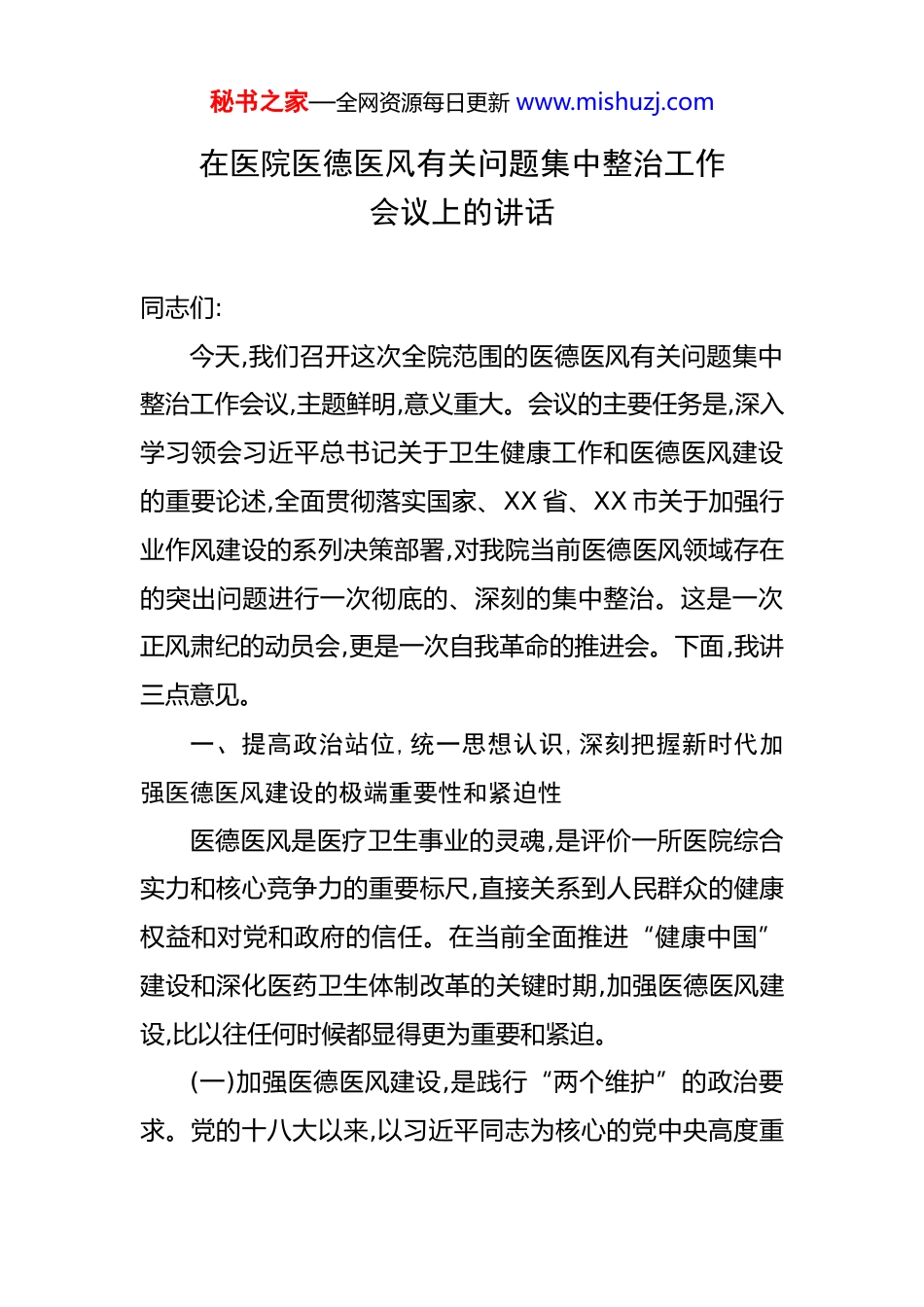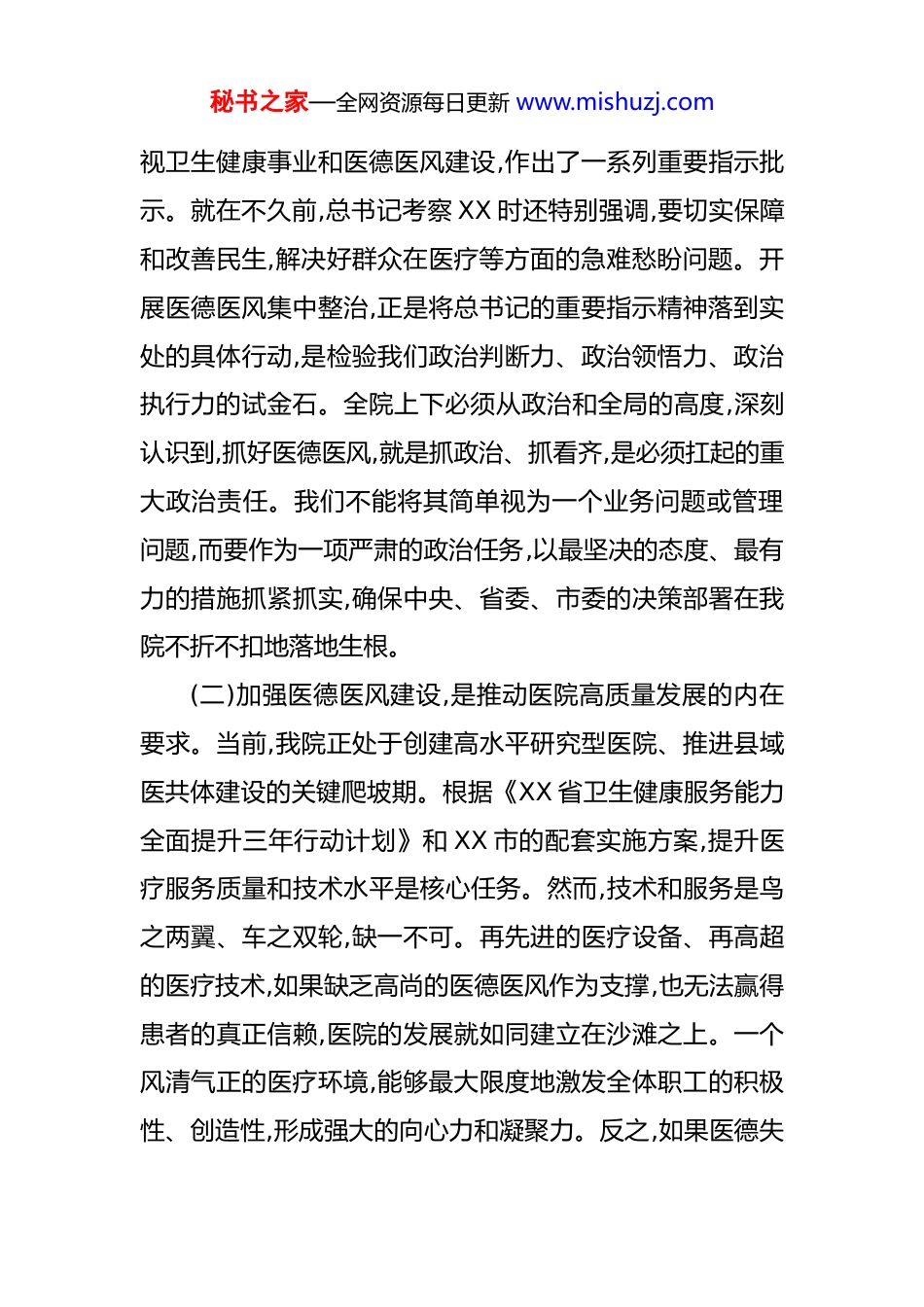 秘书之家—全网资源每日更新 www.mishuzj.com在医院医德医风有关问题集中整治工作会议上的讲话 同志们:今天,我们召开这次全院范围的医德医风有关问题集中整治工作会议,主题鲜明,意义重大。会议的主要任务是,深入学习领会习近平总书记关于卫生健康工作和医德医风建设的重要论述,全面贯彻落实国家、XX 省、XX 市关于加强行业作风建设的系列决策部署,对我院当前医德医风领域存在的突出问题进行一次彻底的、深刻的集中整治。这是一次正风肃纪的动员会,更是一次自我革命的推进会。下面,我讲三点意见。一、提高政治站位,统一思想认识,深刻把握新时代加强医德医风建设的极端重要性和紧迫性医德医风是医疗卫生事业的灵魂,是评价一所医院综合实力和核心竞争力的重要标尺,直接关系到人民群众的健康权益和对党和政府的信任。在当前全面推进“健康中国”建设和深化医药卫生体制改革的关键时期,加强医德医风建设,比以往任何时候都显得更为重要和紧迫。(一)加强医德医风建设,是践行“两个维护”的政治要求。党的十八大以来,以习近平同志为核心的党中央高度重秘书之家—全网资源每日更新 www.mishuzj.com视卫生健康事业和医德医风建设,作出了一系列重要指示批示。就在不久前,总书记考察 XX 时还特别强调,要切实保障和改善民生,解决好群众在医疗等方面的急难愁盼问题。开展医德医风集中整治,正是将总书记的重要指示精神落到实处的具体行动,是检验我们政治判断力、政治领悟力、政治执行力的试金石。全院上下必须从政治和全局的高度,深刻认识到,抓好医德医风,就是抓政治、抓看齐,是必须扛起的重大政治责任。我们不能将其简单视为一个业务问题或管理问题,而要作为一项严肃的政治任务,以最坚决的态度、最有力的措施抓紧抓实,确保中央、省委、市委的决策部署在我院不折不扣地落地生根。(二)加强医德医风建设,是推动医院高质量发展的内在要求。当前,我院正处于创建高水平研究型医院、推进县域医共体建设的关键爬坡期。根据《XX 省卫生健康服务能力全面提升三年行动计划》和 XX 市的配套实施方案,提升医疗服务质量和技术水平是核心任务。然而,技术和服务是鸟之两翼、车之双轮,缺一不可。再先进的医疗设备、再高超的医疗技术,如果缺乏高尚的医德医风作为支撑,也无法赢得患者的真正信赖,医院的发展就如同建立在沙滩之上。一个风清气正的医疗环境,能够最大限度地激发全体职工的积极性、创造性,形成强大的向心力和凝聚力。反之,如果医德失秘书之家—全网资源每日更新 www.mishuzj.com范、行风不正等问题滋生蔓延,不仅会侵蚀医院的社会声誉,更会动摇医院长远发展的根基,所有高质量发展的目标都将成为空谈。(三)加强医德医风建设,是回应人民群众新期待的迫切需要。随着经济社会发展和人民生活水平的提高,人民群众对健康的需求已经从“看得上病、看得好病”向“看得舒心、服务温馨”转变。患者在寻求医疗服务时,不仅关注治疗效果,也同样关注服务态度、就医体验和人格尊严。近年来,从门诊到住院,从检查到治疗,一些环节的服务短板和作风问题,已经成为影响医患关系、引发社会舆情的热点和焦点。这些问题虽然发生在少数人身上,但其负面影响却会波及整个医务人员群体,损害我们来之不易的集体形象。全院职工必须清醒地认识到,人民群众的满意度是检验我们工作的最终标准。我们必须主动顺应群众的新期待,以刮骨疗毒的勇气直面问题,以实实在在的整改成效取信于民,努力构建和谐、信任、良性互动的医患关系,让人民群众的就医获得感、幸福感、安全感更加充实、更有保障、更可持续。二、坚持问题导向,敢于刀刃向内,精准查摆和深刻剖析当前存在的突出矛盾与风险隐患成绩不说跑不了,问题不讲不得了。近年来,我院在提升医疗质量、改善服务流程等方面做了大量工作,主流是好秘书之家—全网资源每日更新 www.mishuzj.com的。但是,我们必须保持清醒的头脑,用“放大镜”审视自身,深刻认识到在医德医风方面依然存在不容忽视的问题和短板。对照上级明确的整治重点和相关要求,结合日常监督、信访投诉和舆情反映,我认为,以下几个方面的问题需要我们高度警惕、深入查摆。(一)服务意识淡漠,“冷硬横推”现象仍未根绝。有的同志服...