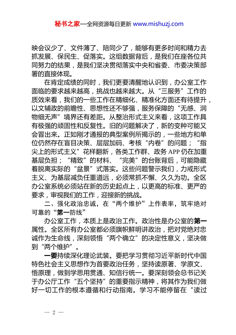 秘书之家—全网资源每日更新 www.mishuzj.com在区工委整治形式主义为基层减负专项工作机制会议上的讲话同志们:今天,区工委决定召开这次全区办公室主任工作会议暨区工委整治形式主义为基层减负专项工作机制会议,主要任务是深入学习贯彻习近平总书记关于办公厅工作和力戒形式主义官僚主义的重要指示批示精神,传达学习全国和省、市有关会议精神,总结我区上半年工作,分析当前形势,并对下一阶段重点任务进行动员和部署。刚才,会议书面通报了上半年全区整治形式主义为基层减负的重点任务推进情况,传达了上级一系列重要会议精神和典型案例通报,大家要认真学习领会,关键要结合各自实际,坚决抓好贯彻落实。下面,我讲四点意见。一、肯定成绩、正视问题,清醒认识新形势下办公室工作的使命与挑战今年以来,全区办公室系统全体同志紧紧围绕区工委、区管委的中心工作,忠诚履职、默默奉献,在参谋辅政、统筹协调、督查落实、服务保障等各条战线上,展现了过硬的政治素质和业务能力,为全区经济社会高质量发展提供了坚实有力的保障。大家的工作是繁杂的、辛苦的,但也是重要的、富有成效的。在此,我代表区工委、区管委,向全区办公室系统的每一位同志,致以诚挚的问候和衷心的感谢!特别是在整治形式主义为基层减负这项重点工作上,我们取得了阶段性的显著成效。根据上半年的通报情况,我们欣喜地看到,一些长期困扰基层的顽疾正在被逐步破解。上半年,全区性会议数量、印发文件数量同比分别下降了 35%和 40%,各类督查检查考核事项统筹压减了 50%以上,基层单位普遍反— 1 —秘书之家—全网资源每日更新 www.mishuzj.com映会议少了、文件薄了、陪同少了,能够有更多时间和精力去抓发展、保民生、促落实。这组数据背后,是我们在座各位共同努力的结果,是我们坚决贯彻落实中央和省委、市委决策部署的直接体现。在肯定成绩的同时,我们更要清醒地认识到,办公室工作面临的要求越来越高,挑战也越来越大。从“三服务”工作的质效来看,我们的一些工作在精细化、精准化方面还有待提升,以文辅政的前瞻性、思想性还不够强,服务保障的“无感、润物细无声”境界还有差距。从整治形式主义来看,这项工作具有极强的顽固性和反复性。旧的问题解决了,新的变种可能又会冒出来。正如刚才通报的典型案例所揭示的,一些地方和单位仍然存在盲目决策、层层加码、考核“内卷”的问题;“指尖上的形式主义”花样翻新,各类工作群、政务 APP 仍在加重基层负担;“精致”的材料、“完美”的台账背后,可能隐藏着脱离实际的“盆景”式落实。这些问题警示我们,力戒形式主义、为基层减负任重道远,必须常抓不懈、久久为功。全区办公室系统必须站在新的历史起点上,以更高的标准、更严的要求,审视我们的工作,迎接新的挑战。二、强化政治忠诚,在“两个维护”上作表率,筑牢绝对可靠的“第一防线”办公室工作,本质上是政治工作。政治性是办公室的第一属性。全区所有办公室都必须旗帜鲜明讲政治,把对党绝对忠诚作为生命线,深刻领悟“两个确立”的决定性意义,坚决做到“两个维护”。一要持续深化理论武装。要把学习贯彻习近平新时代中国特色社会主义思想作为首要政治任务,坚持读原著、学原文、悟原理,做到学思用贯通、知信行统一。要深刻领会总书记关于办公厅工作“五个坚持”的重要指示精神,将其作为我们做好一切工作的根本遵循和行动指南。学习不能停留在“读过— 2 —秘书之家—全网资源每日更新 www.mishuzj.com了”“学过了”,而要真正做到“想透了”“干实了”,要善于从党的创新理论中找思路、找方法、找答案,切实提高我们的政治判断力、政治领悟力、政治执行力。二要坚决落实党的全面领导。办公室是贯彻落实党中央和上级党委决策部署的“最先一公里”,也是确保政令畅通的“中枢神经”。我们必须时刻对标对表,确保区工委、区管委的各项工作部署,不折不扣地得到落实,任何时候、任何情况下都不能有偏差、不能搞变通、不能打折扣。要建立健全闭环管理机制,对重要决策、重点工作,要一竿子插到底,跟踪问效,确保事事有回音、件件有着落。三要切实发挥政治把关作用。办公室是...
